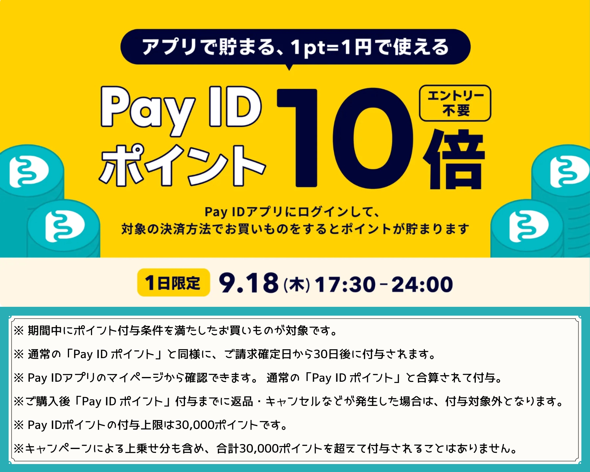 「Pay ID ポイント」の付与上限は、30,000ポイントです。