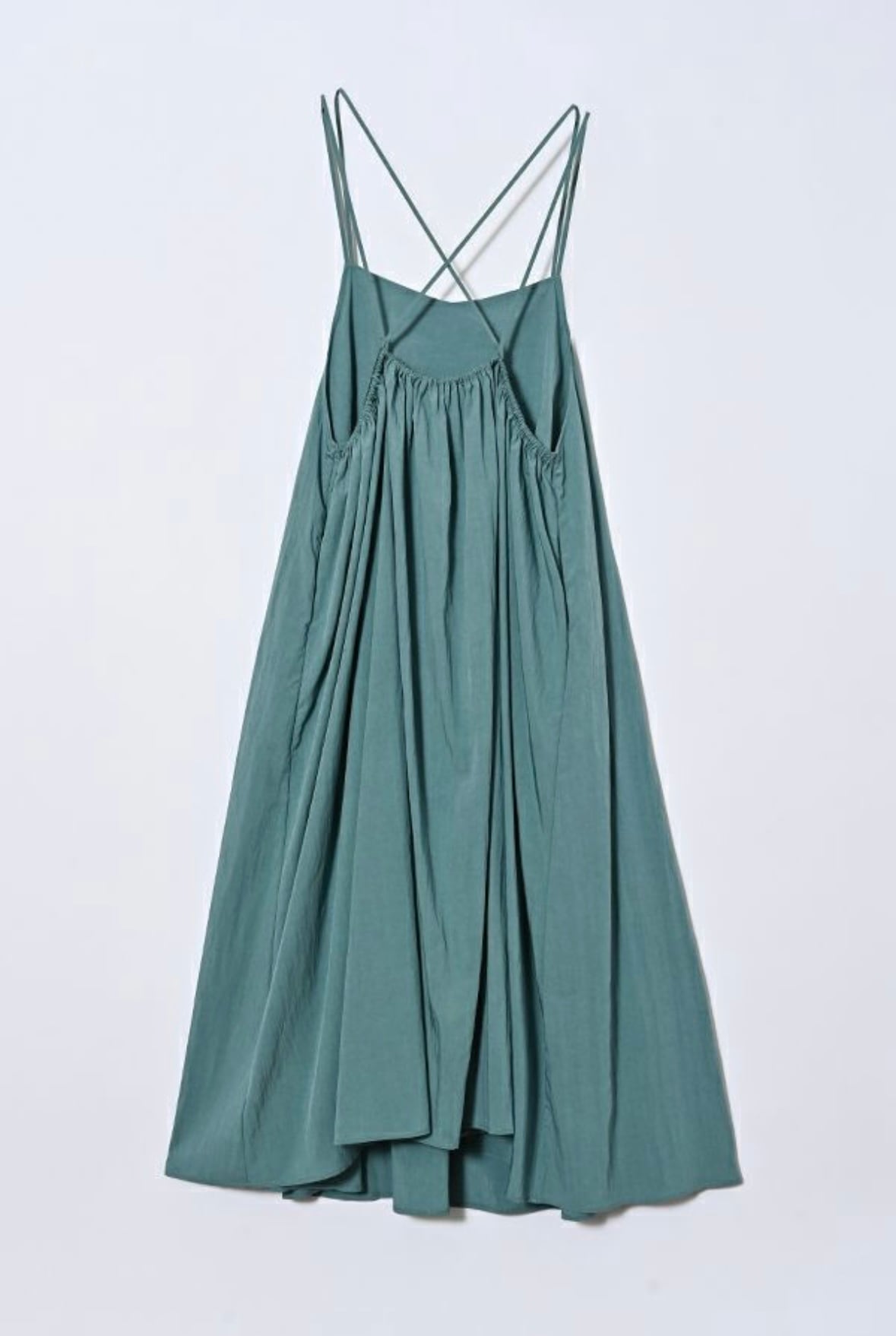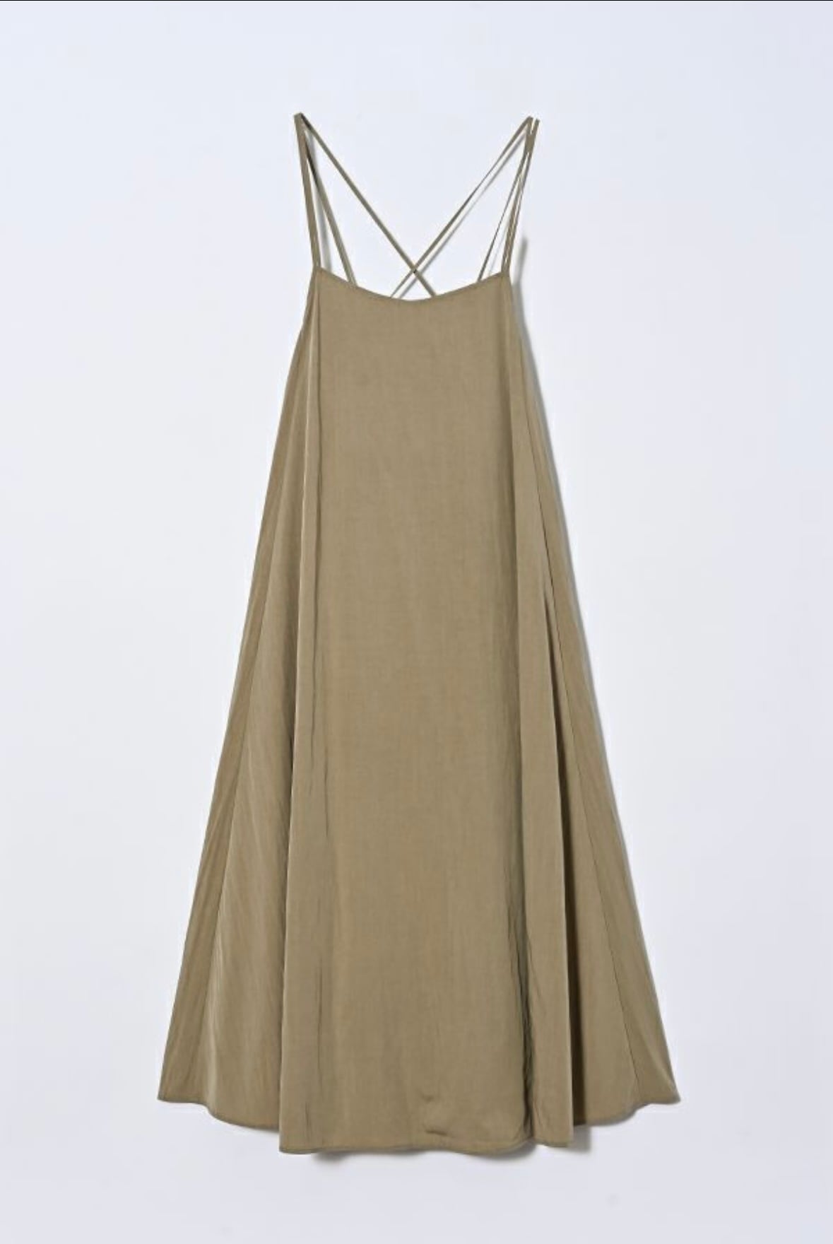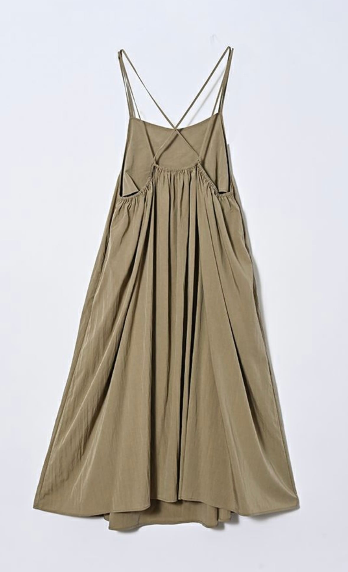 蹴回し(裾回り寸)をたっぷりとった贅沢なフレアシルエットで、体のラインを拾わずストレスフリーな着心地です。華奢なストラップでワンピースの丈が2段階調節出来る仕様になっているのも嬉しいポイント。後ろ姿も抜かりなく、女性らしい印象を醸し出してくれます。