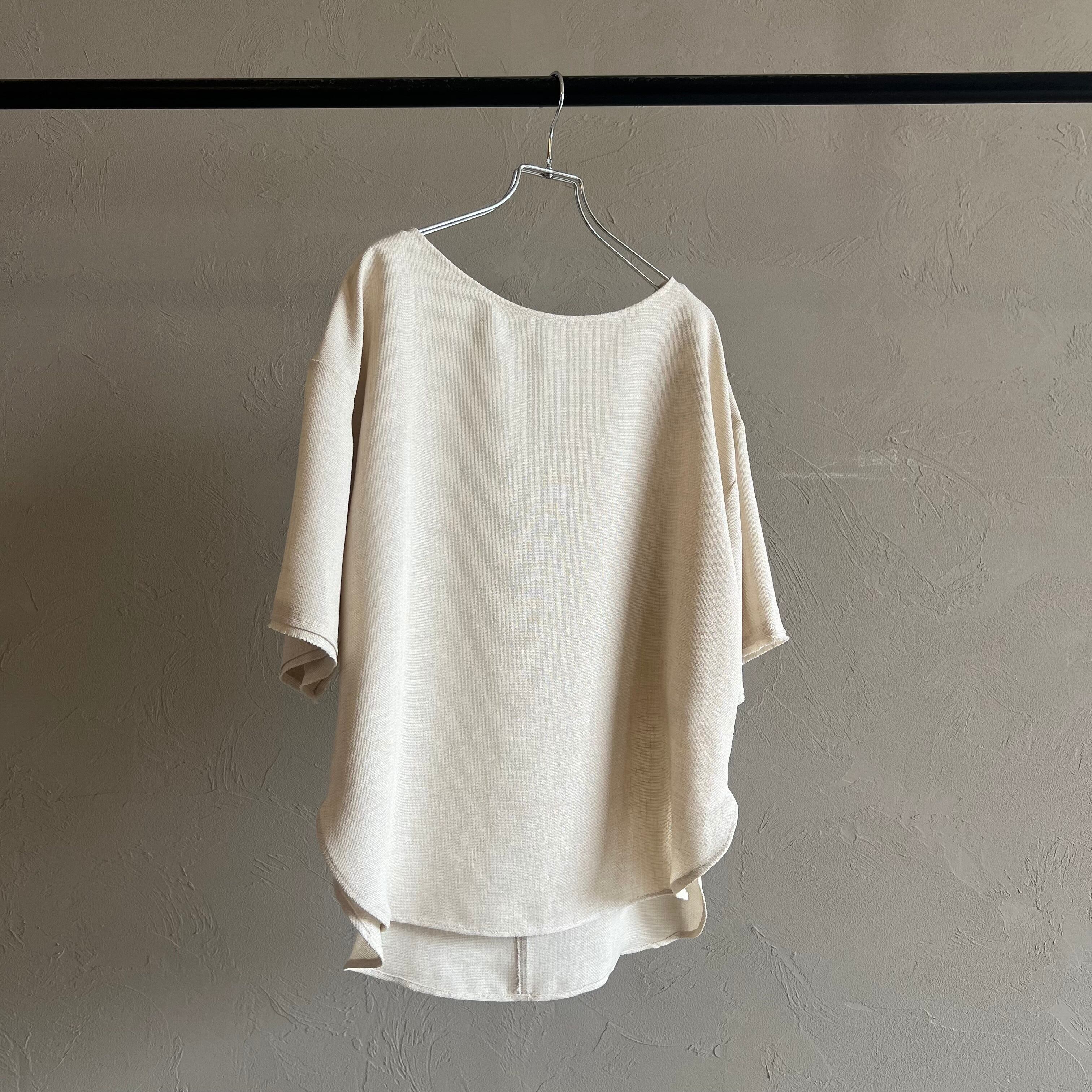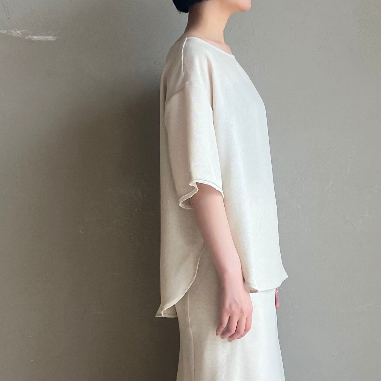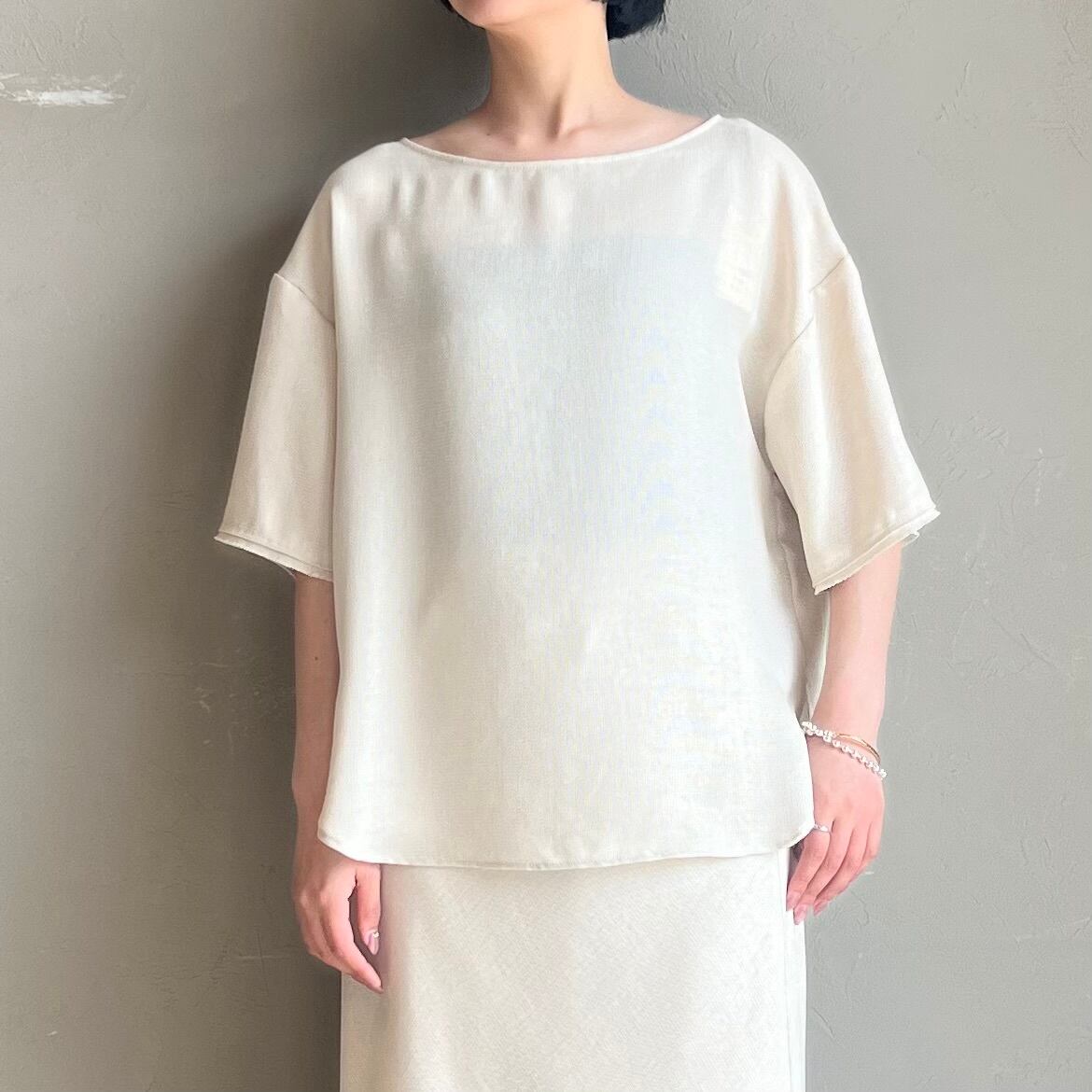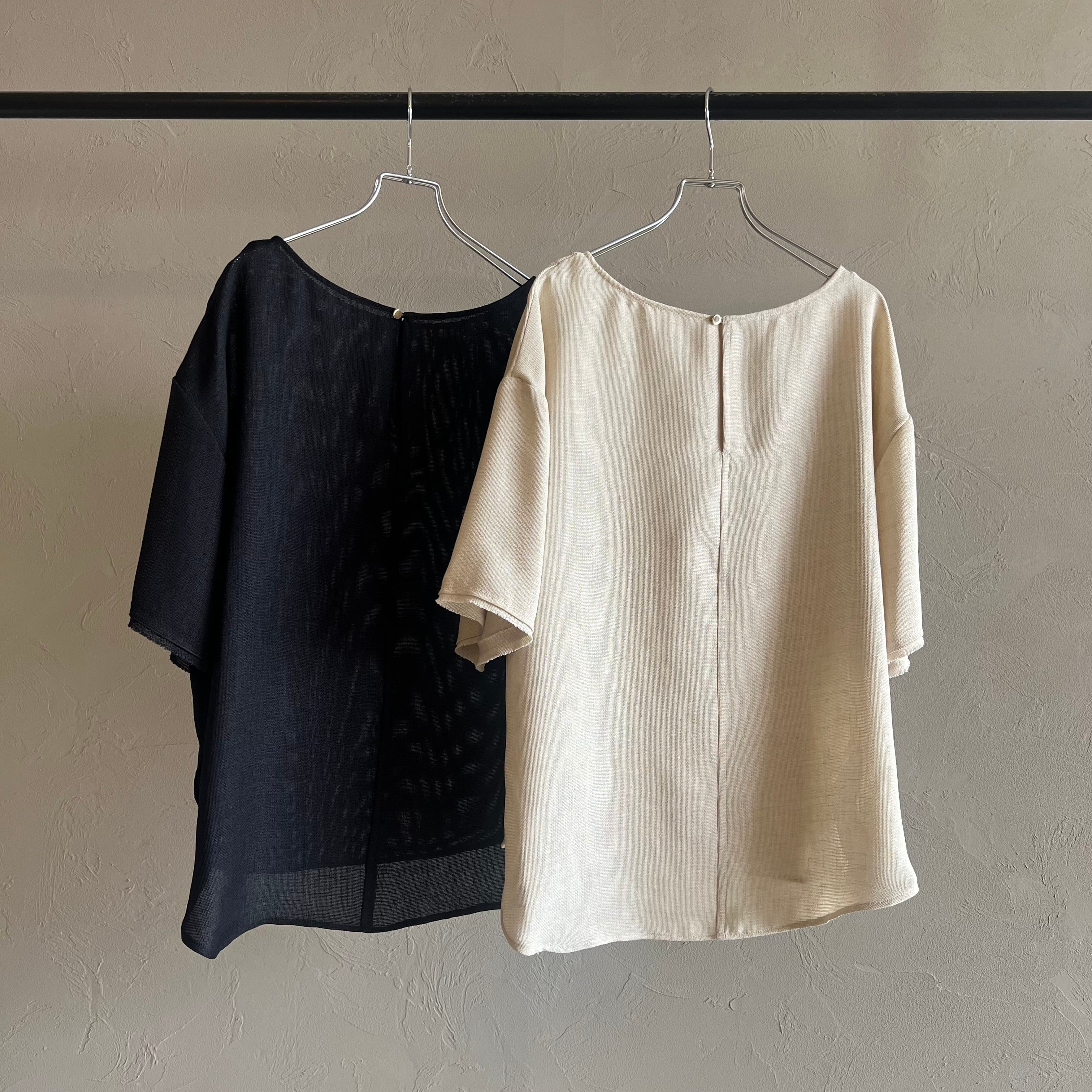 生地に隙間や透け感ができるカラミ織の生地を使用したトップス。
