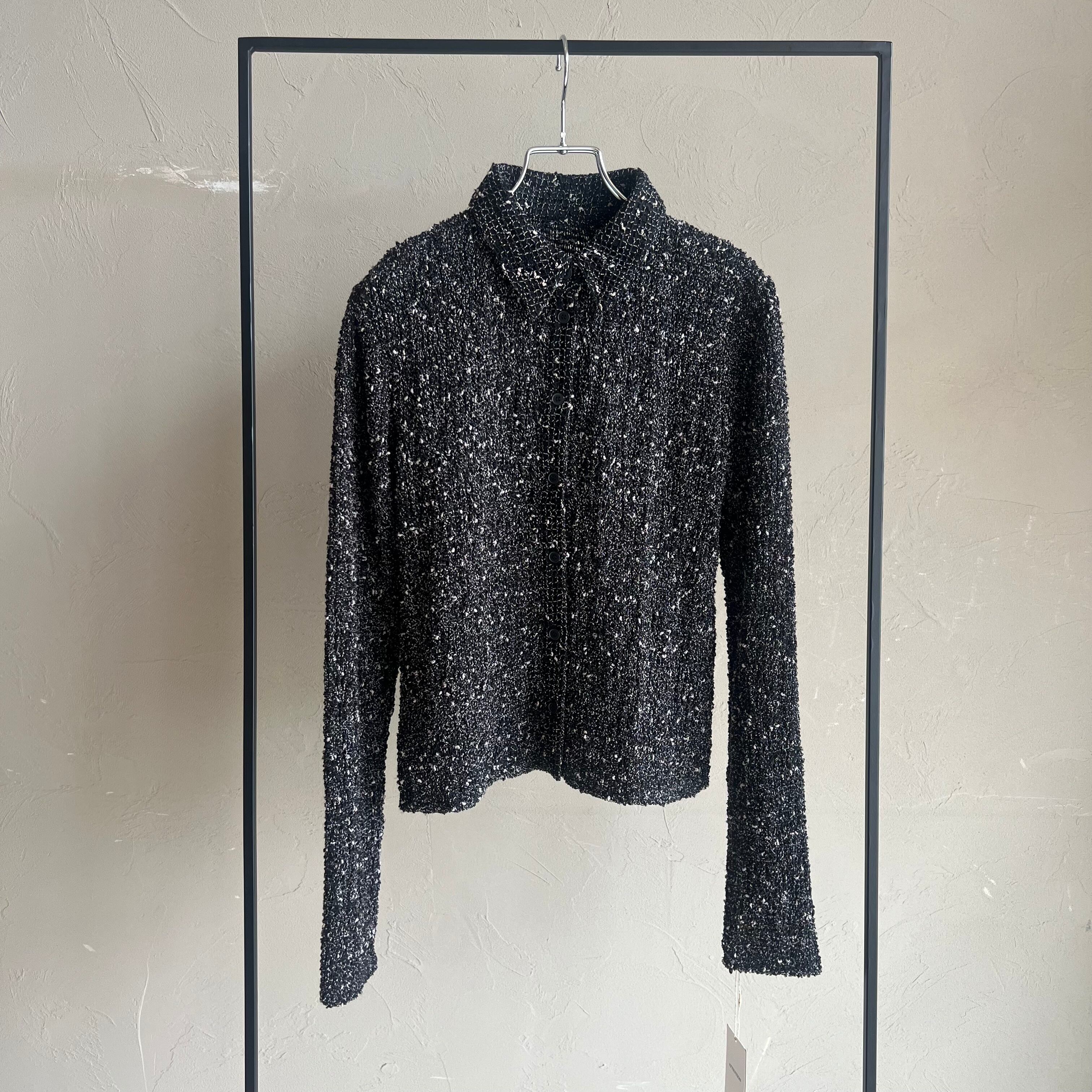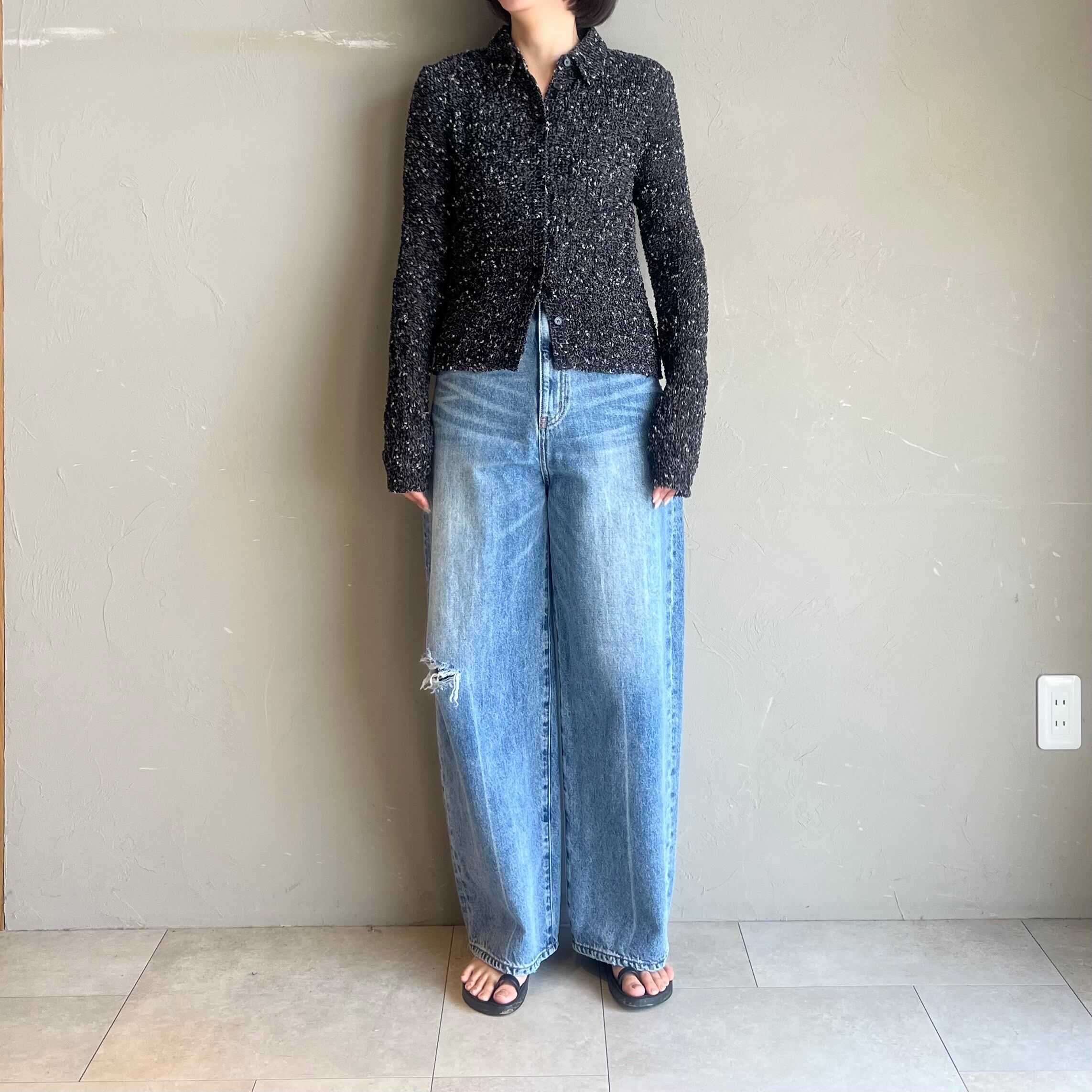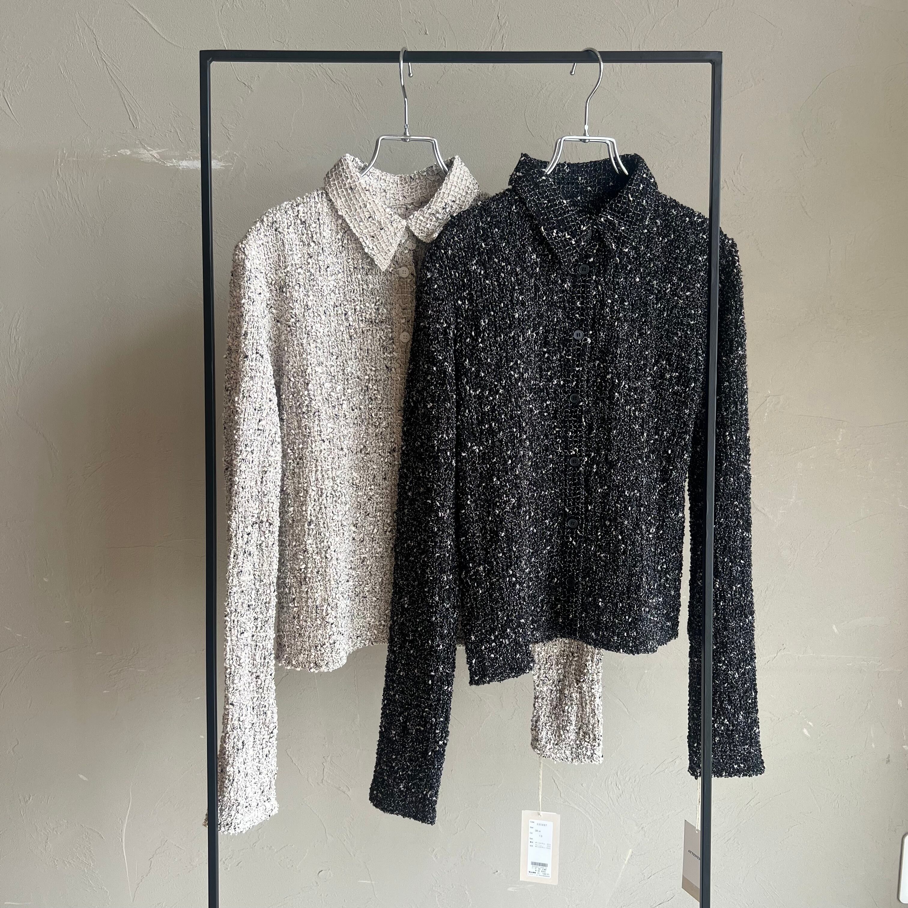 襟付きのすっきりデザインに、ツイード風のシャーリング素材が表情をプラス。伸縮性が抜群だから、一日中着ていてもストレスフリー◎