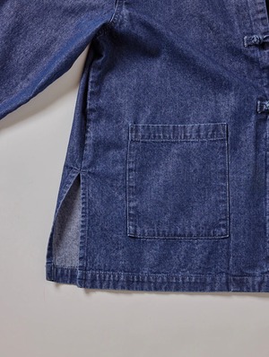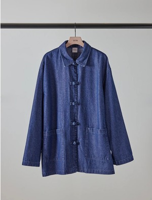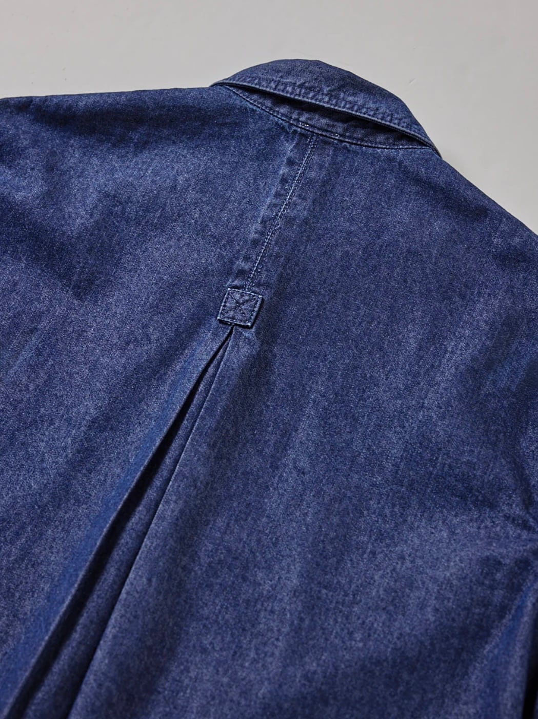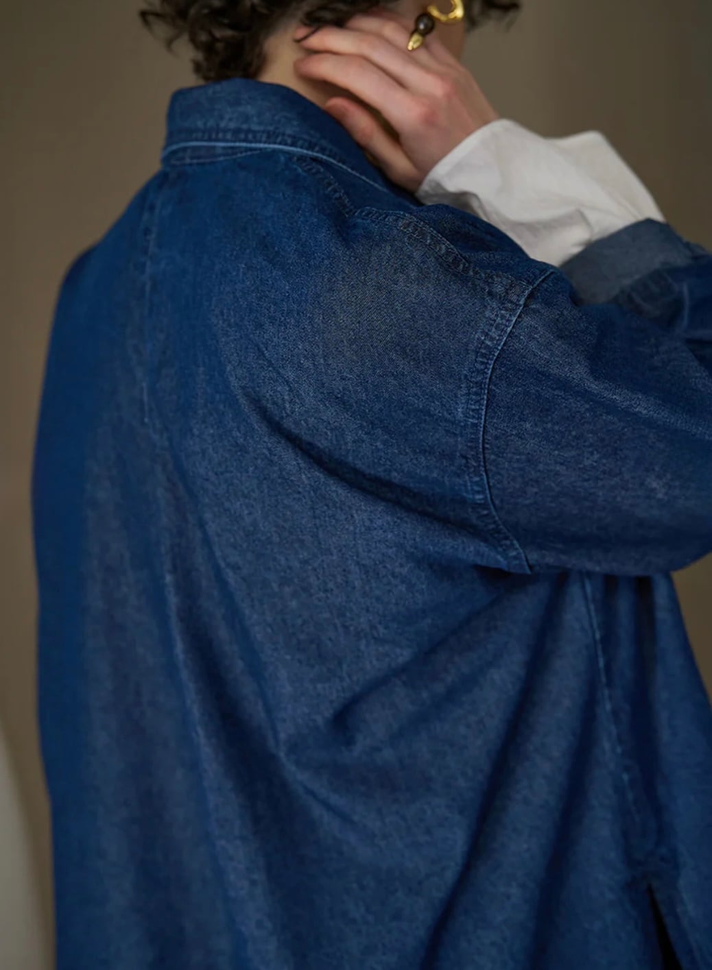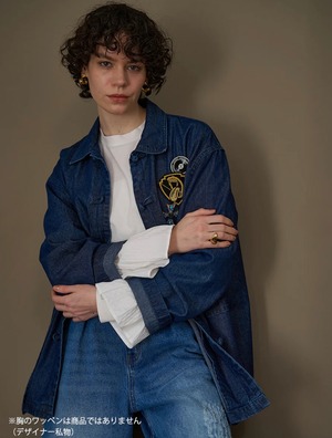 シャツ感覚で羽織れるデニム素材のシャツジャケット8.50zのレーヨンのデニムを使用しているため、やや落ち感のある仕上がりに。