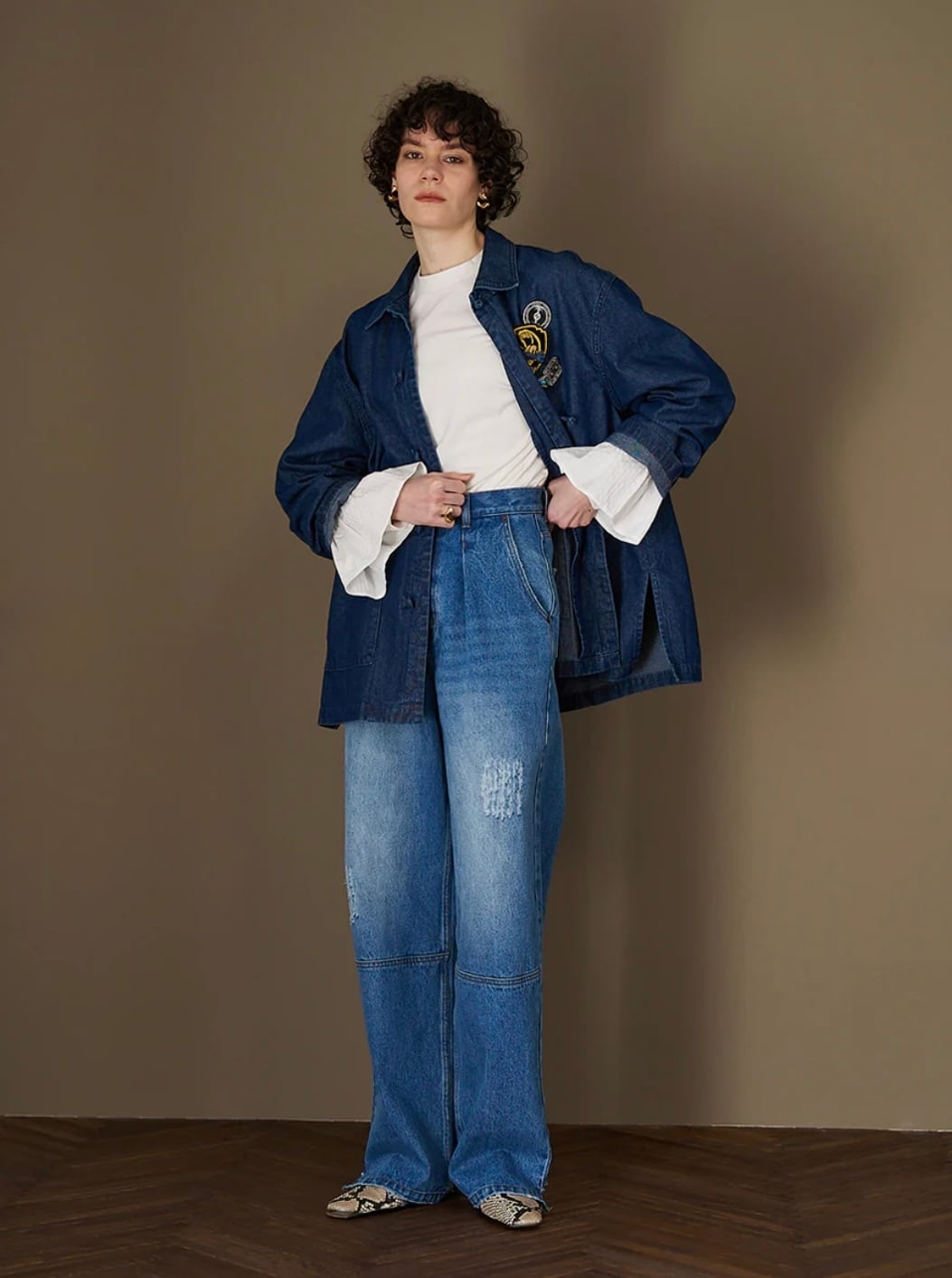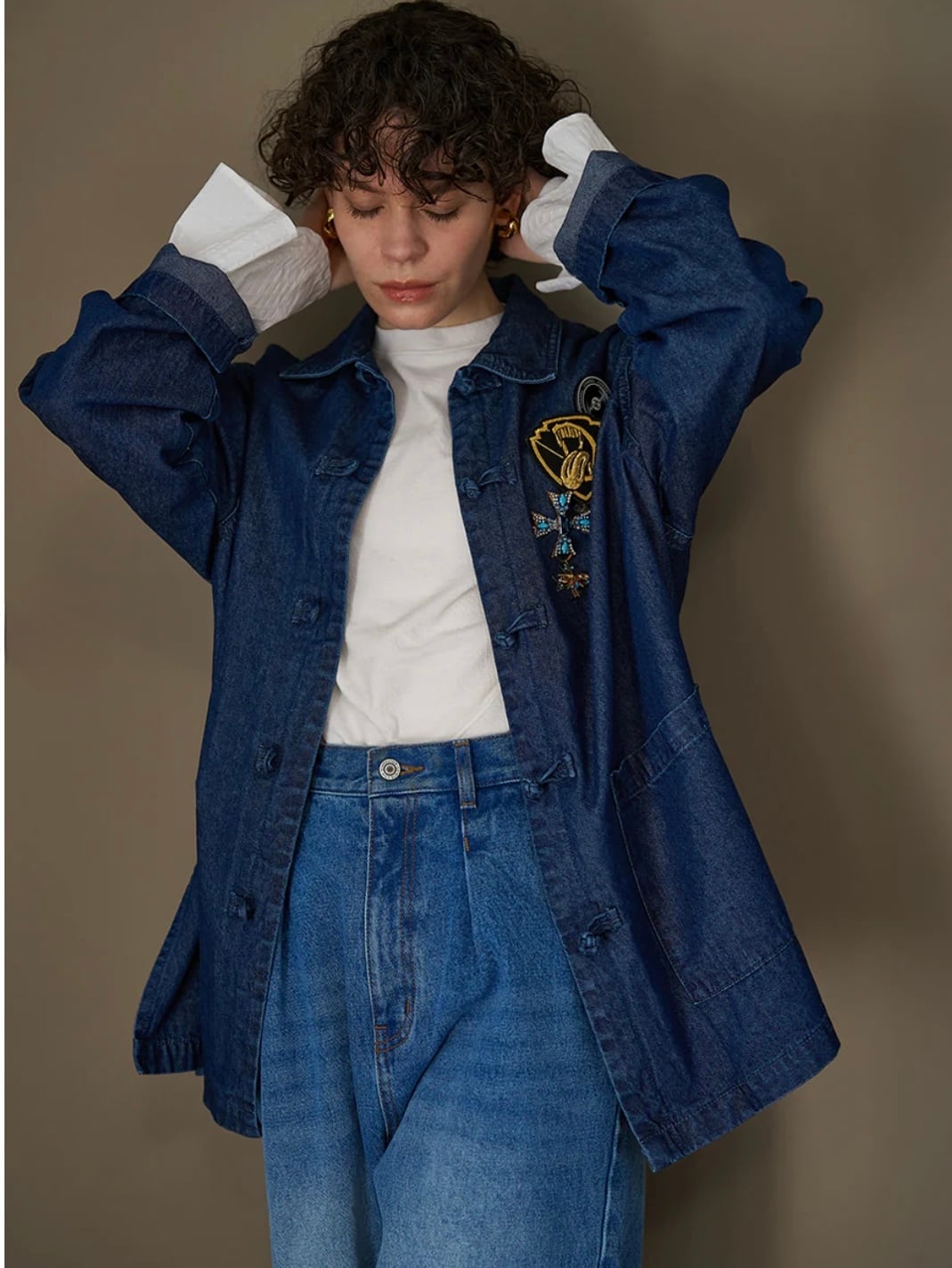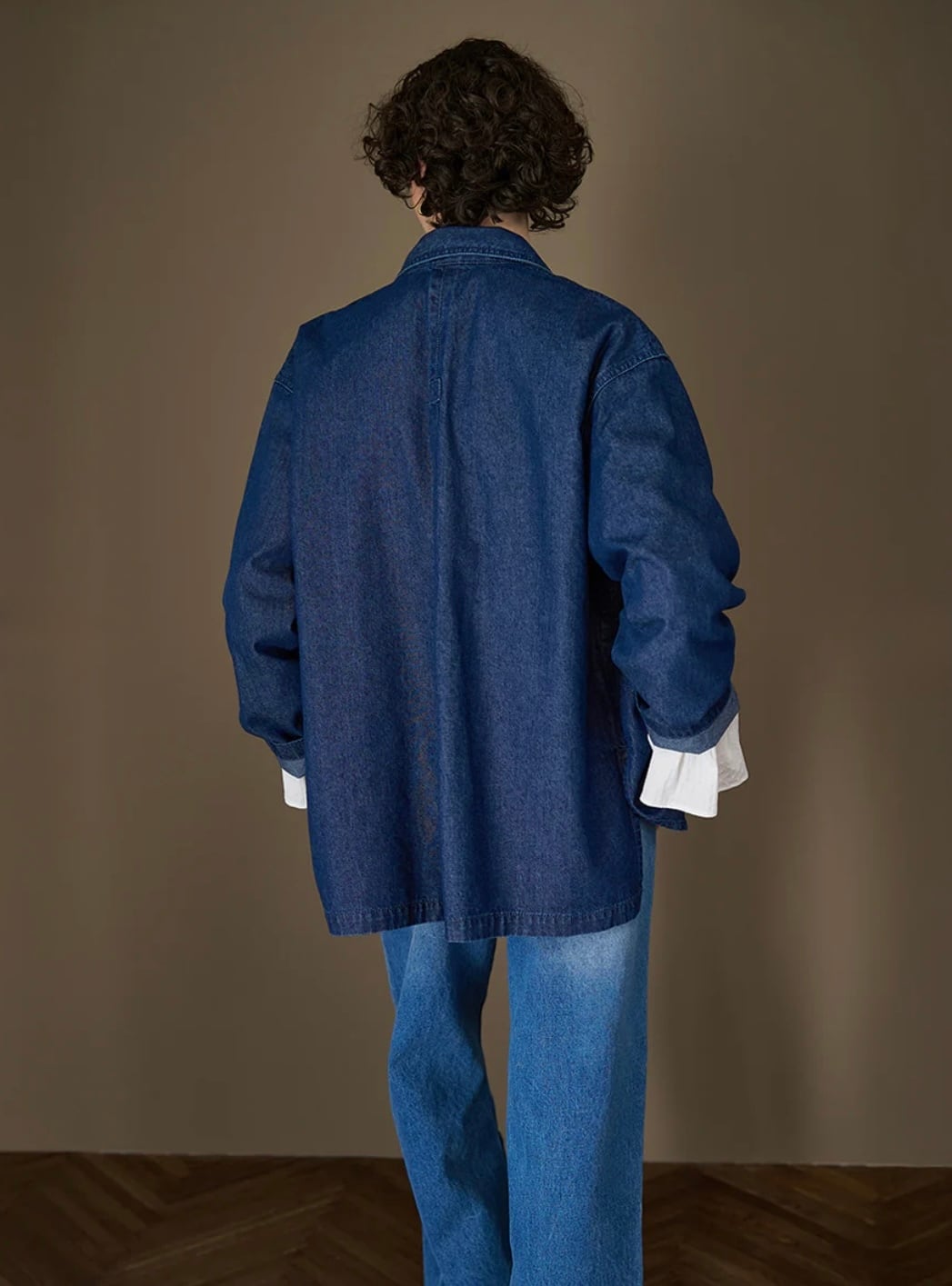 シャツ感覚で羽織れるデニム素材のシャツジャケット8.50zのレーヨンのデニムを使用しているため、やや落ち感のある仕上がりに。