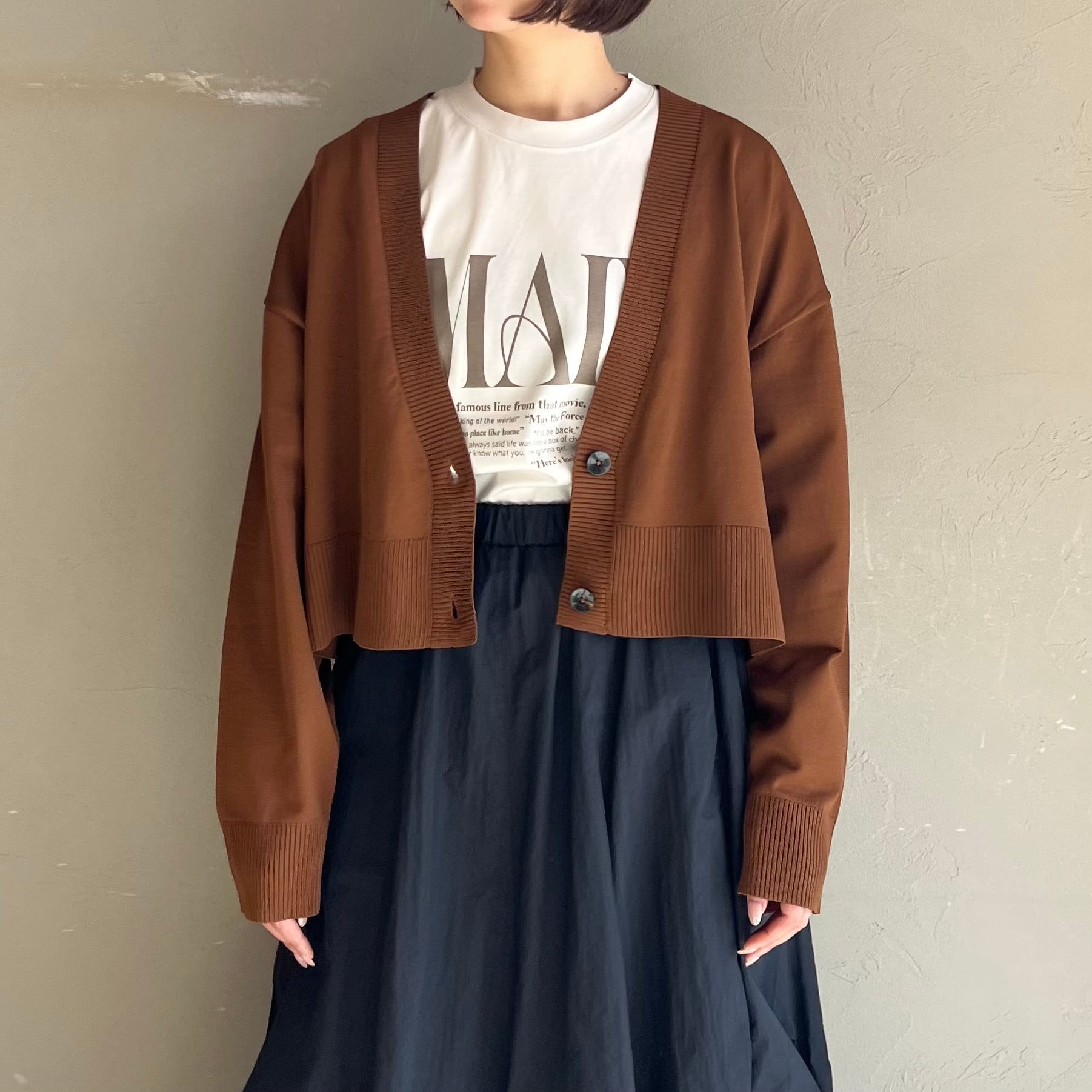 1枚でも使いやすいアイテム。目面がきれいなので、カジュアルになりすぎない点が大人女子にぴったりです。程よい厚みなので、アウトもタックインもどちらも楽しめます。