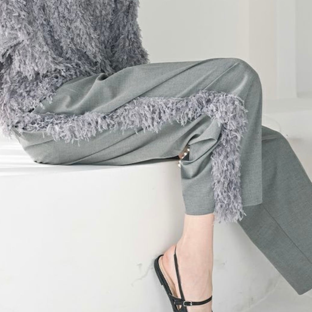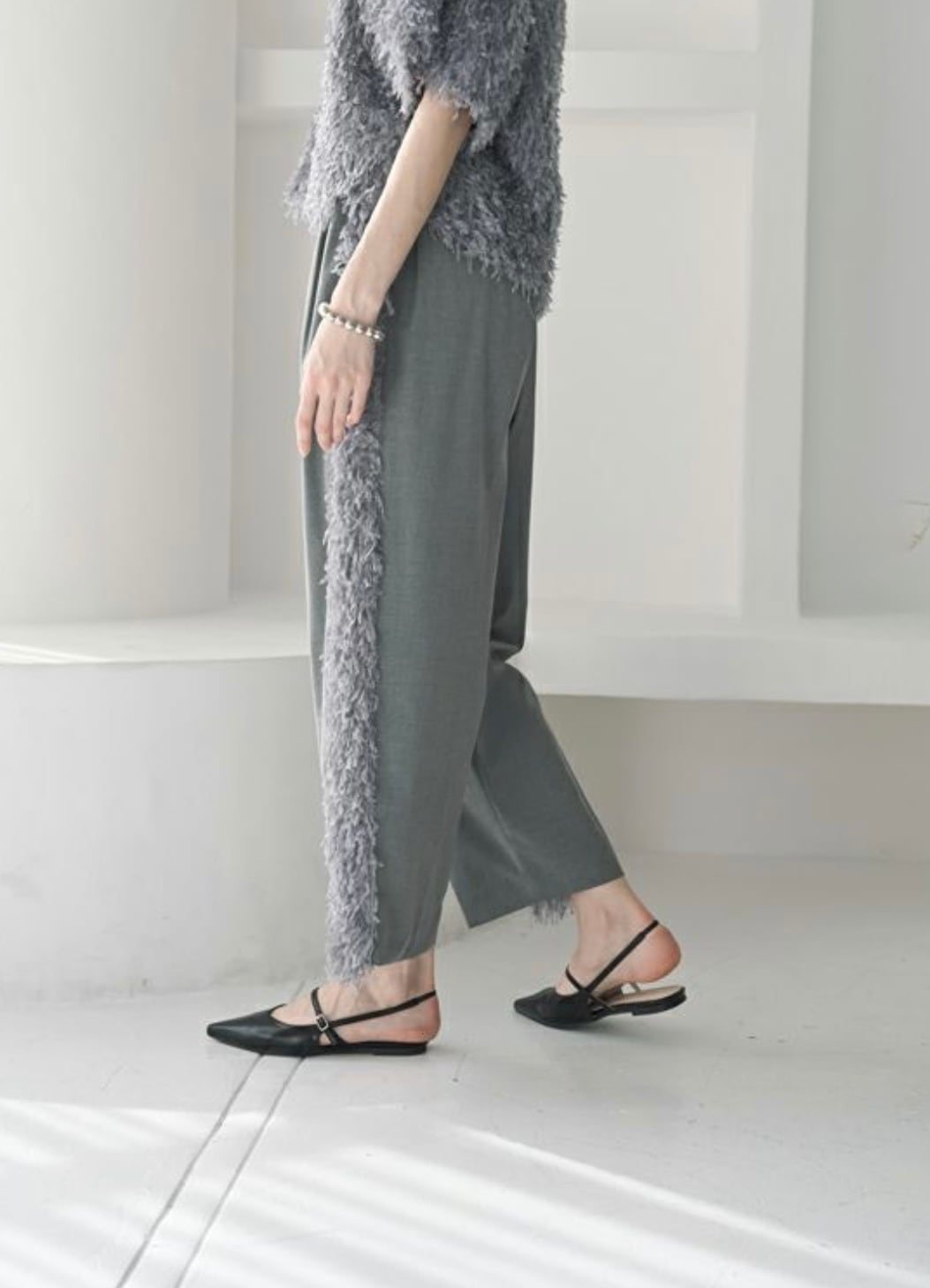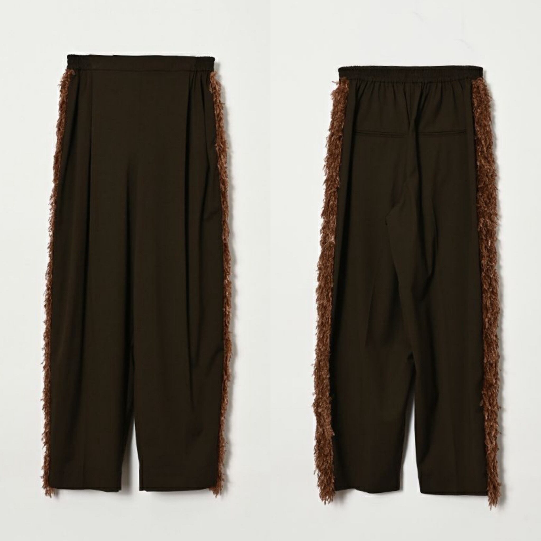 両サイドにあしらったフェザーが、動くたびに優雅な表情を生む一着。マニッシュな生地を贅沢に使用しながらも、リラックス感のあるテーパードシルエットが大人のフェミニティを演出します。