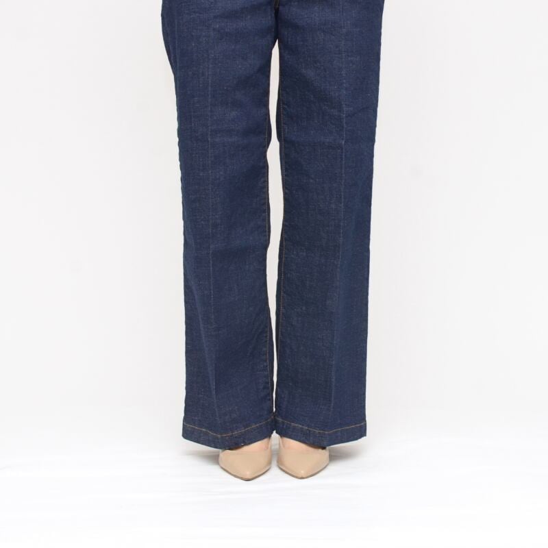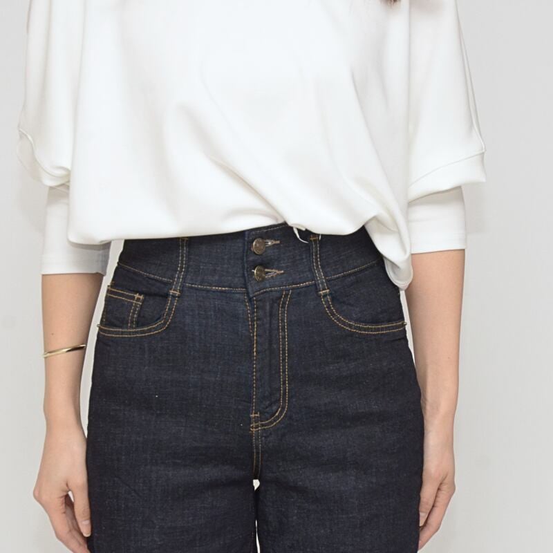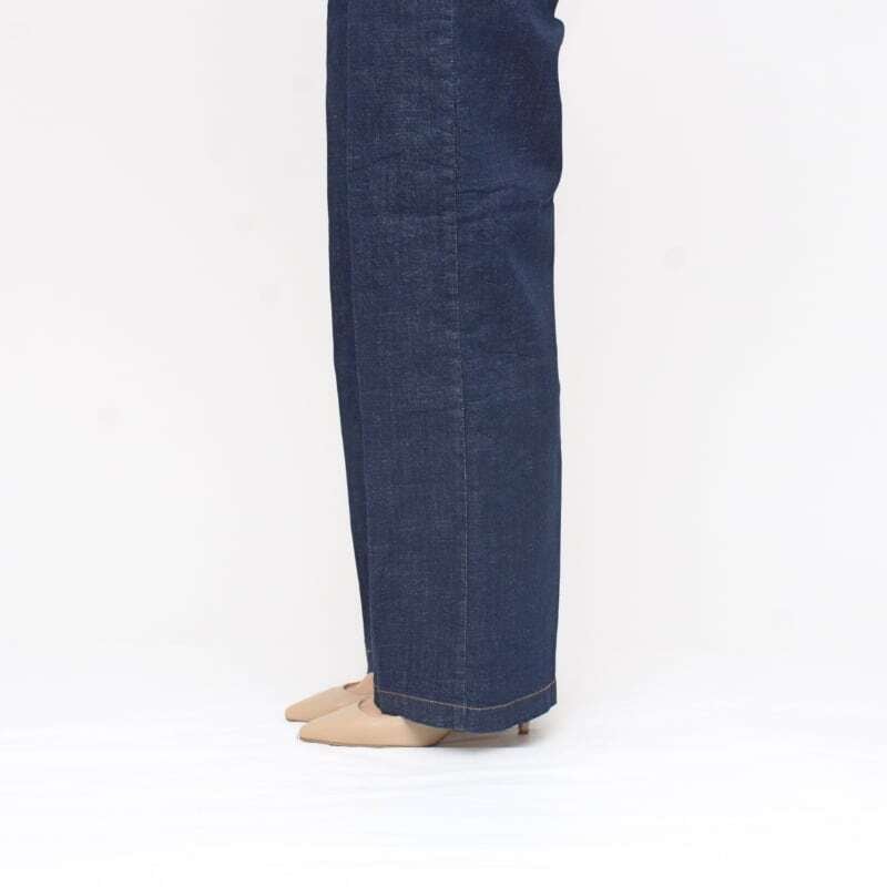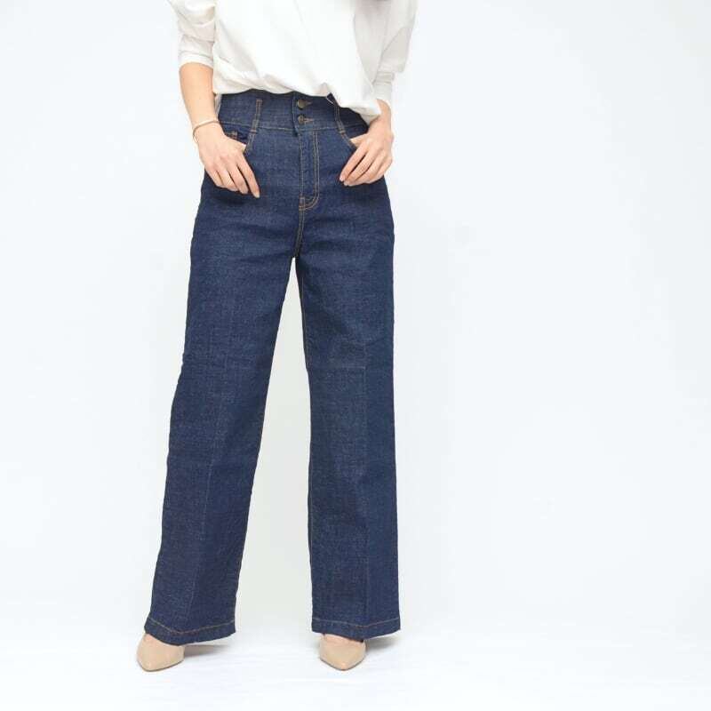 ウエスト位置を高く見せるハイウエストデザインと、お腹周りをすっきりと見せるダブルボタンで、