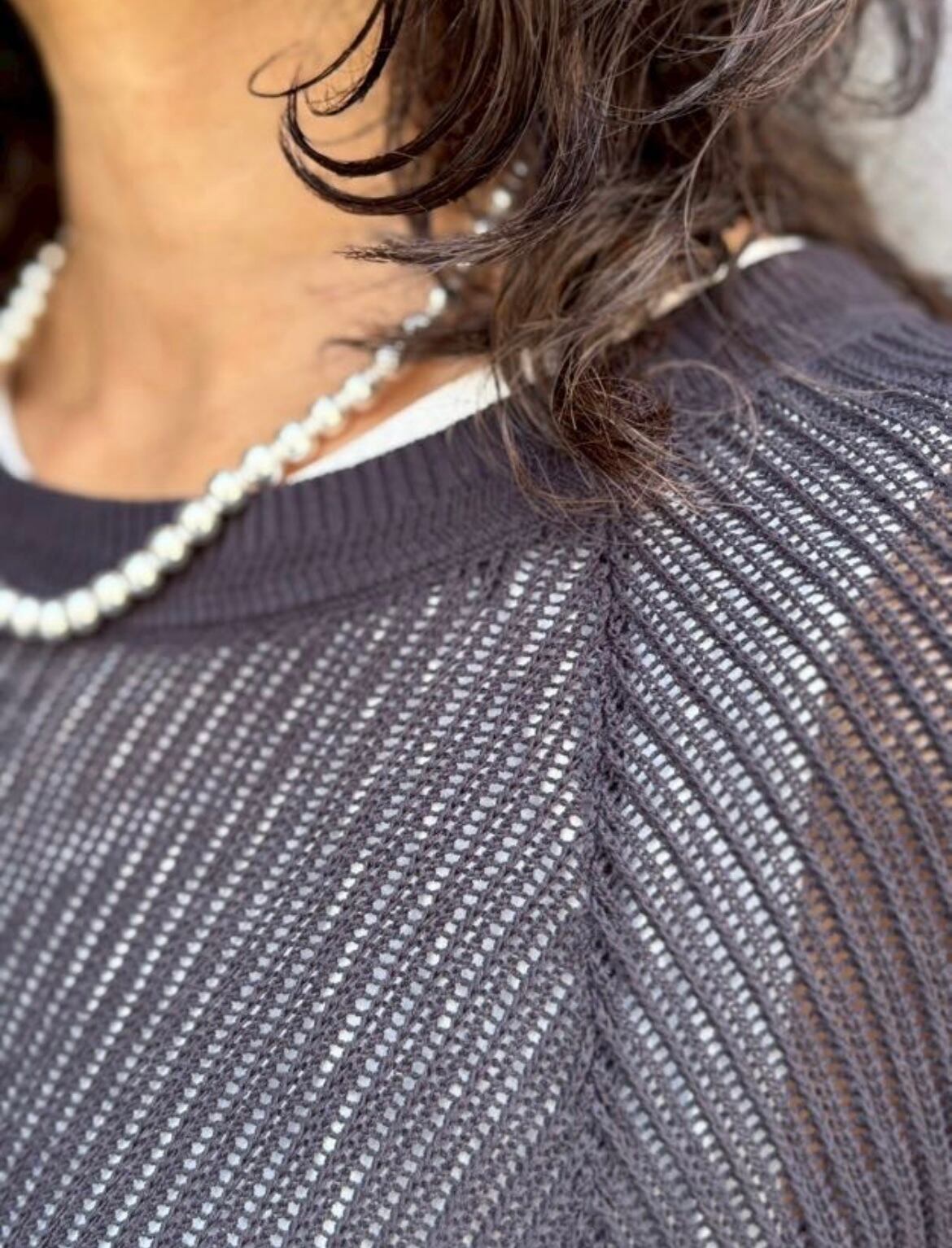 透かし編みプルオーバーは、軽やかな編地が上品な抜け感を演出し、大人のリラックススタイルに最適な一枚。
