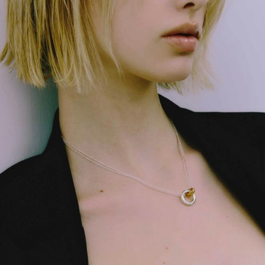 アシンメトリーなデザインや2連のチェーンなど、シンプルな中にもこだわりが光る印象的なデザインは、スタイリングのさりげないアクセントに。