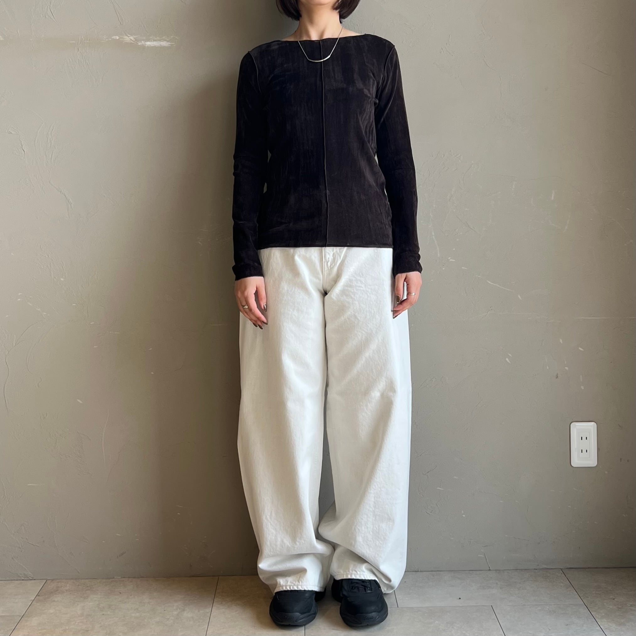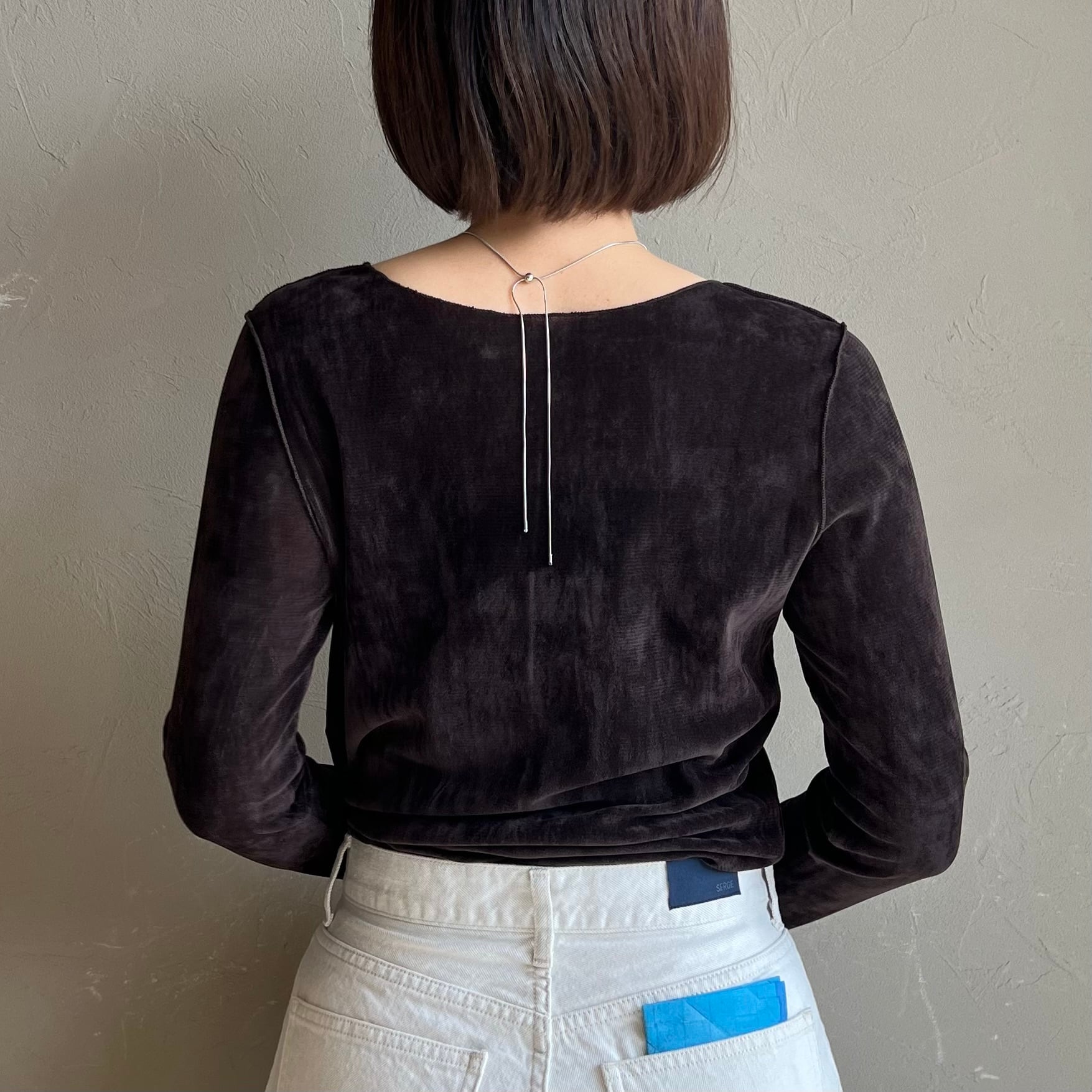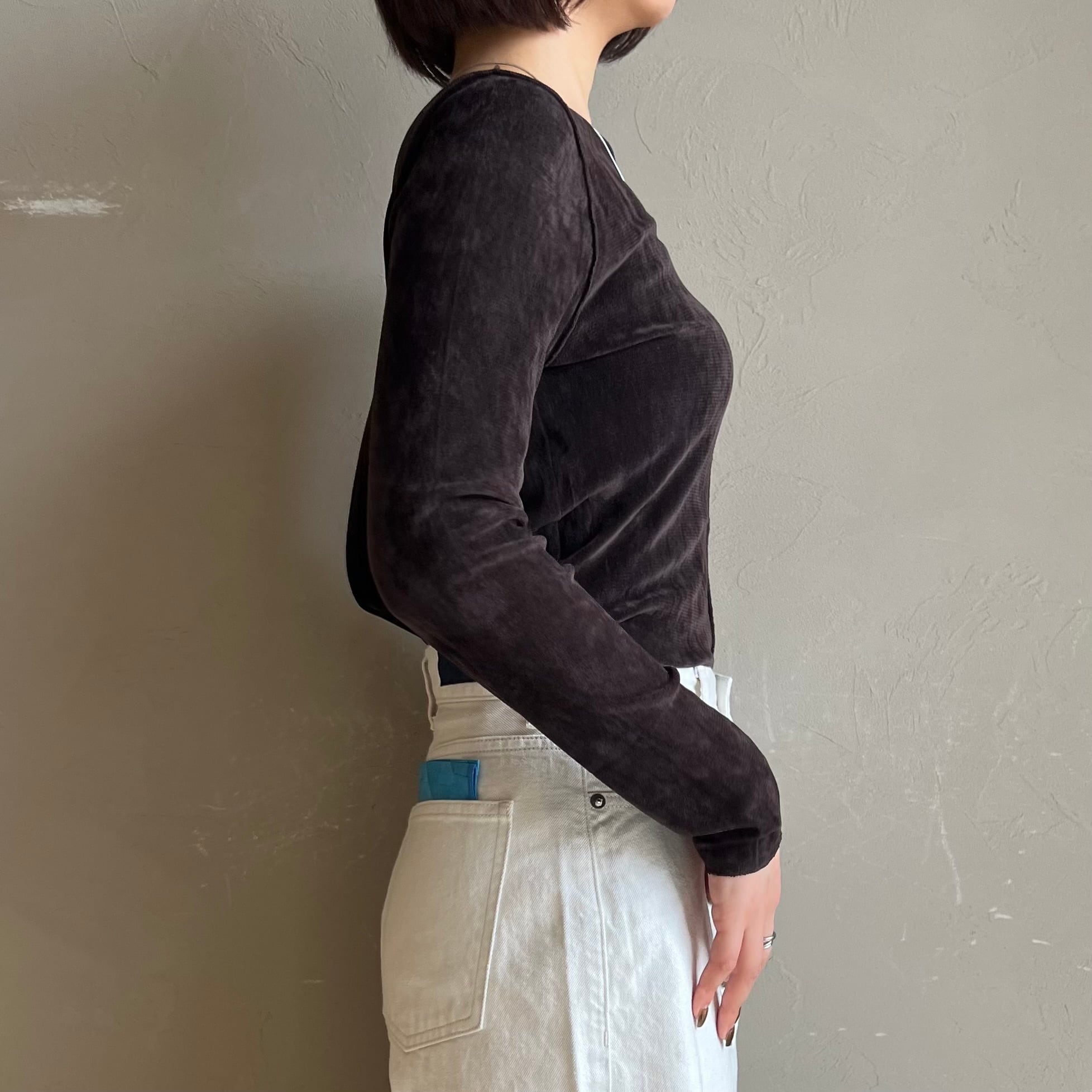 上品な光沢感と透け感が魅力のシアーベロア素材を使用したロンT。