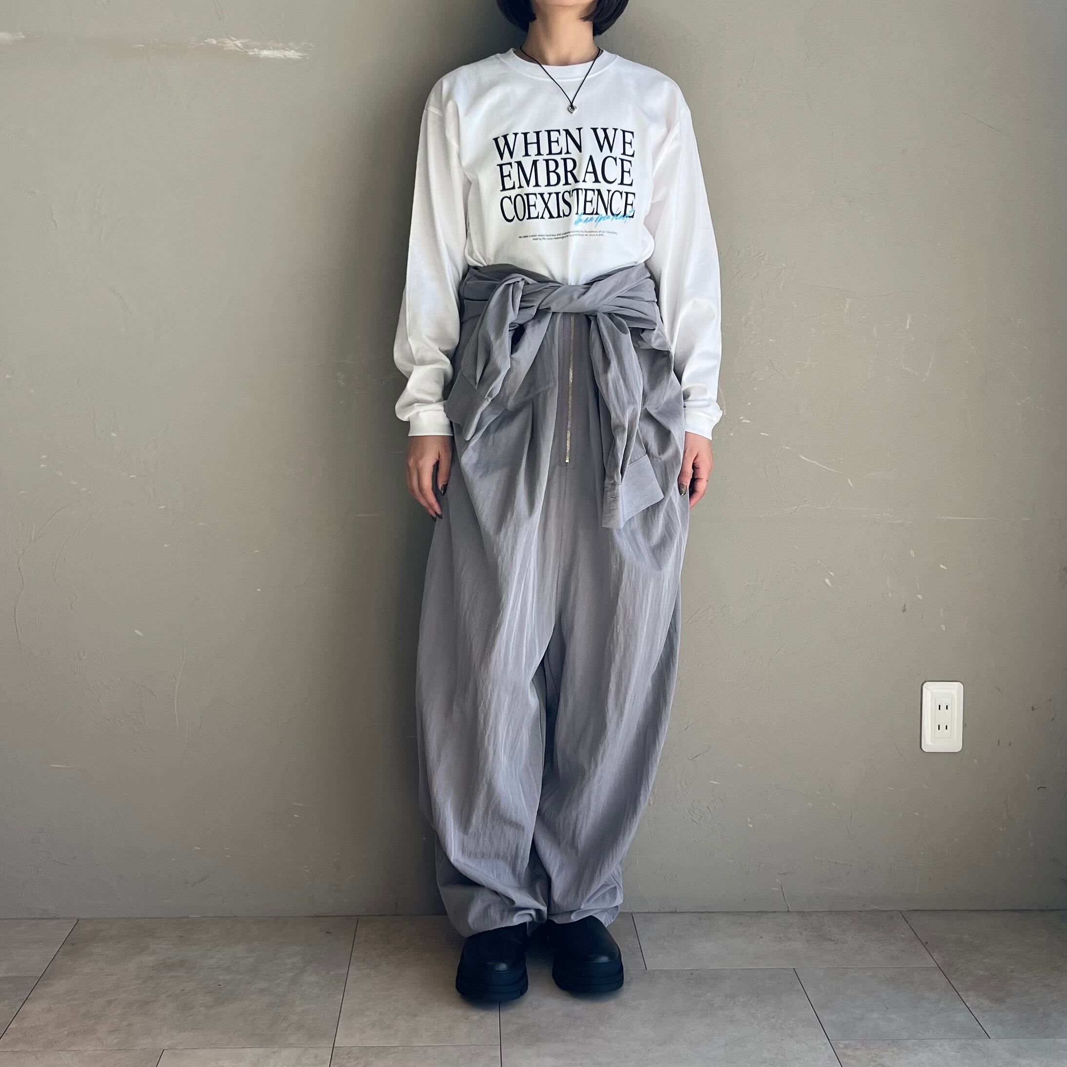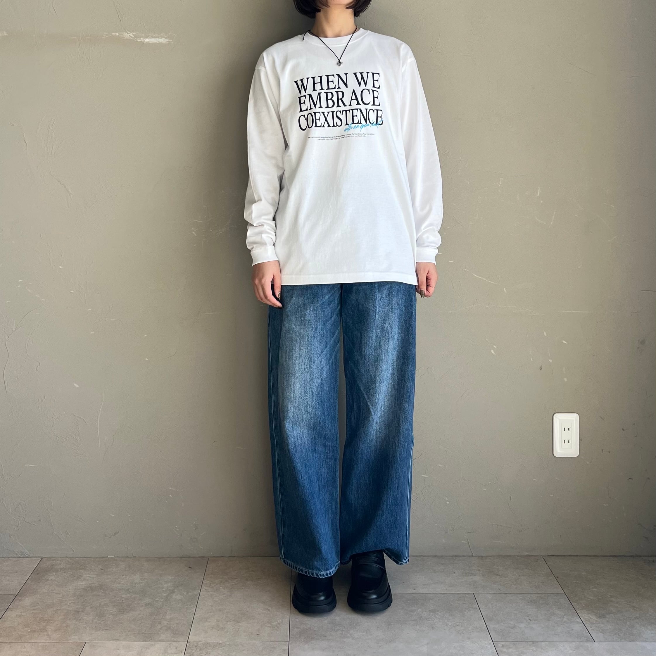 デニムやジャケットとのレイヤードで、アートな雰囲気を楽しめるアイテムです。