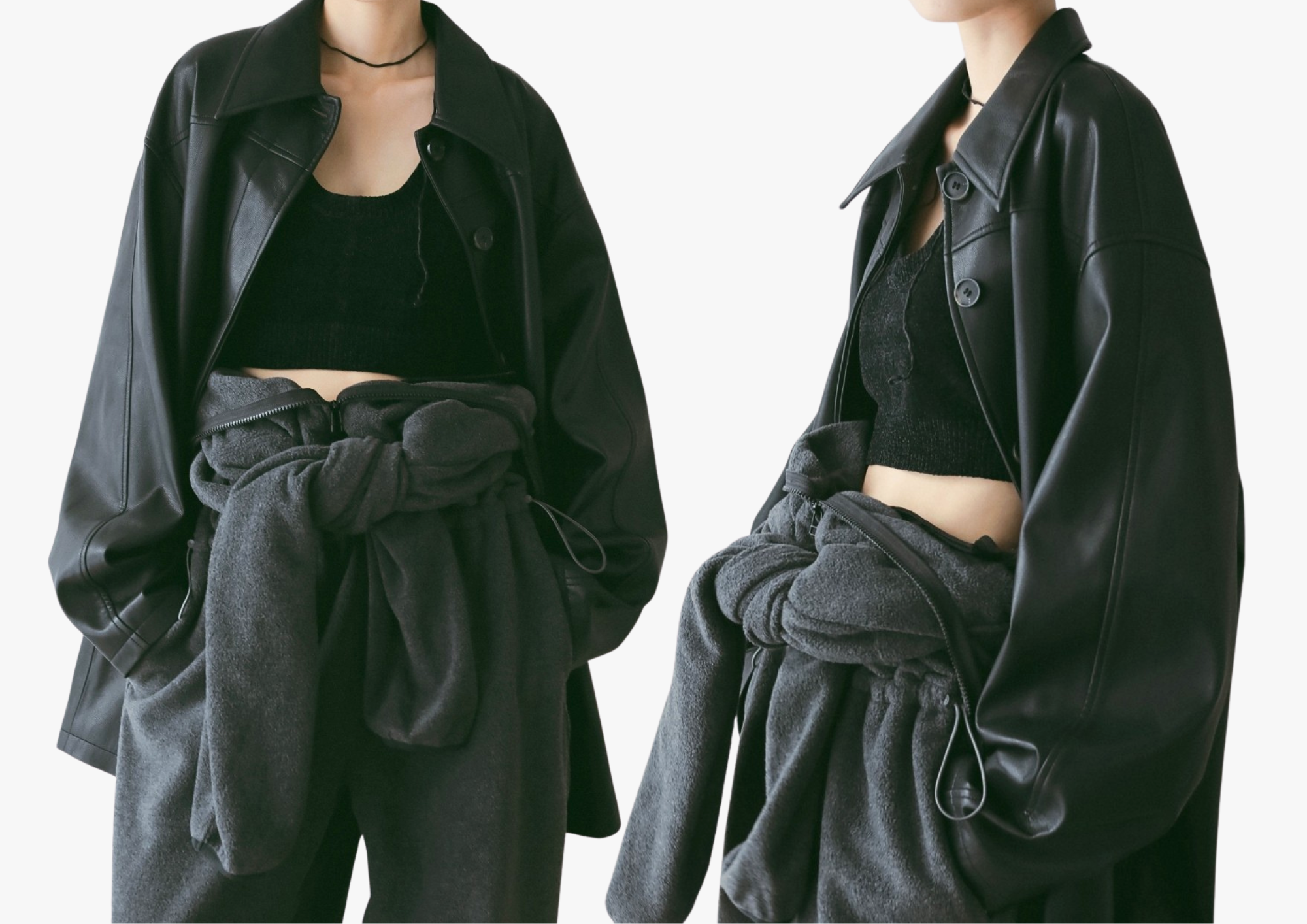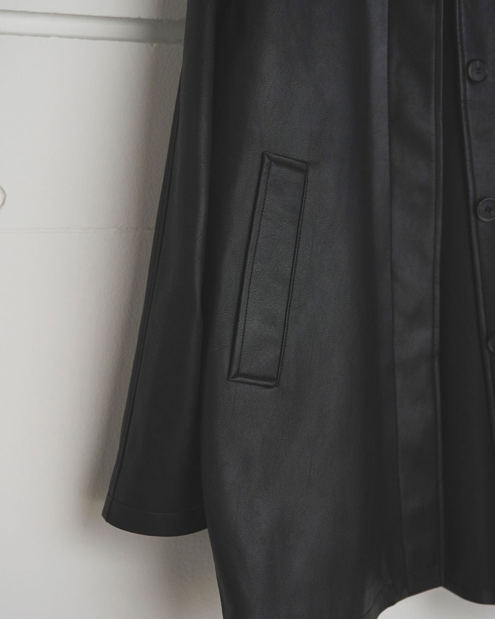 昨年もご好評いただいたエコレザージャケット。上質なエコレザーを使用しました。適度な光沢、細かいシボ、程よいハリ感のある生地で、カジュアルなアイテムですが、上品に見せてくれます。オーバーサイズなので、中に肉厚のニットも着ていただけます。袖にタックを入れて少し丸みを帯びたシルエットに仕上げています。幅広いスタイリングに合わせやすく、秋だけでなく、寒さの残る春先など、長く使っていただける一枚です