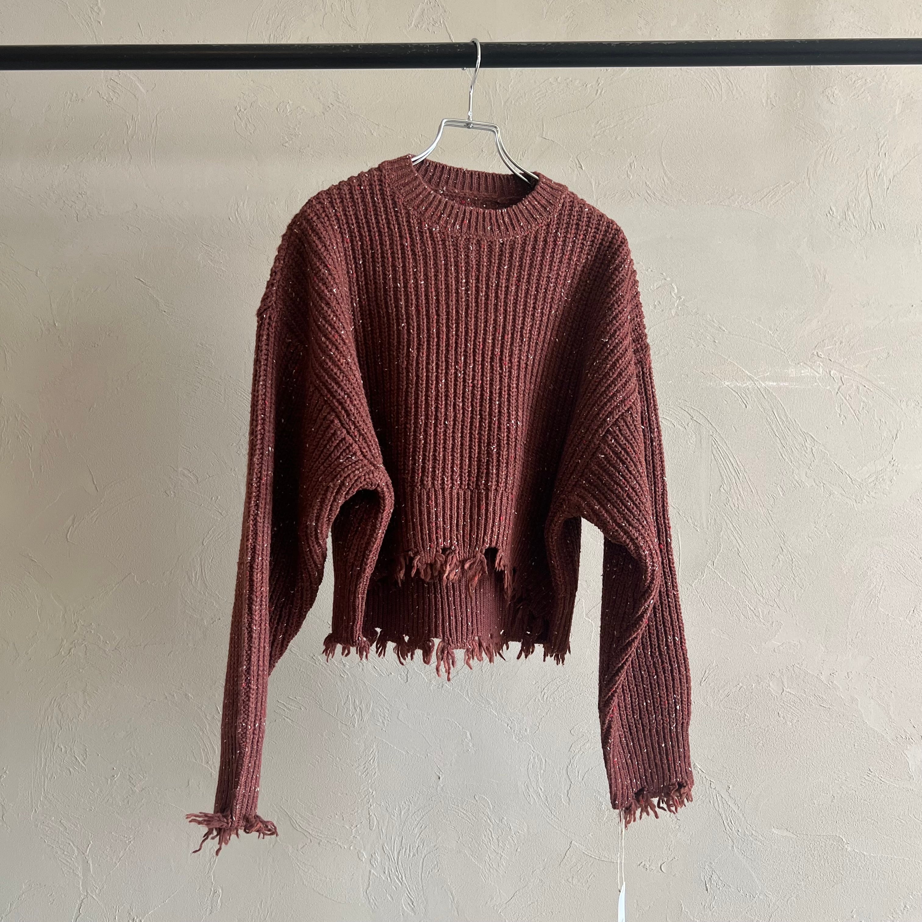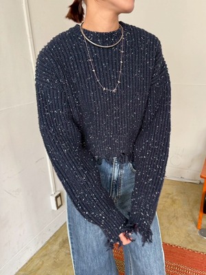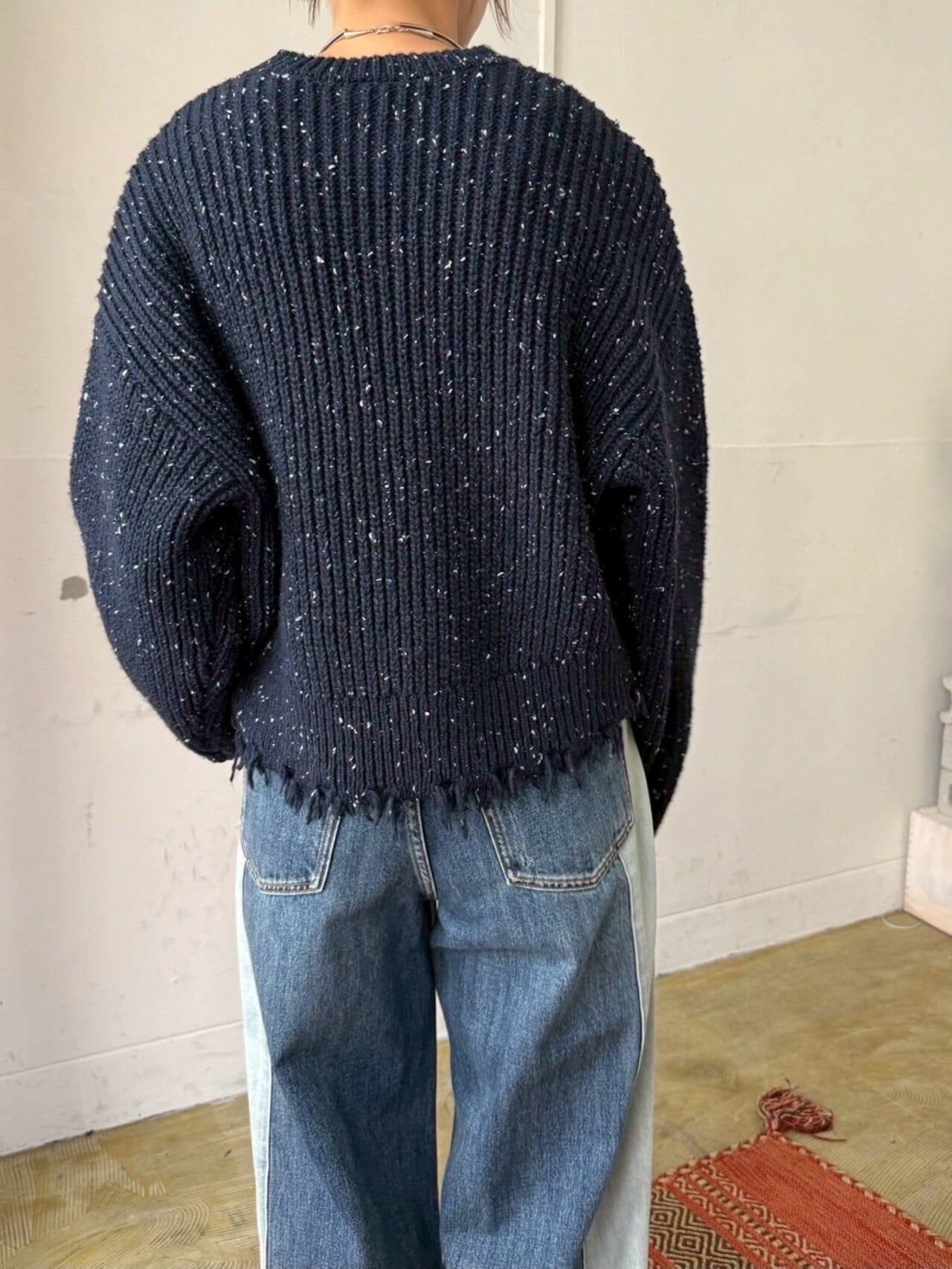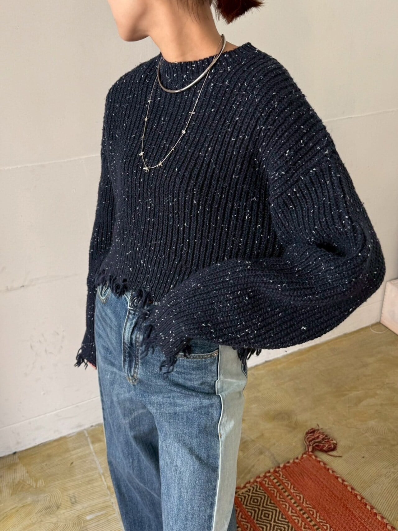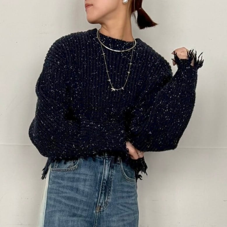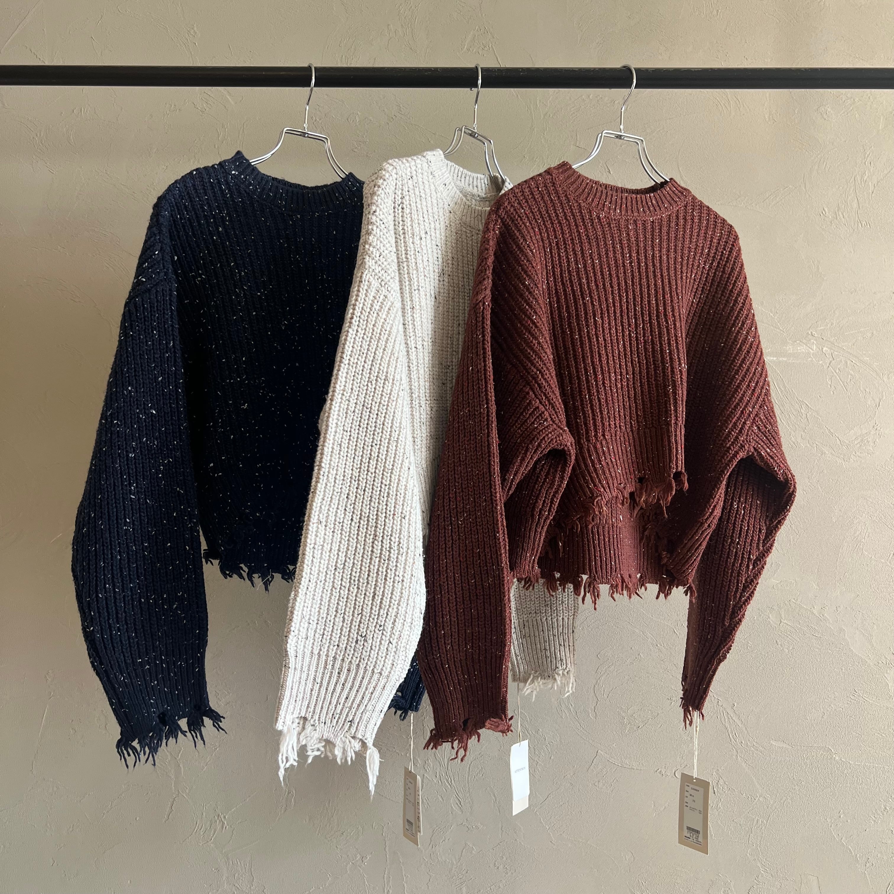 袖口と裾のダメージディテールがポイントのニットプルオーバー。程よくゆったりとしたサイズにソフトな風合いの糸質で着心地◎フォルムの出るスリーブやネップの入った表情も特徴でコーディネートのアクセントになる一枚。