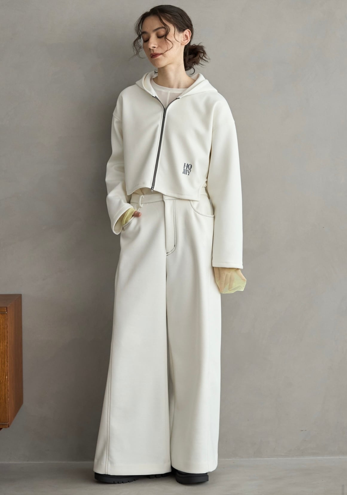 短丈×ワイド袖で腰位置が高く見え、ワンピやハイウエストとも好相性。洗えてシワになりにくく、通勤から週末まで上品スポーティに。