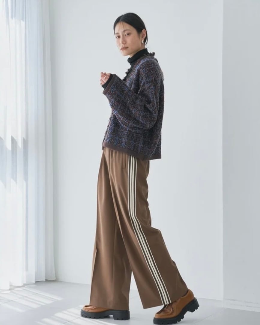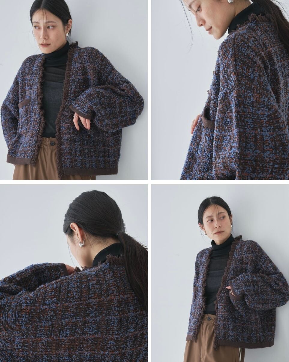 【Audrey and Johnwad ニットツイードカーディガン】は、上品なツイード調の風合いとリラックス感のあるシルエットが魅力。