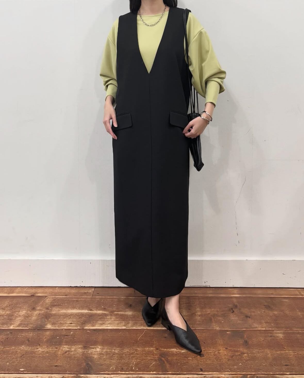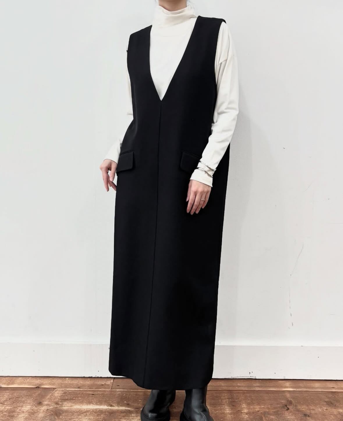 深めなVネックラインが抜け感があり大人な印象のジャンスカワンピ。