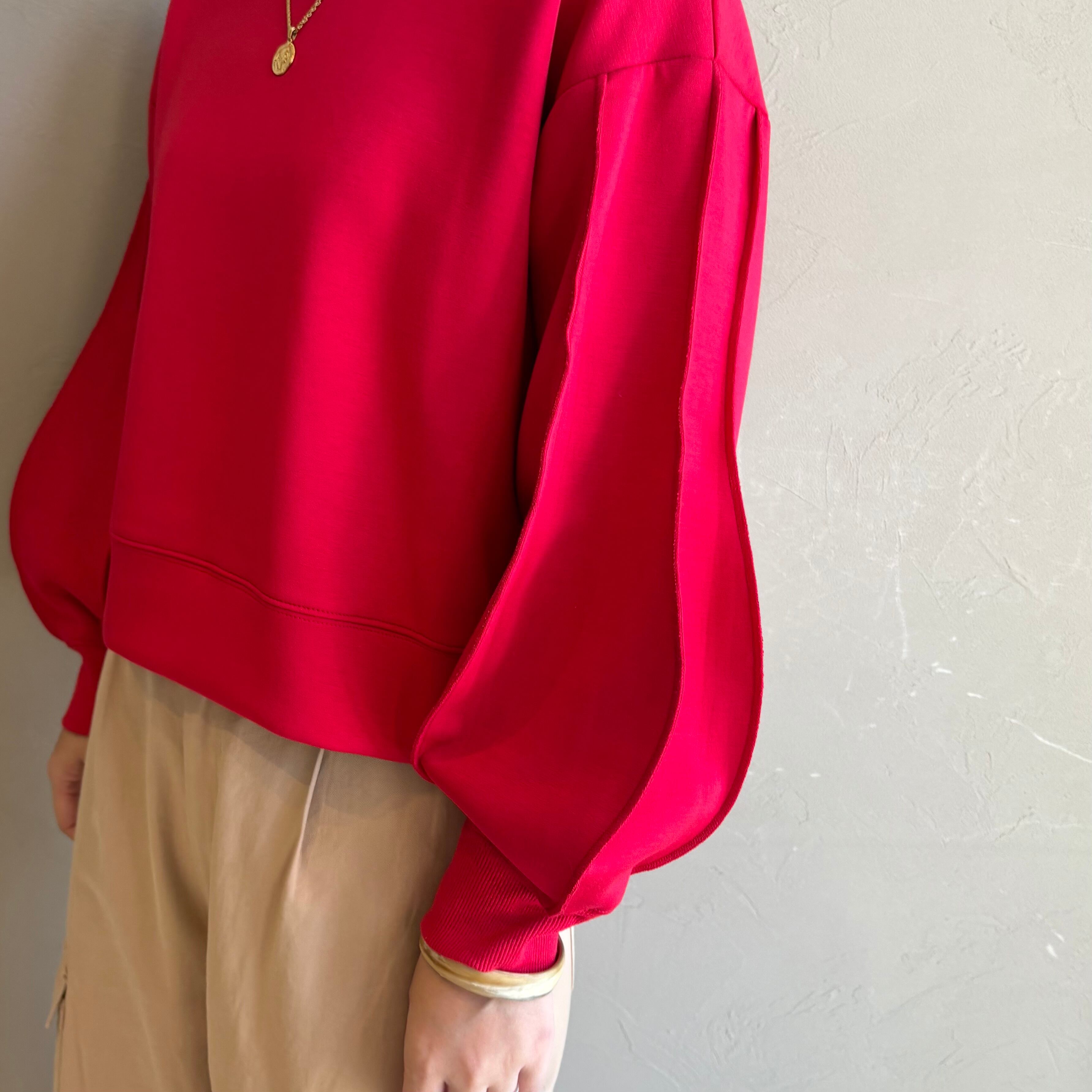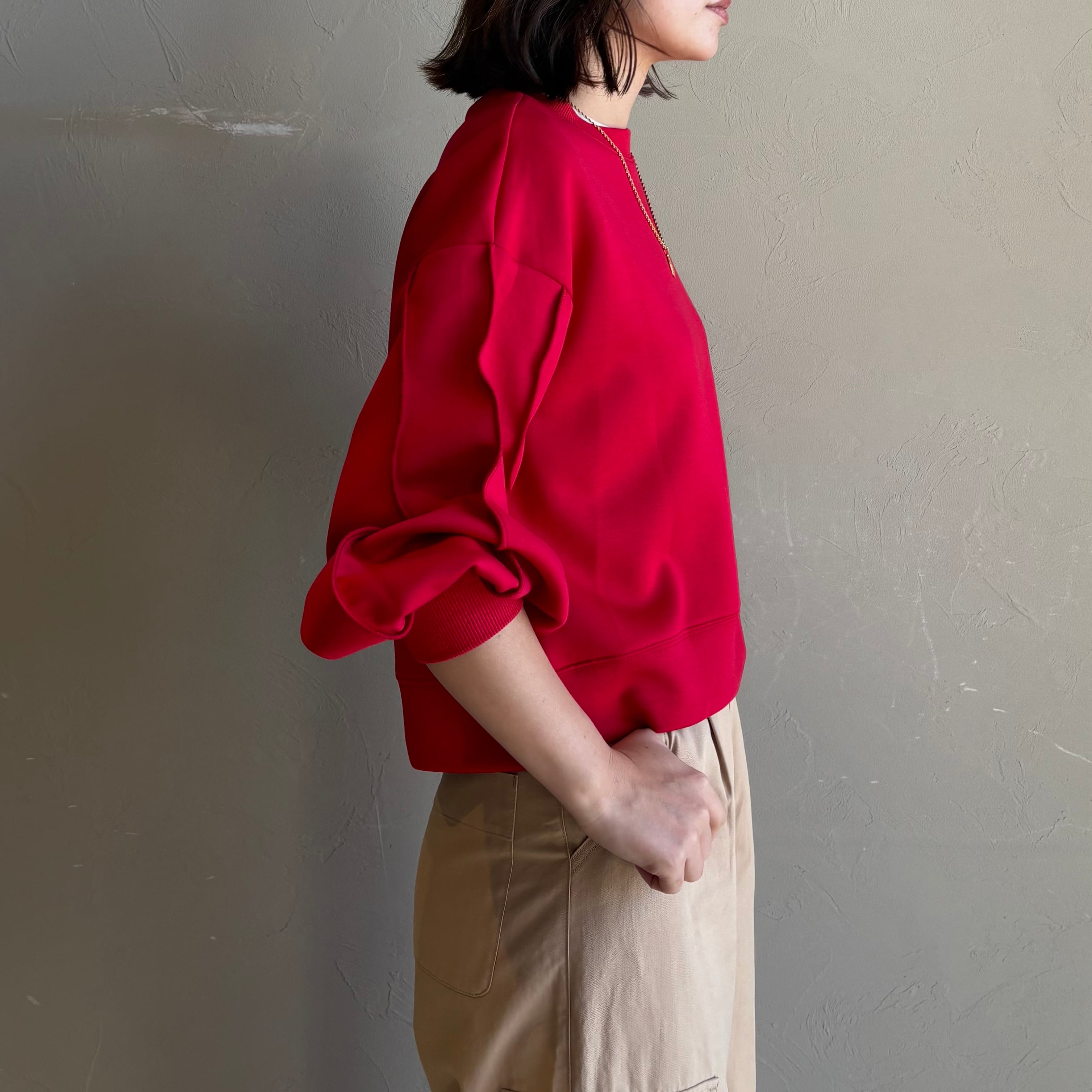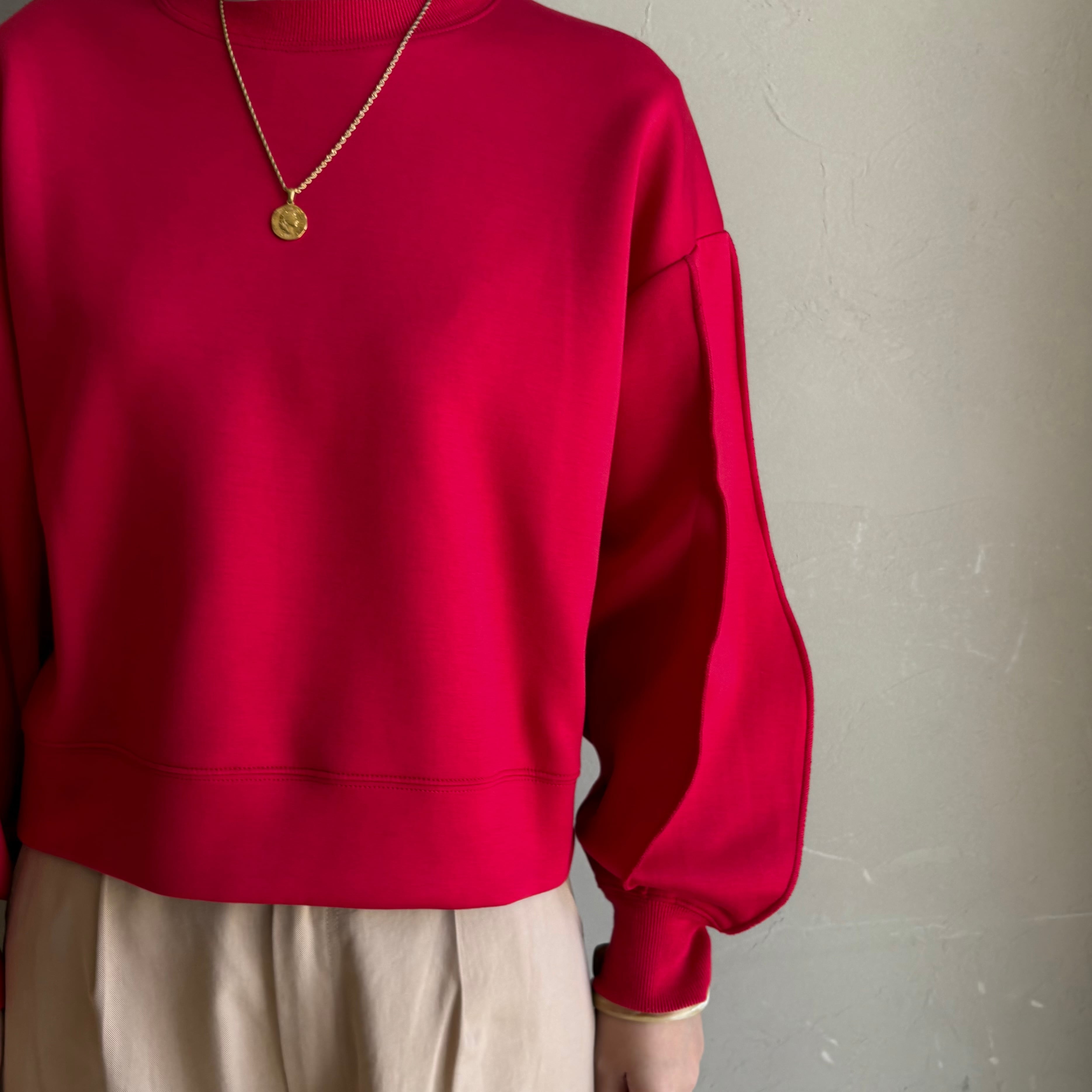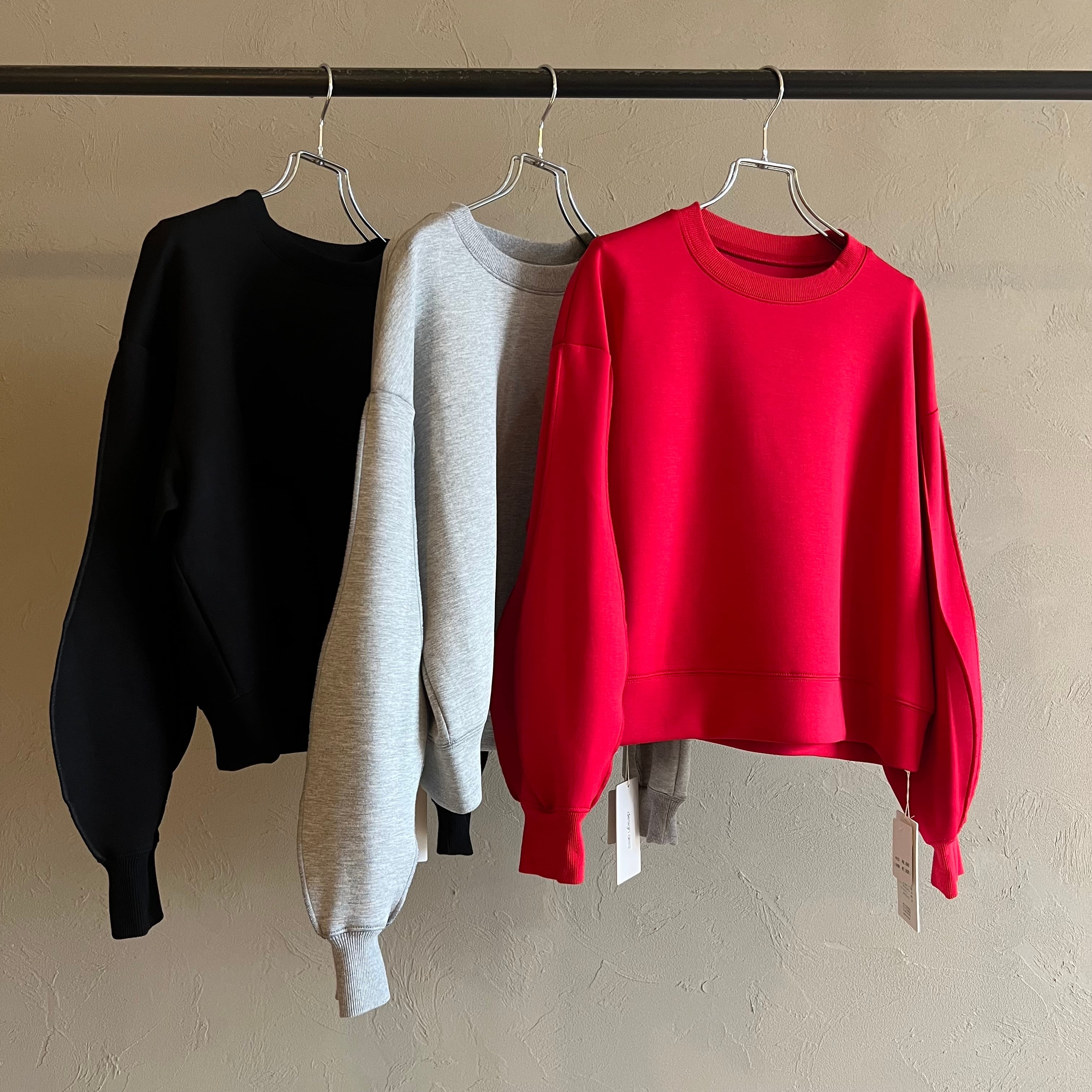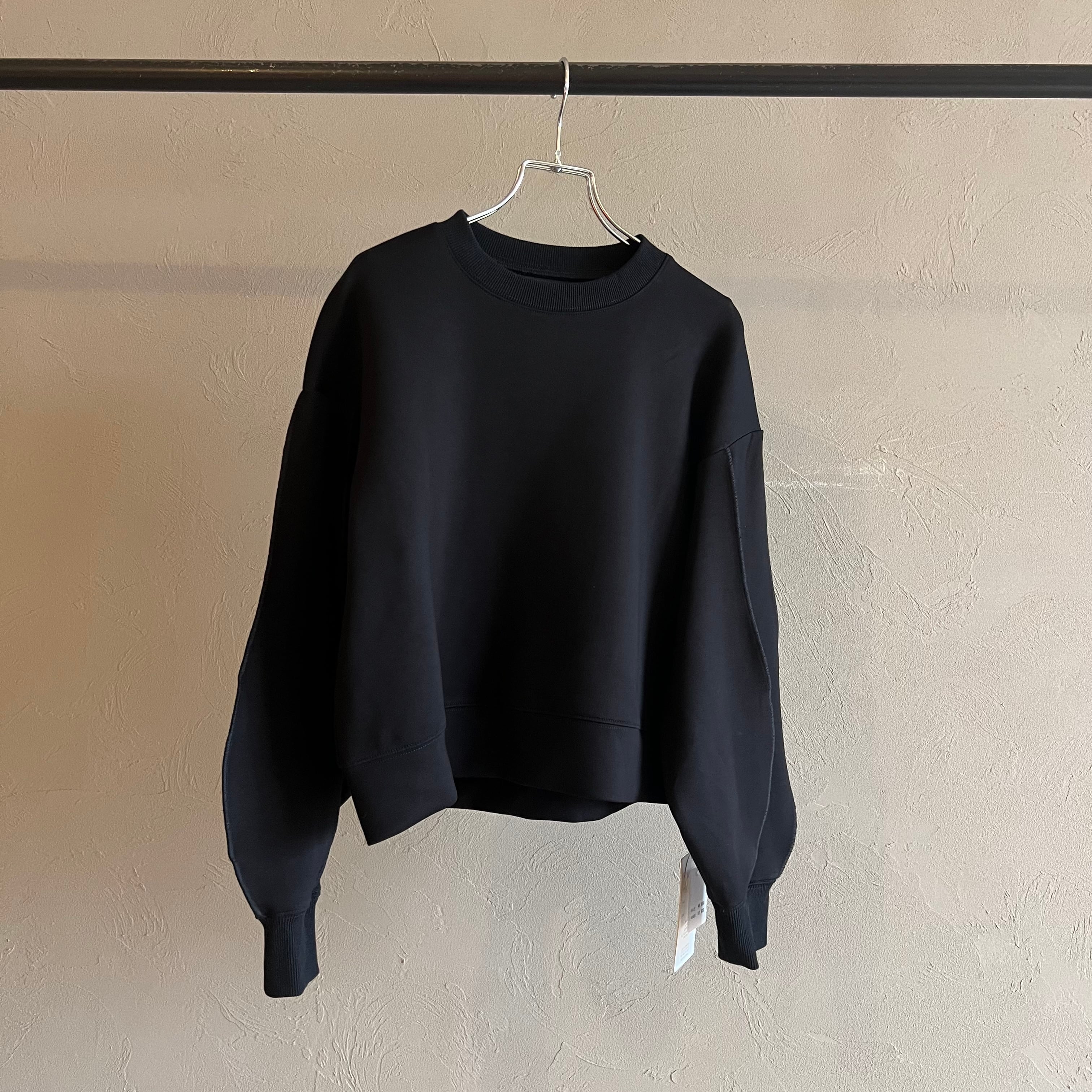 つるっとした表面、ストレッチの効いたダンボールニットを使用したプルオーバー。