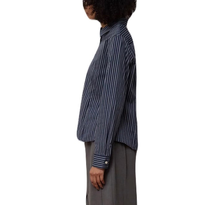 クラシカルなストライプに、さりげなくウエストをシェイプしたシルエットが特徴のシャツ。