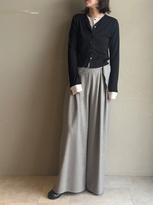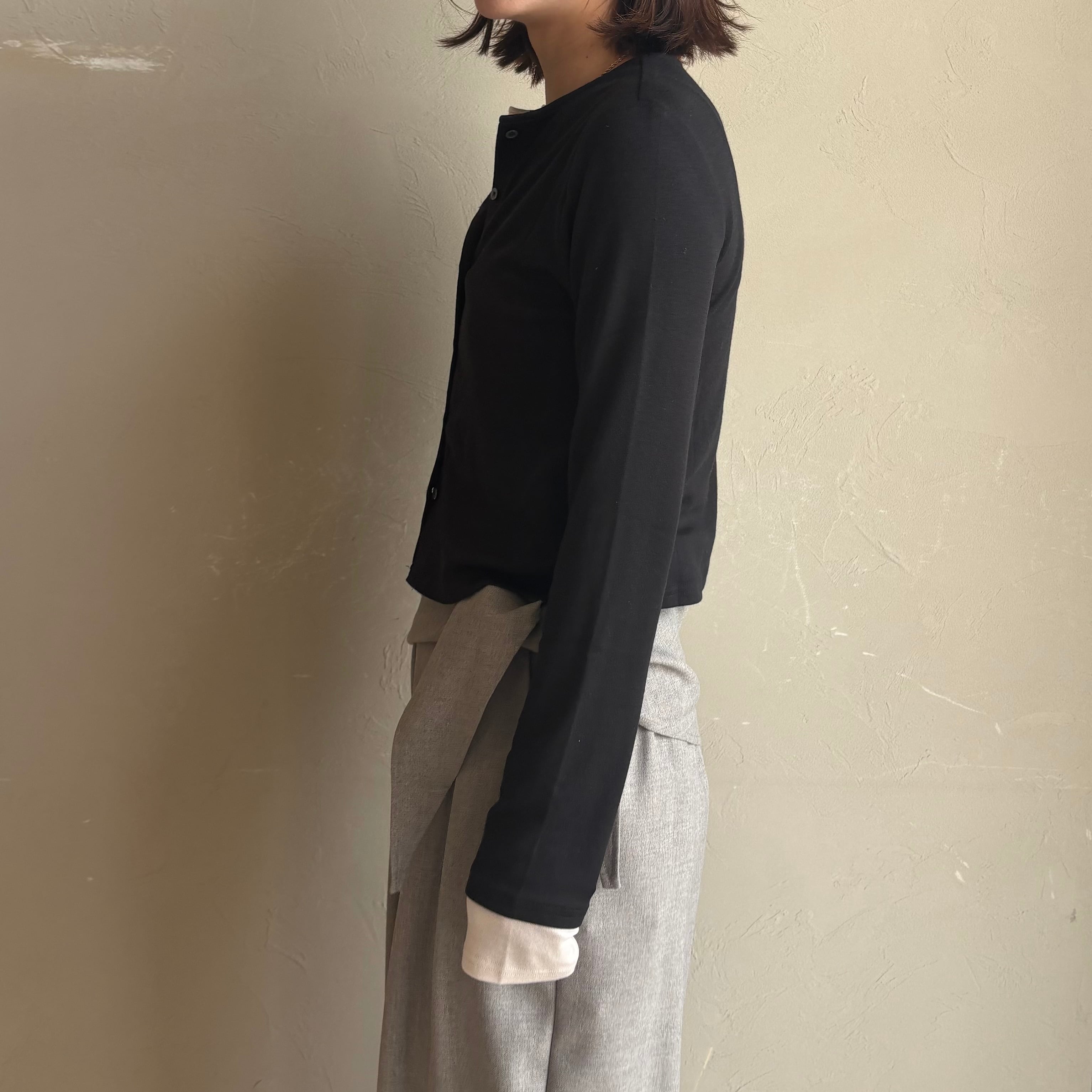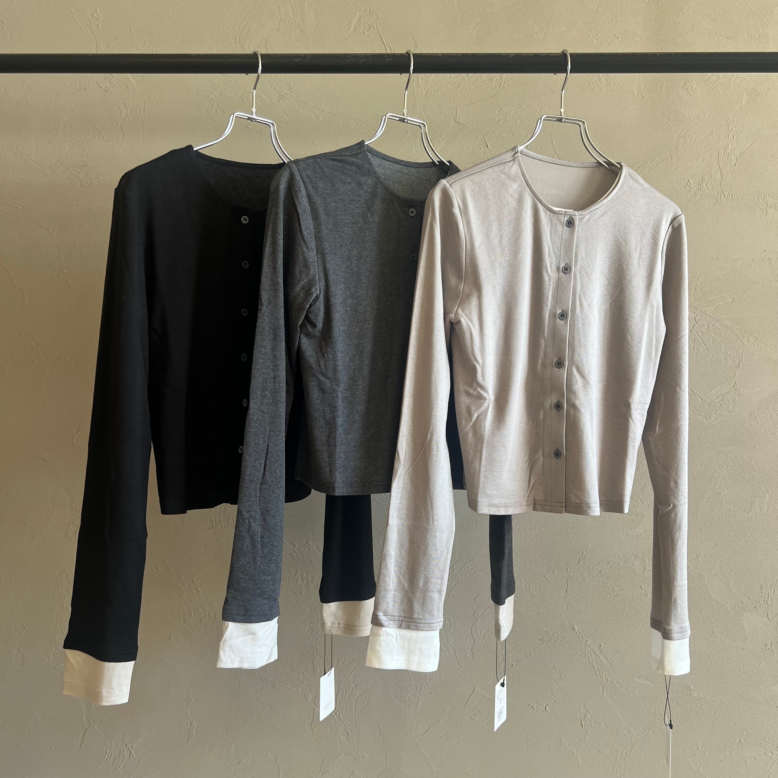 【CLOCHE レイヤードライクカットカーディガン】は重ね着しているように見える前立て&袖口のディテールで、1枚で“奥行きのあるスタイリング”が完成。