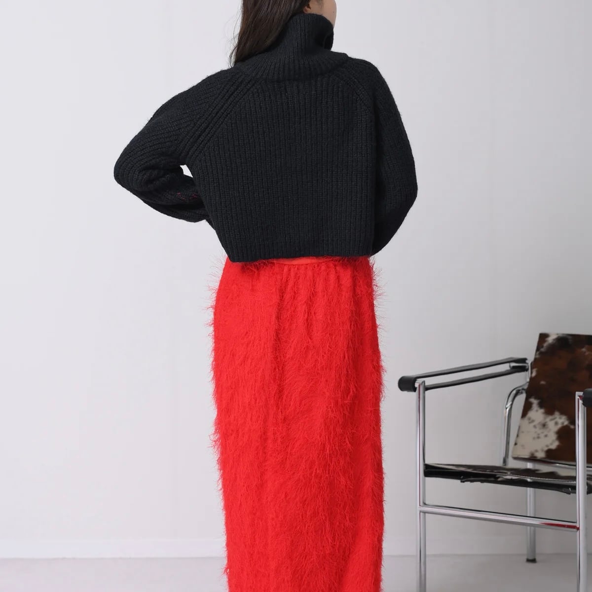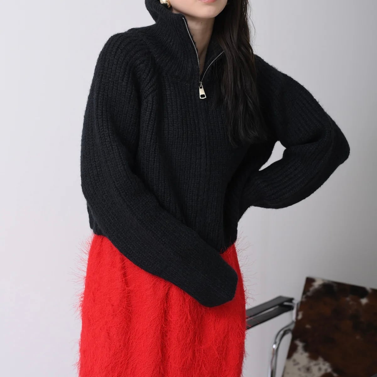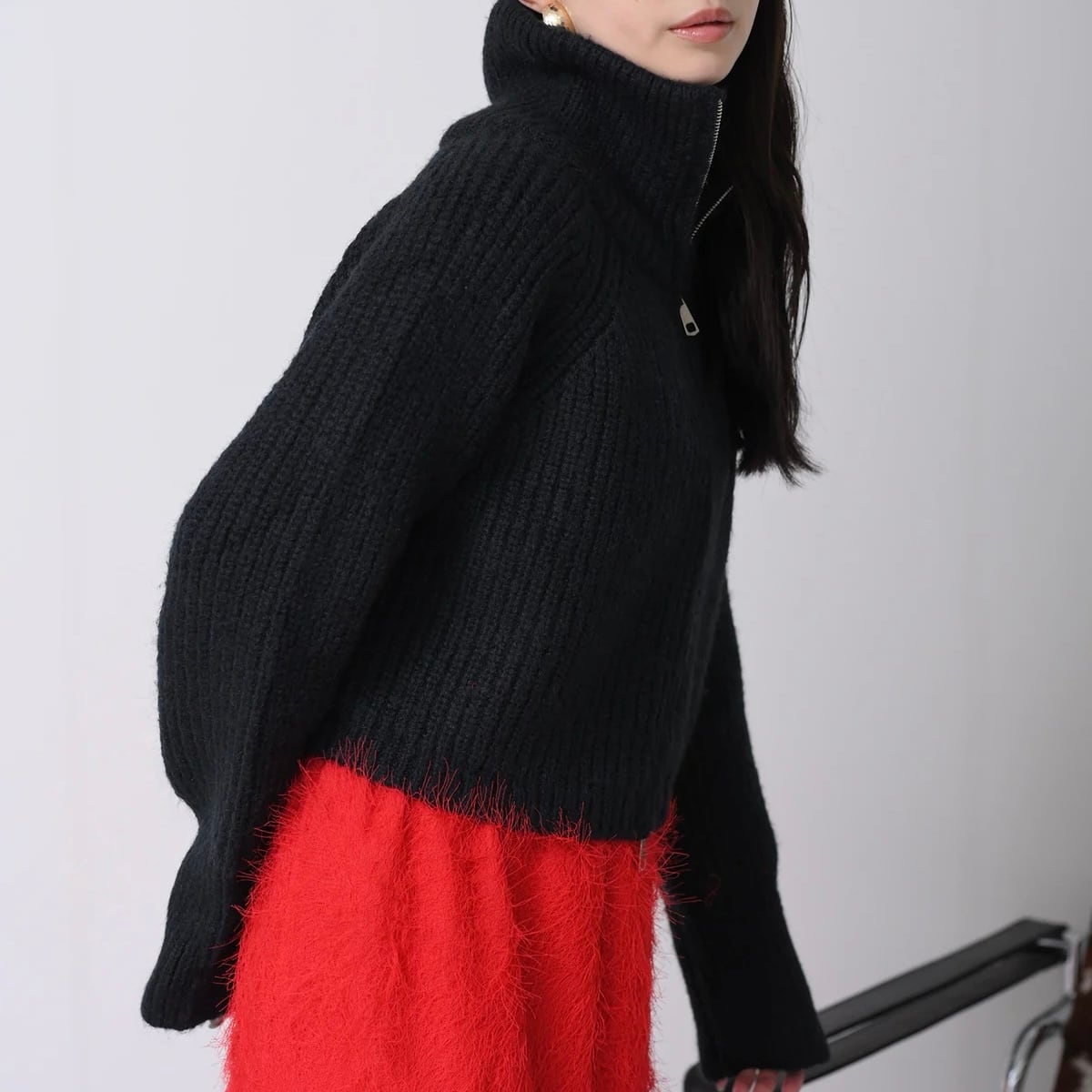 【HERENCIA】チャンキージップアップニットジャケットは、ふわっと包み込むチャンキーニットに、顔周りをすっきり見せる立ち上がりネックが魅力。