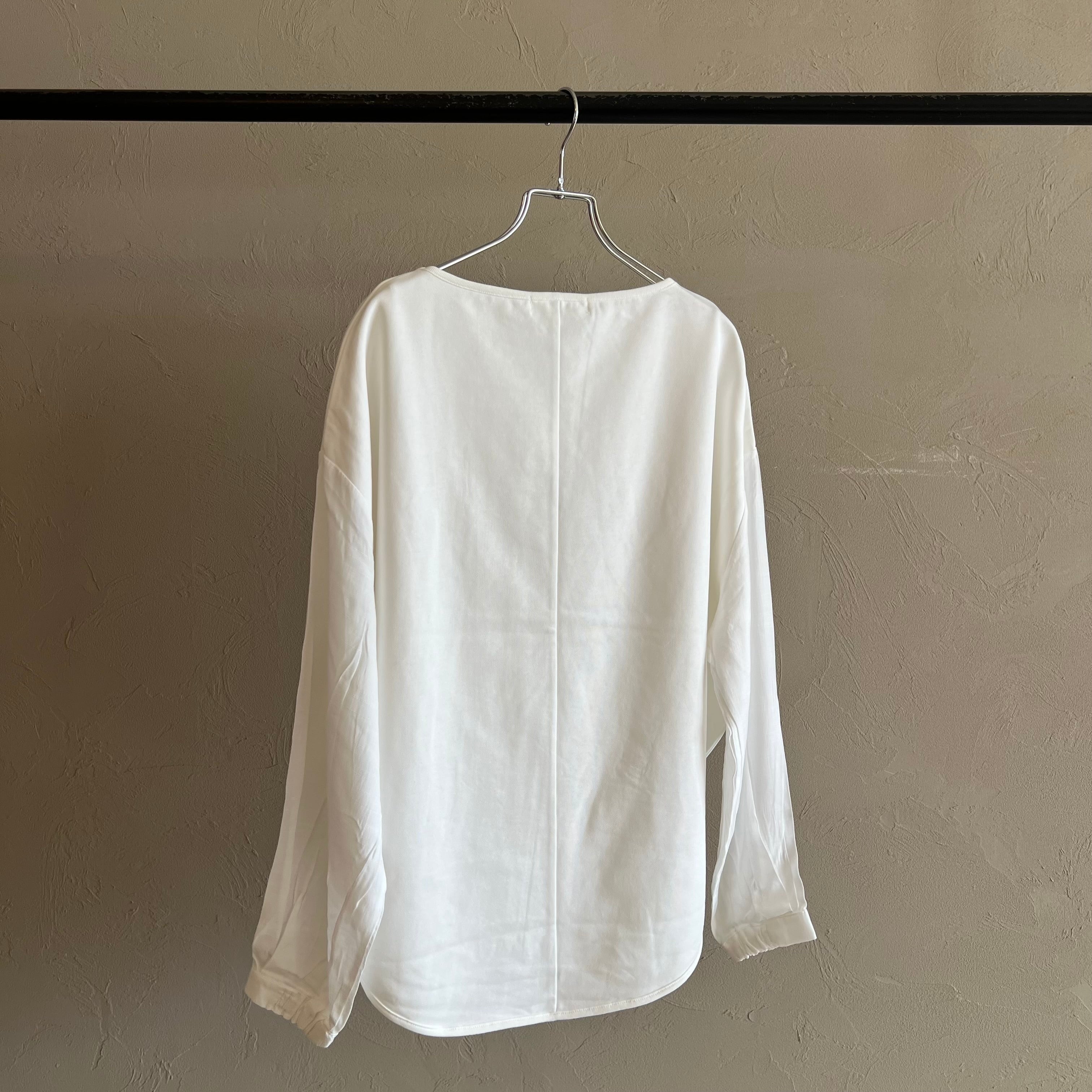 ドレープ感のあるゆったりとしたシルエットが特徴。袖は落ち感のある同色の光沢素材で切り替え、アイキャッチなデザインに仕上げています。袖口はゴム仕様で、肘まで上げて着こなすことも可能です。