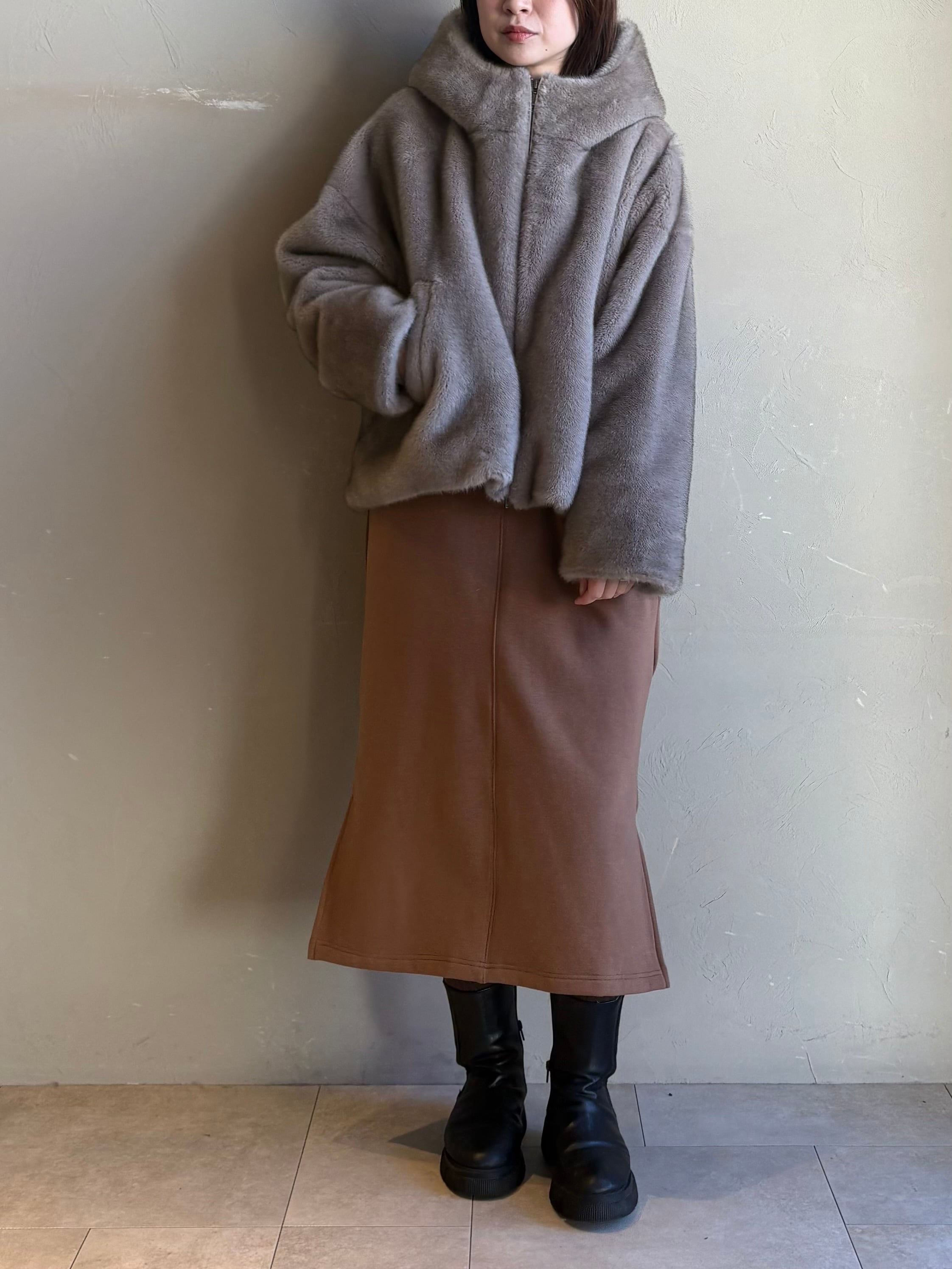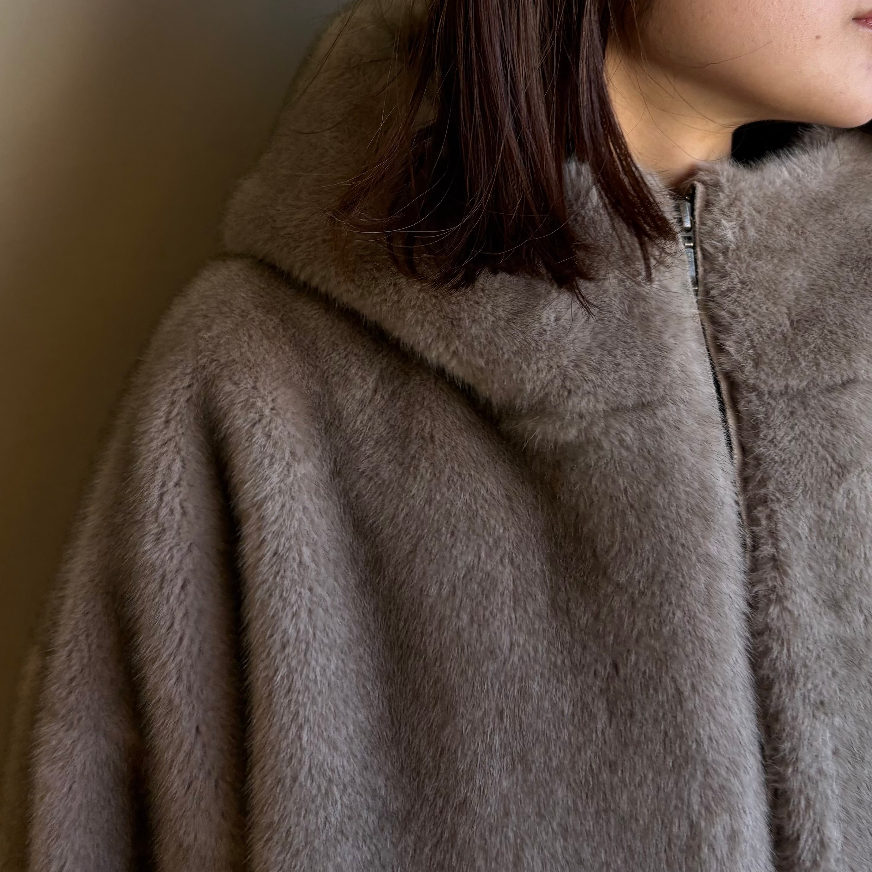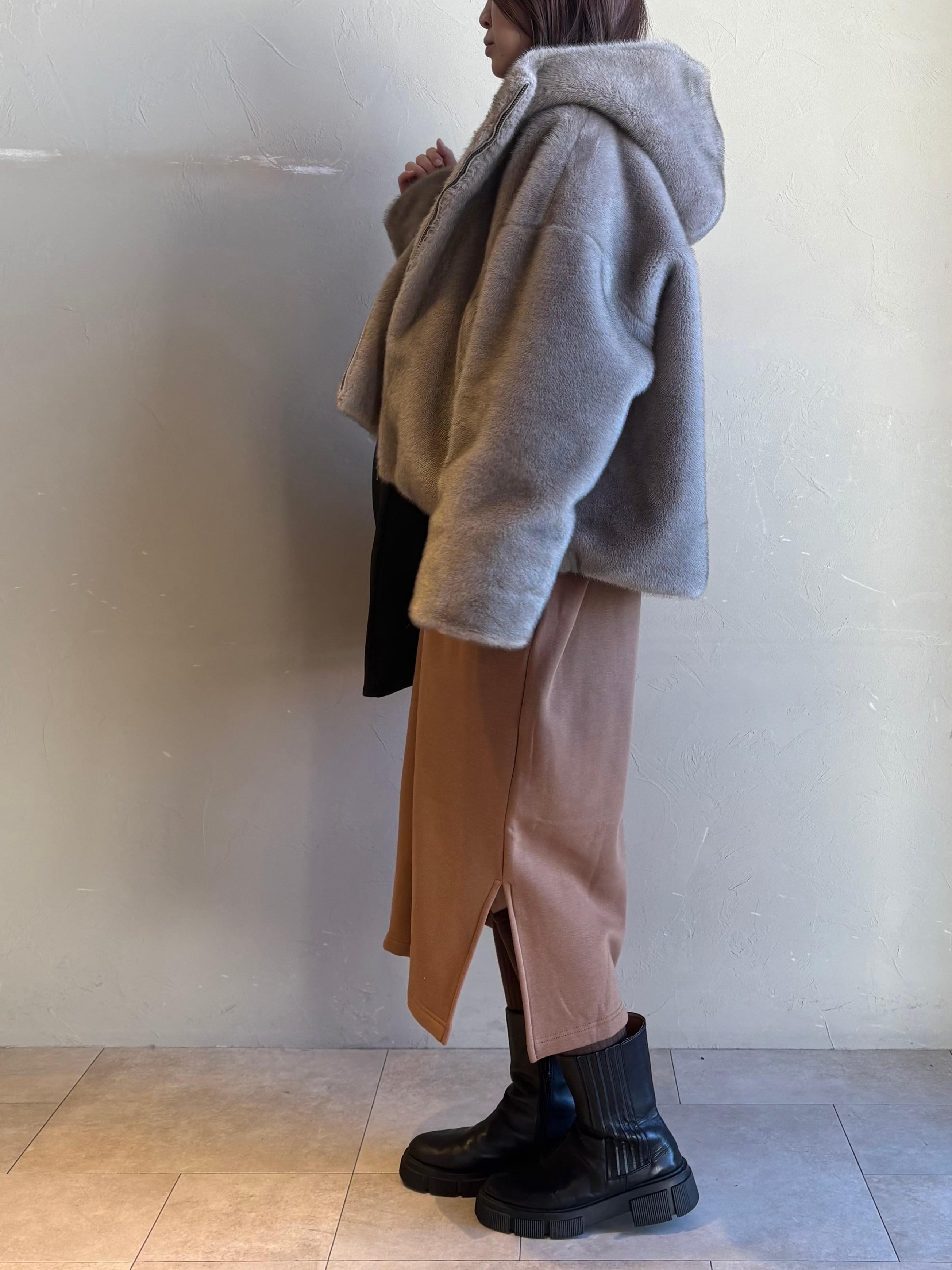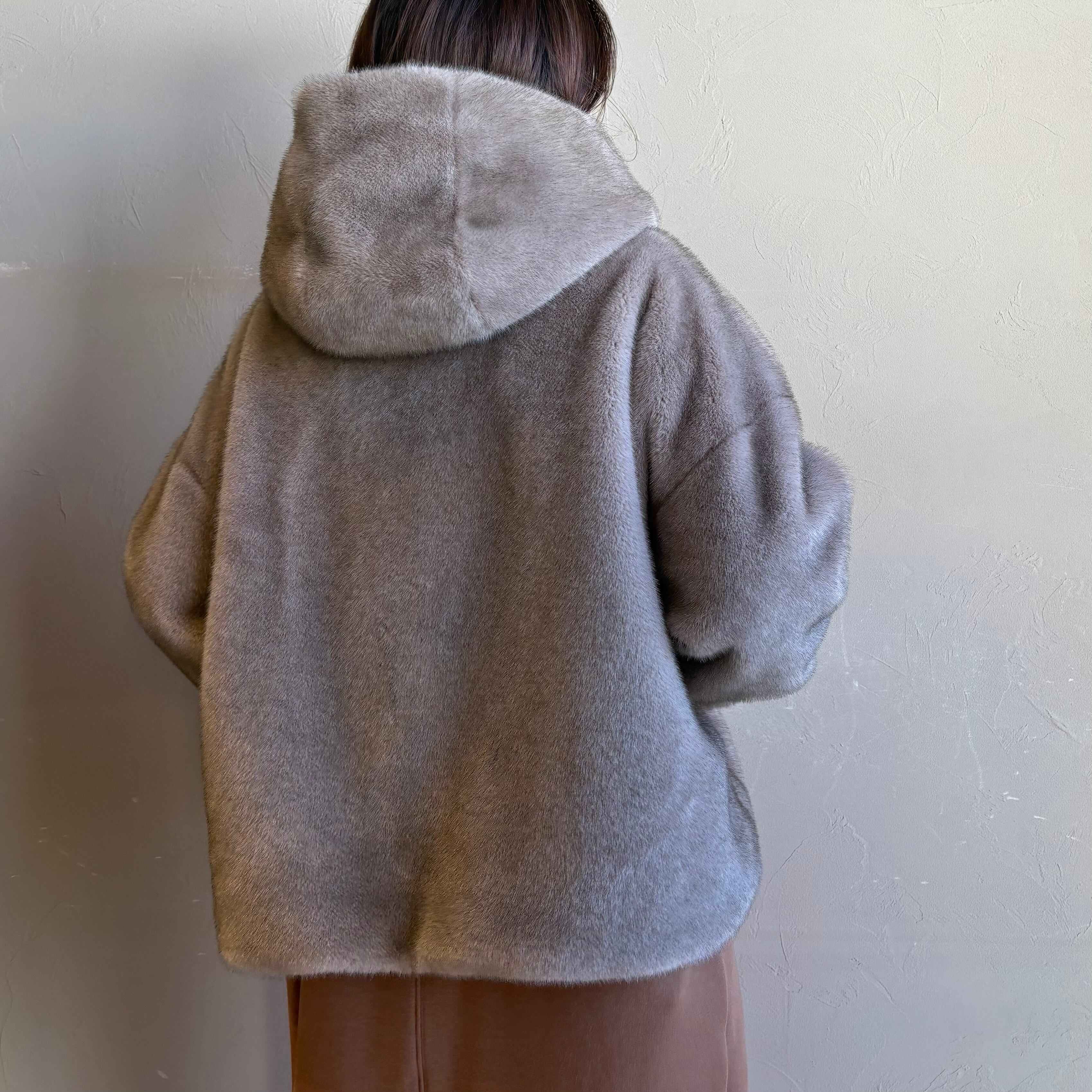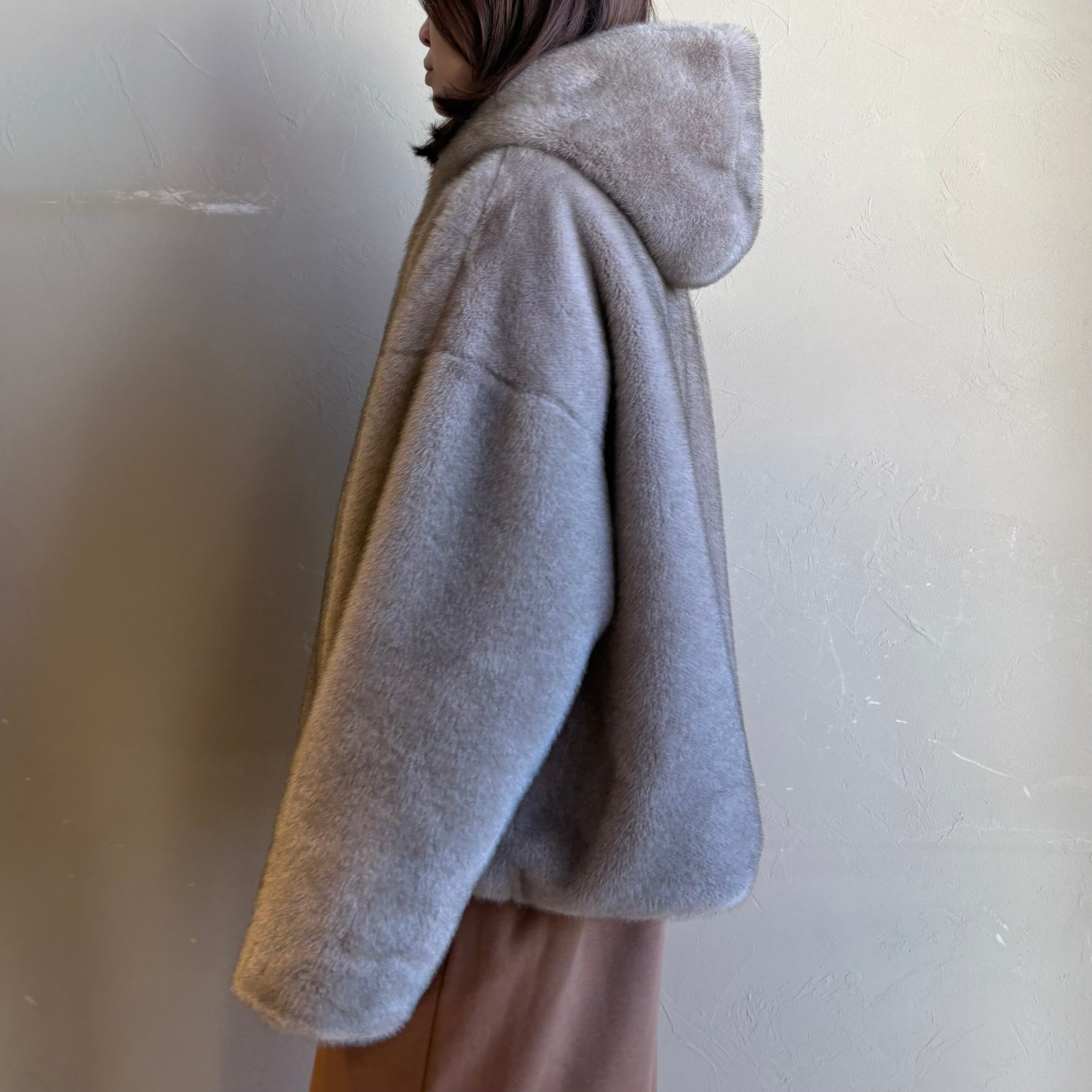 ミンクのような独特のツヤと色の深みが特徴のエコファーを使用したフーディのショートコート。