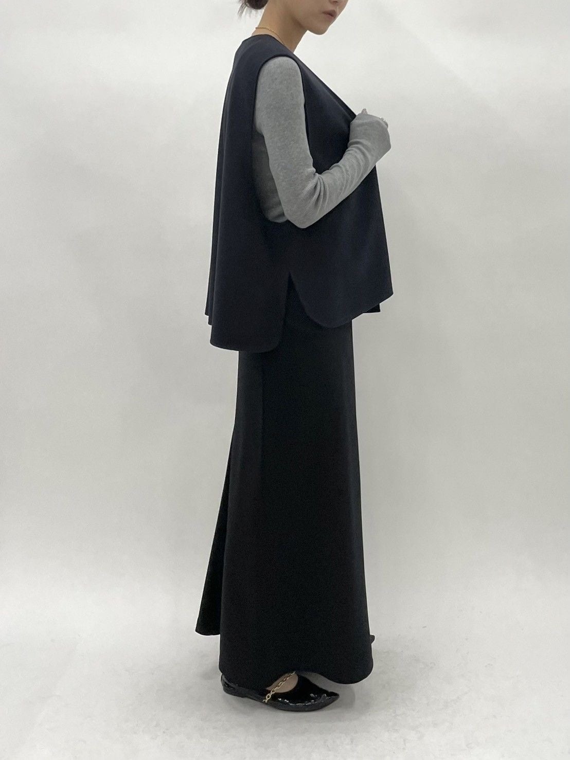 Vネック×まっすぐなラインが縦長効果を生み、気になる腰まわりもほどよくカバーします。