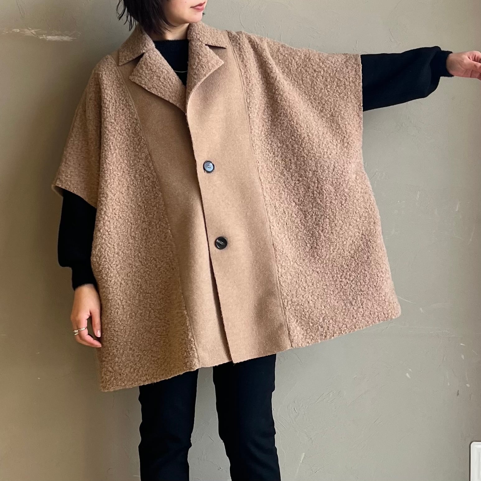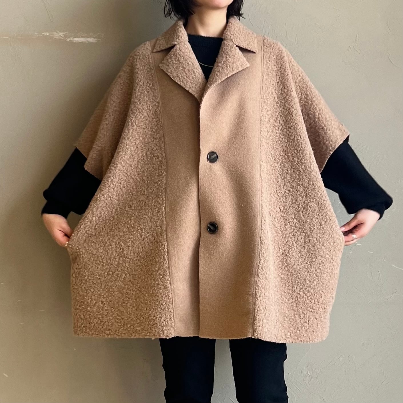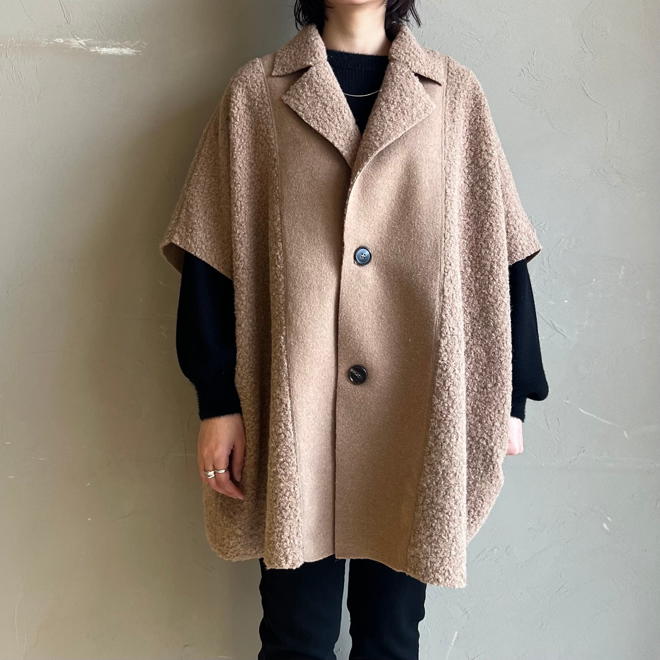 肩周りゆったりのケープシルエットが体型を上手にカバーし、厚手ニットの上からもOK。