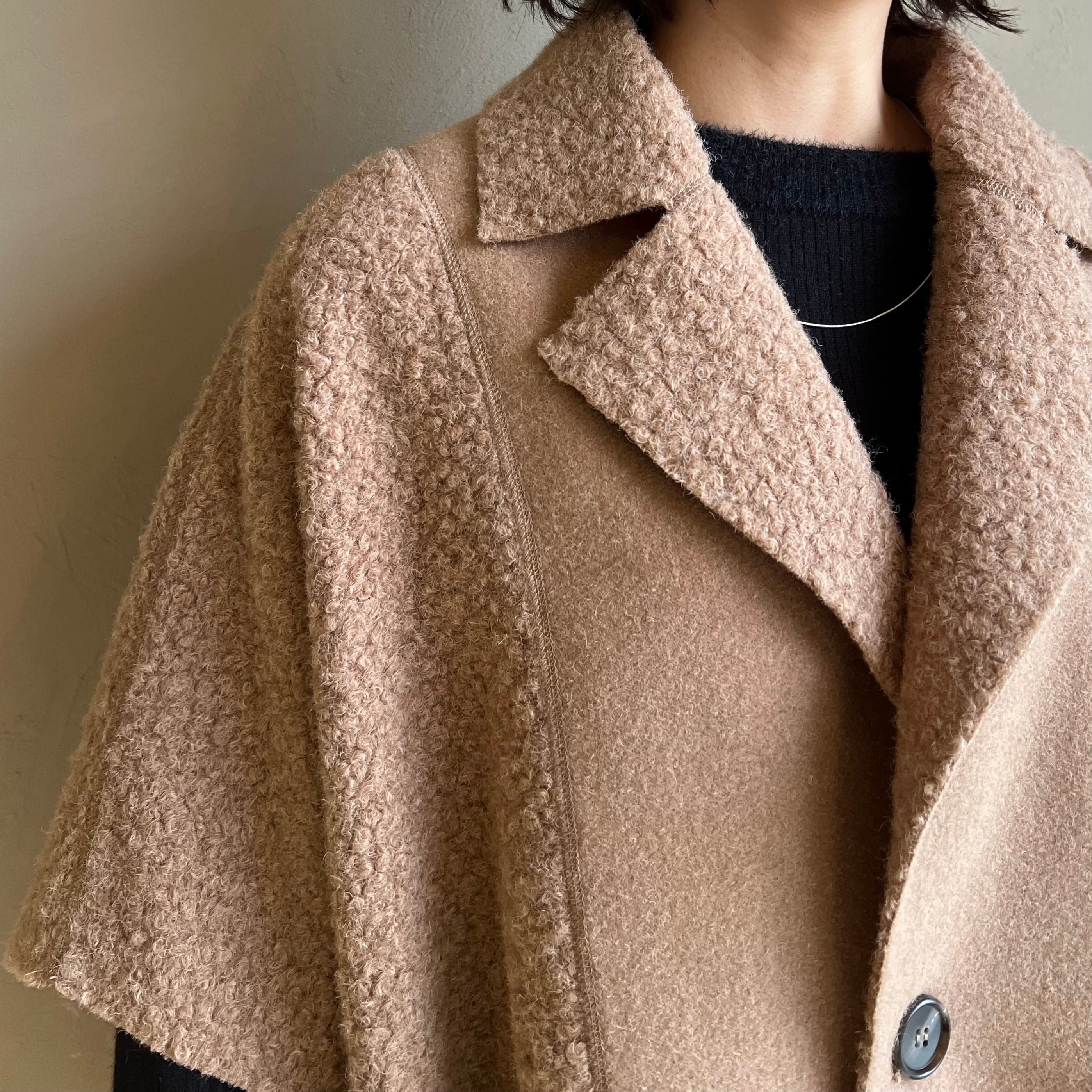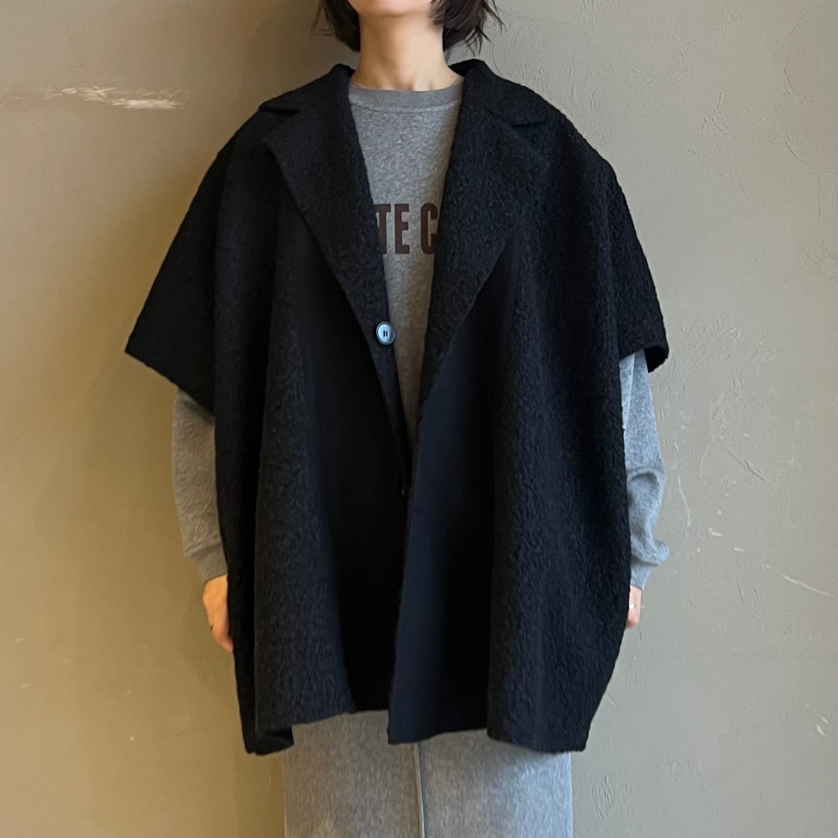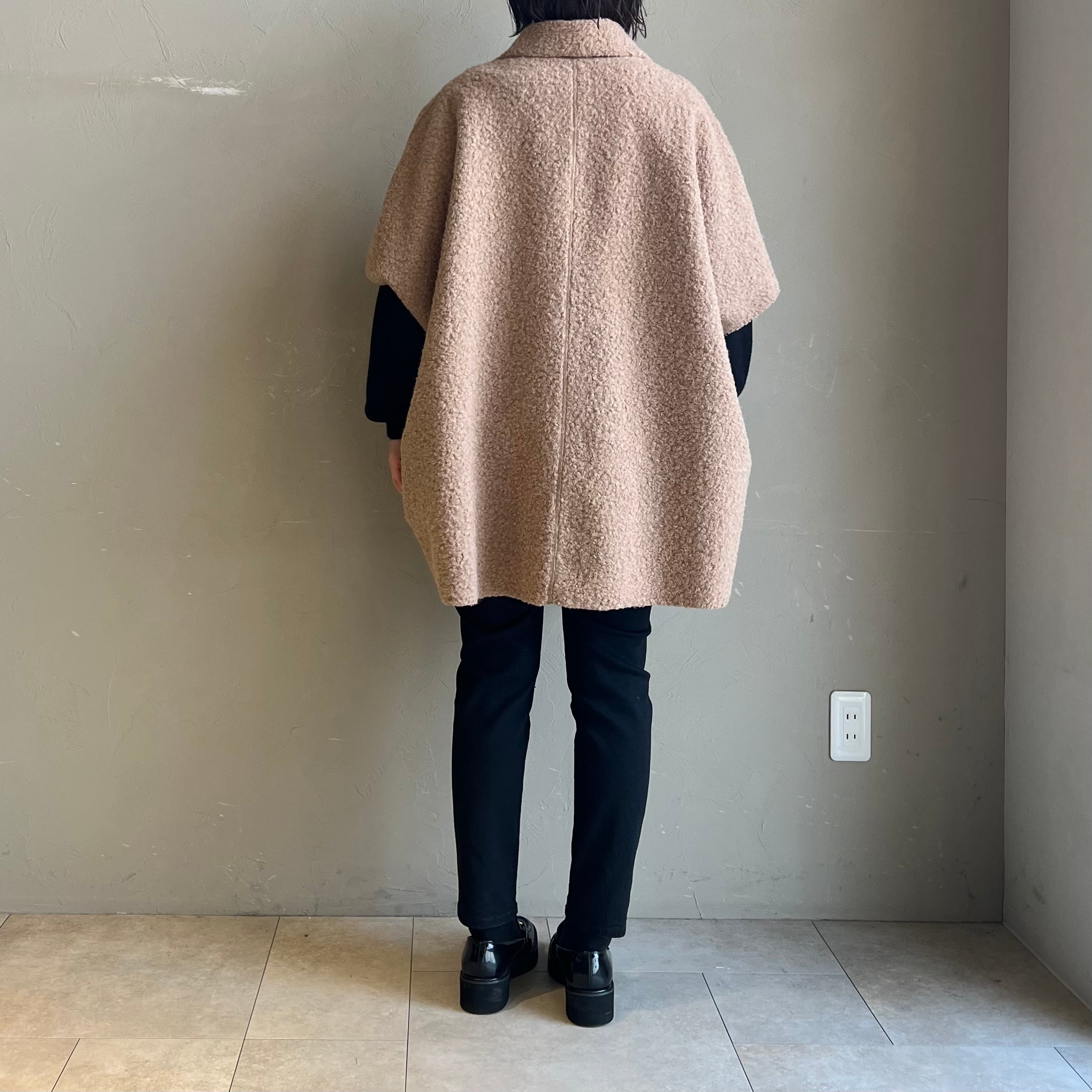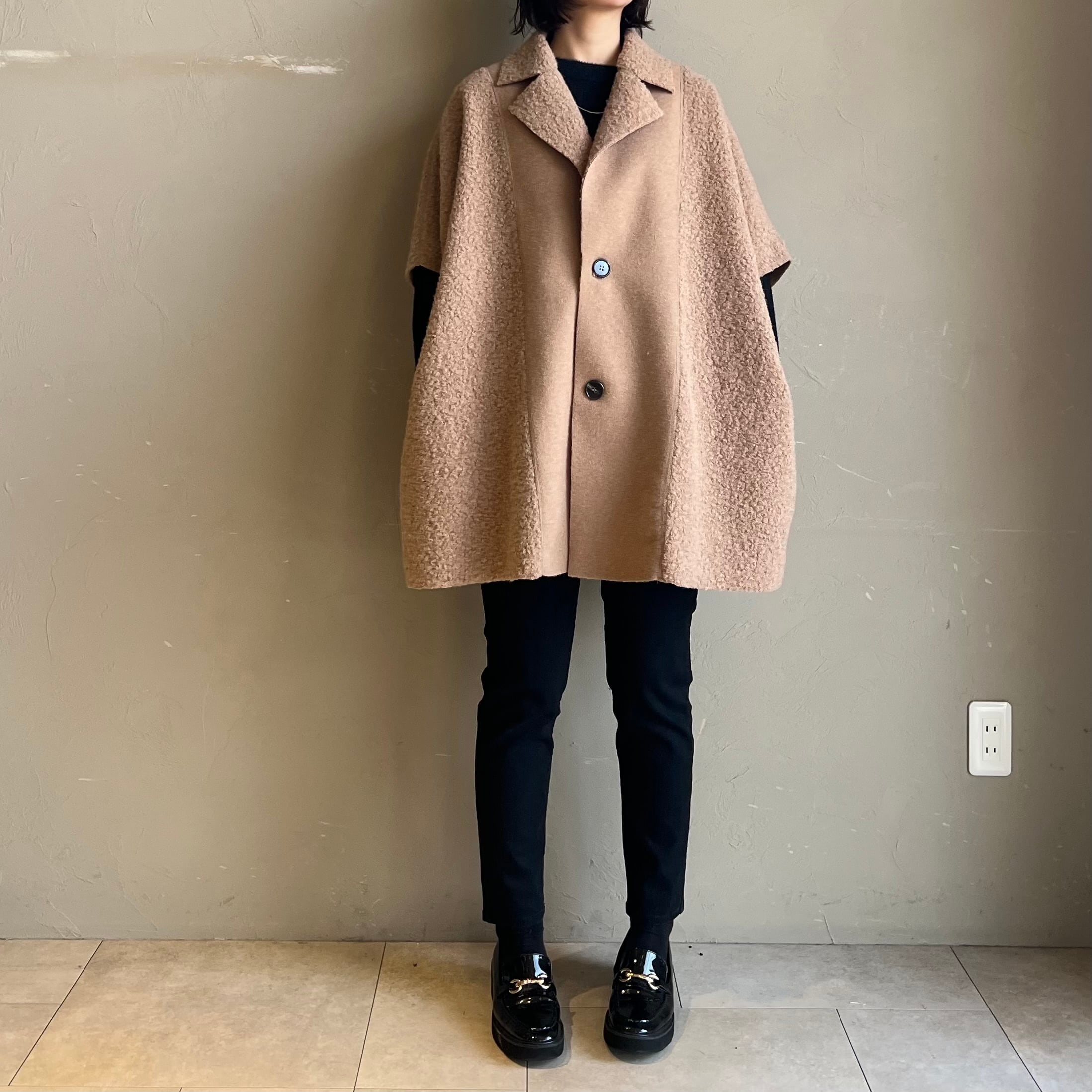 肩周りゆったりのケープシルエットが体型を上手にカバーし、厚手ニットの上からもOK。
