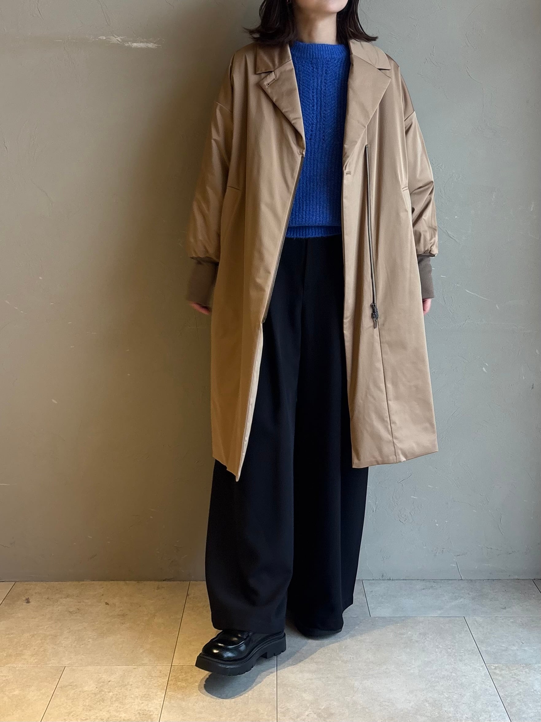 LIMONTAx中わたで仕上げた、ハリ感のあるウェザー素材のロングコート。
