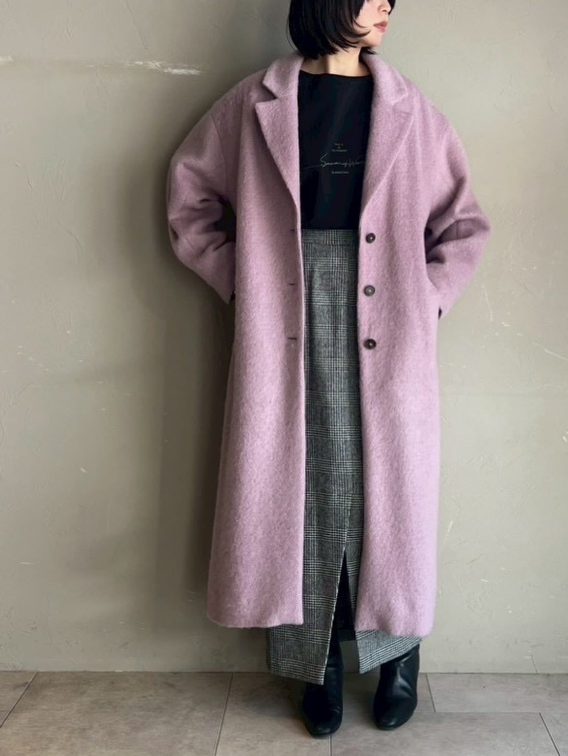CLOCHEのロングコートは軽くて暖かい毛足のあるウール混シャギー素材を使用。