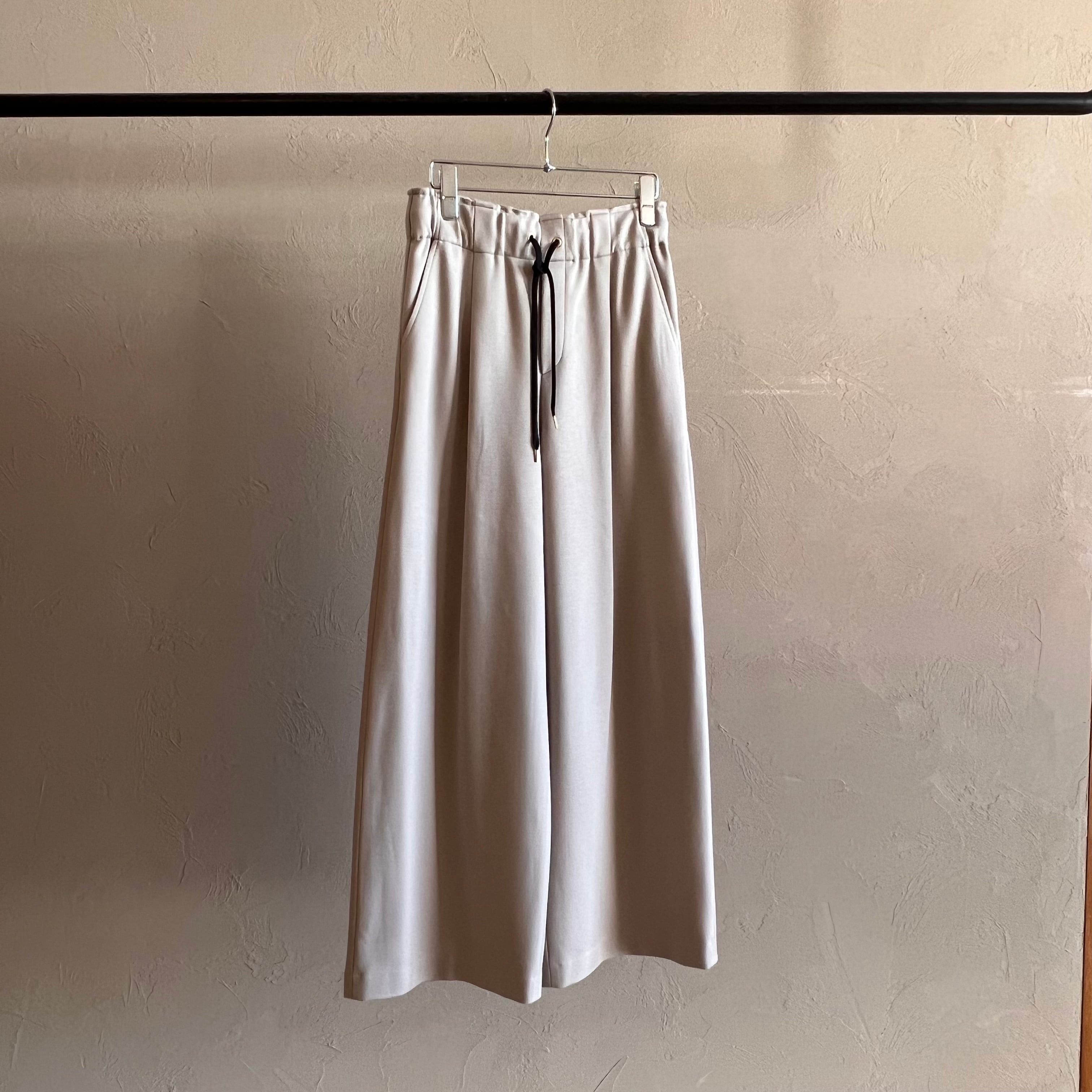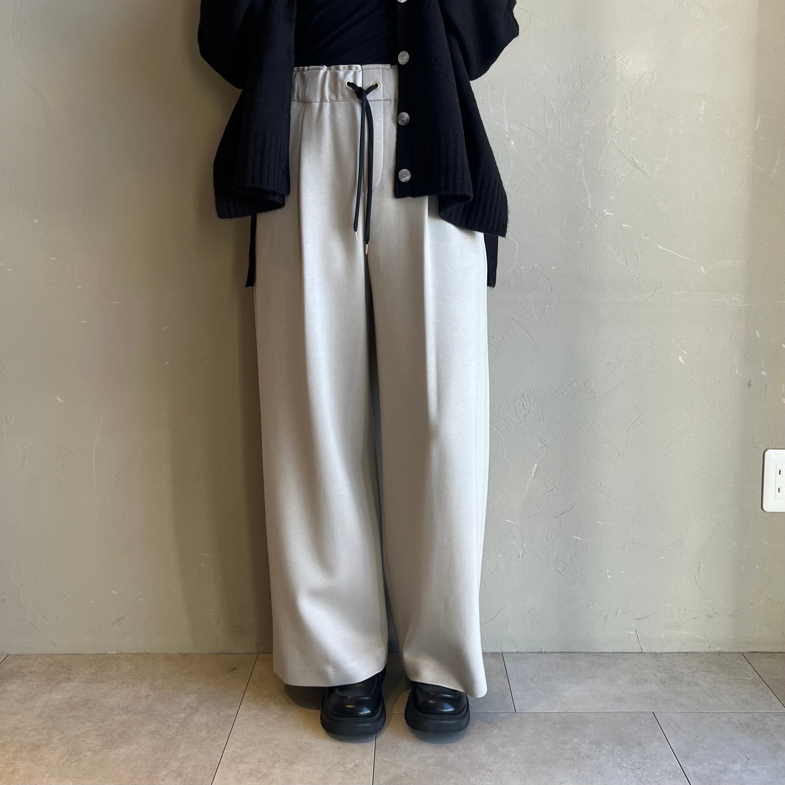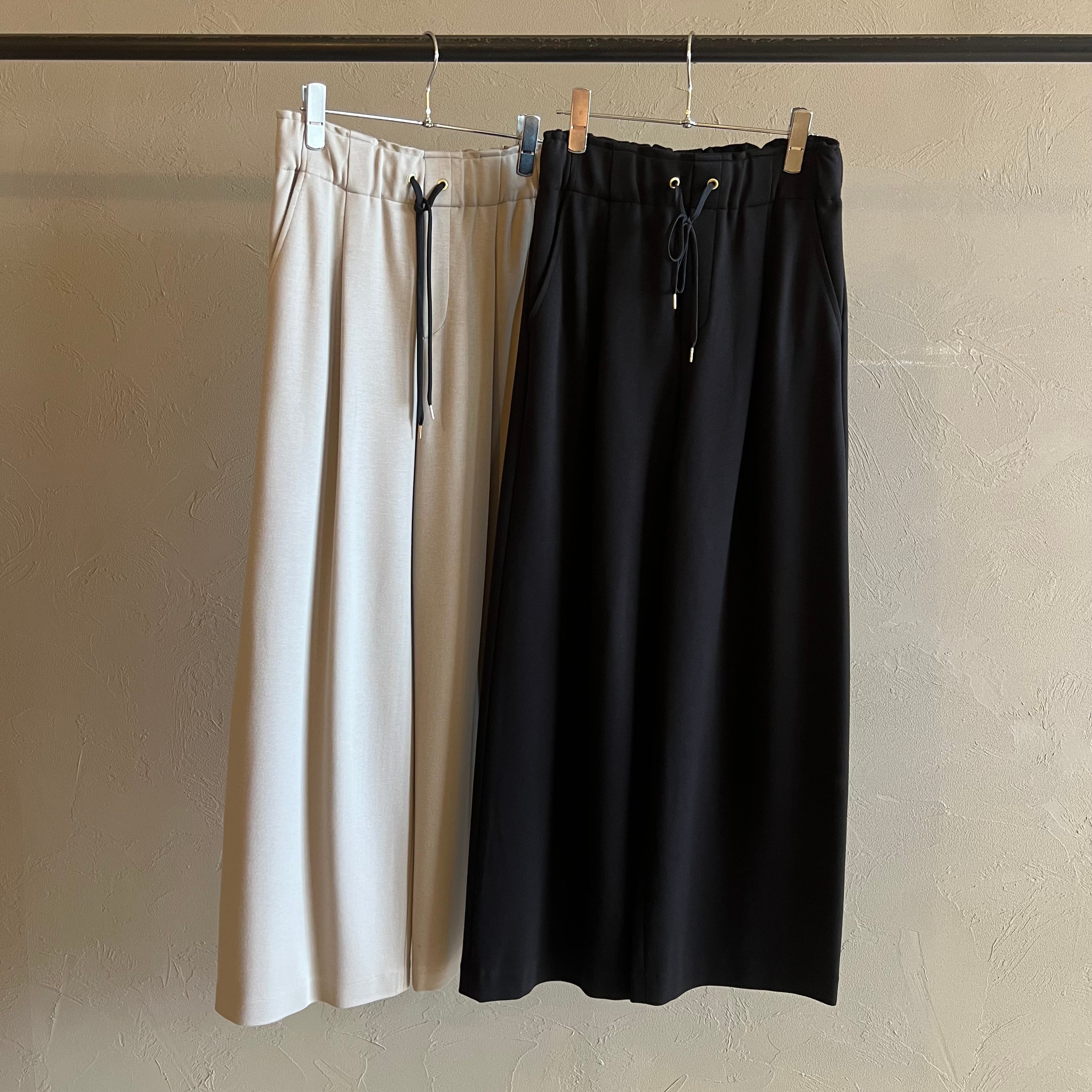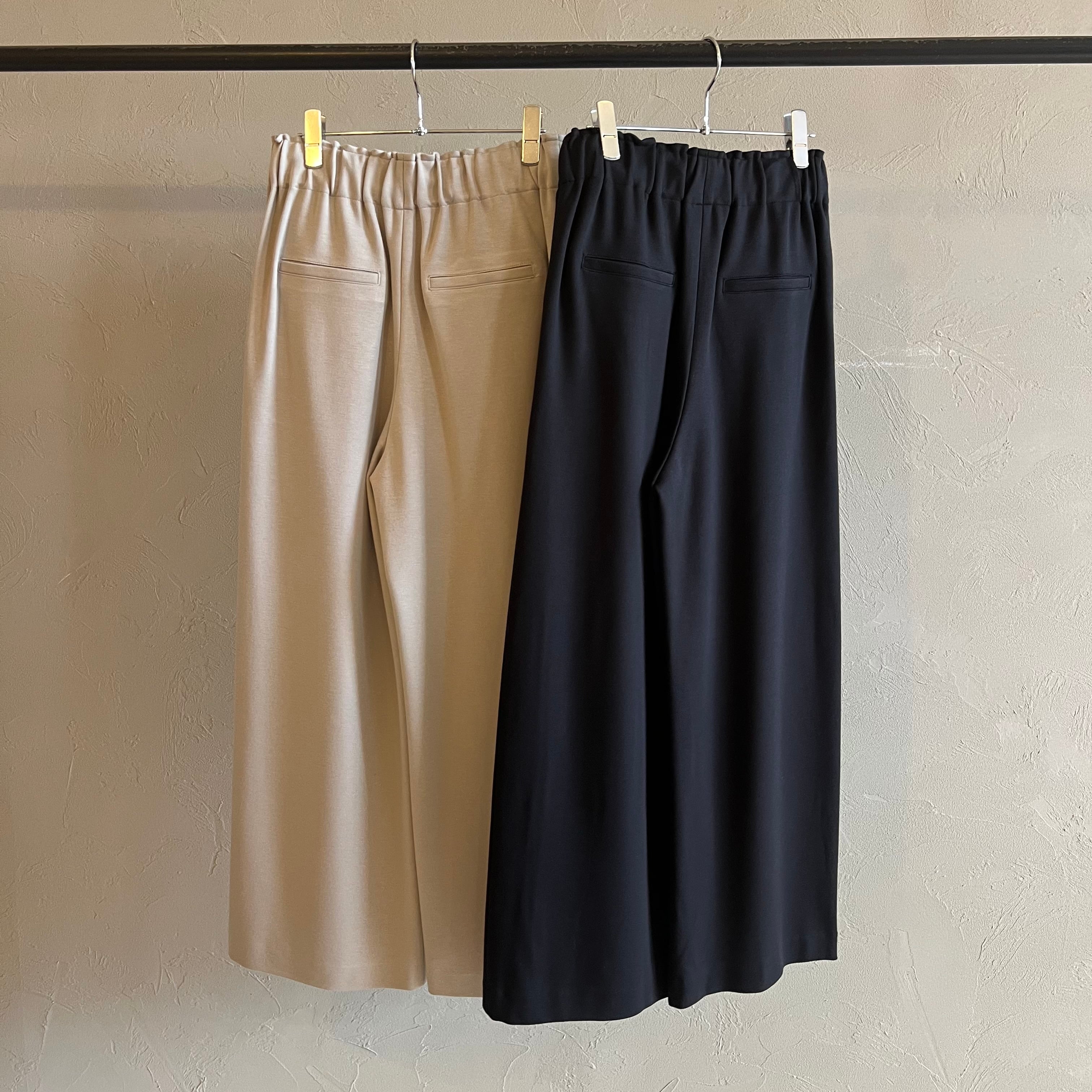 外気が肌寒い時期でも、心地よい温かさを持続させますが、ハリ感と柔らかさがあり、落ち感のあるストレッチ抜群のジャージ素材のストレッチワイドパンツです。