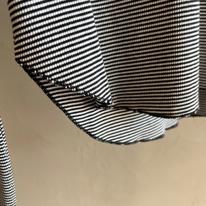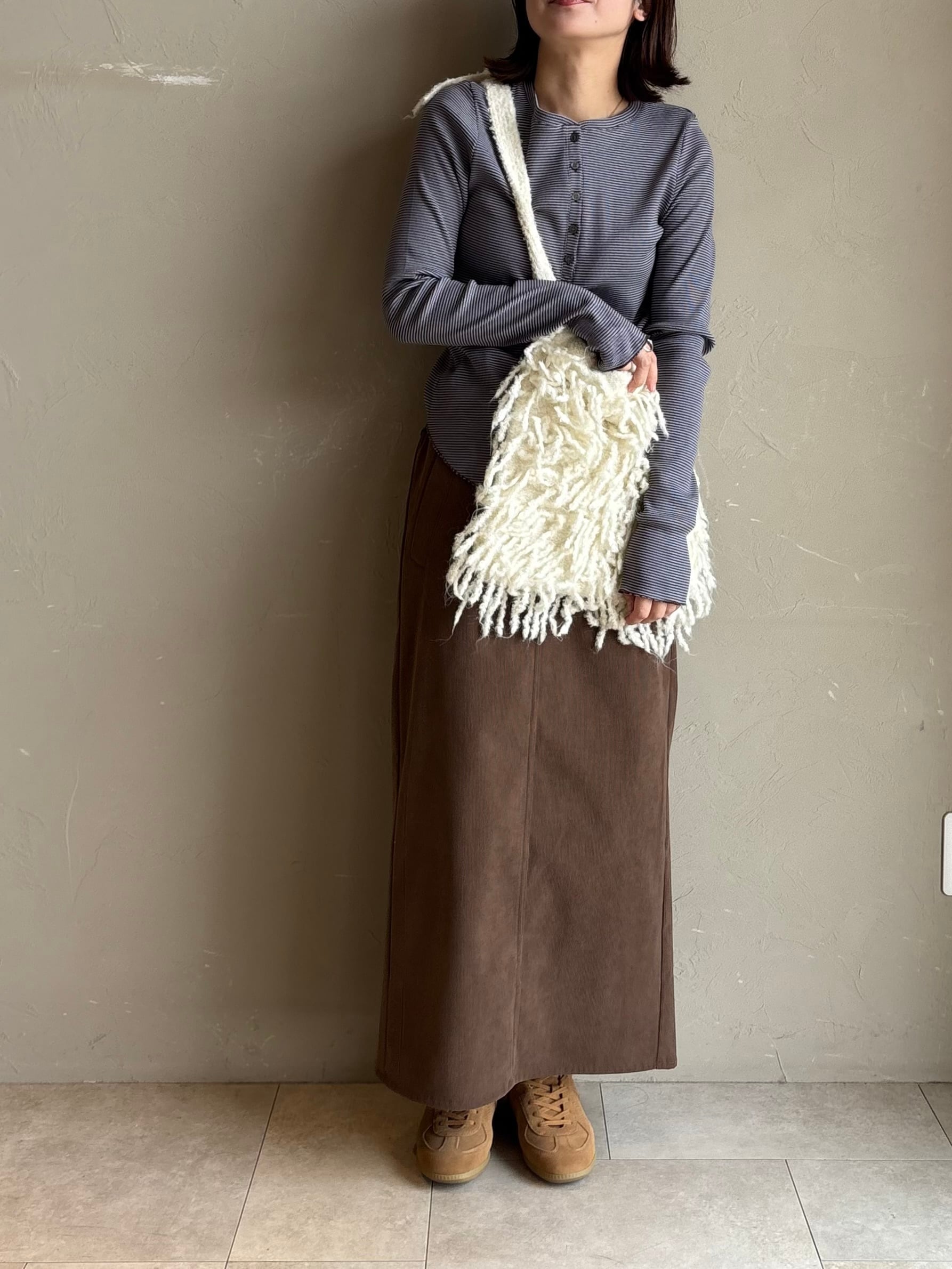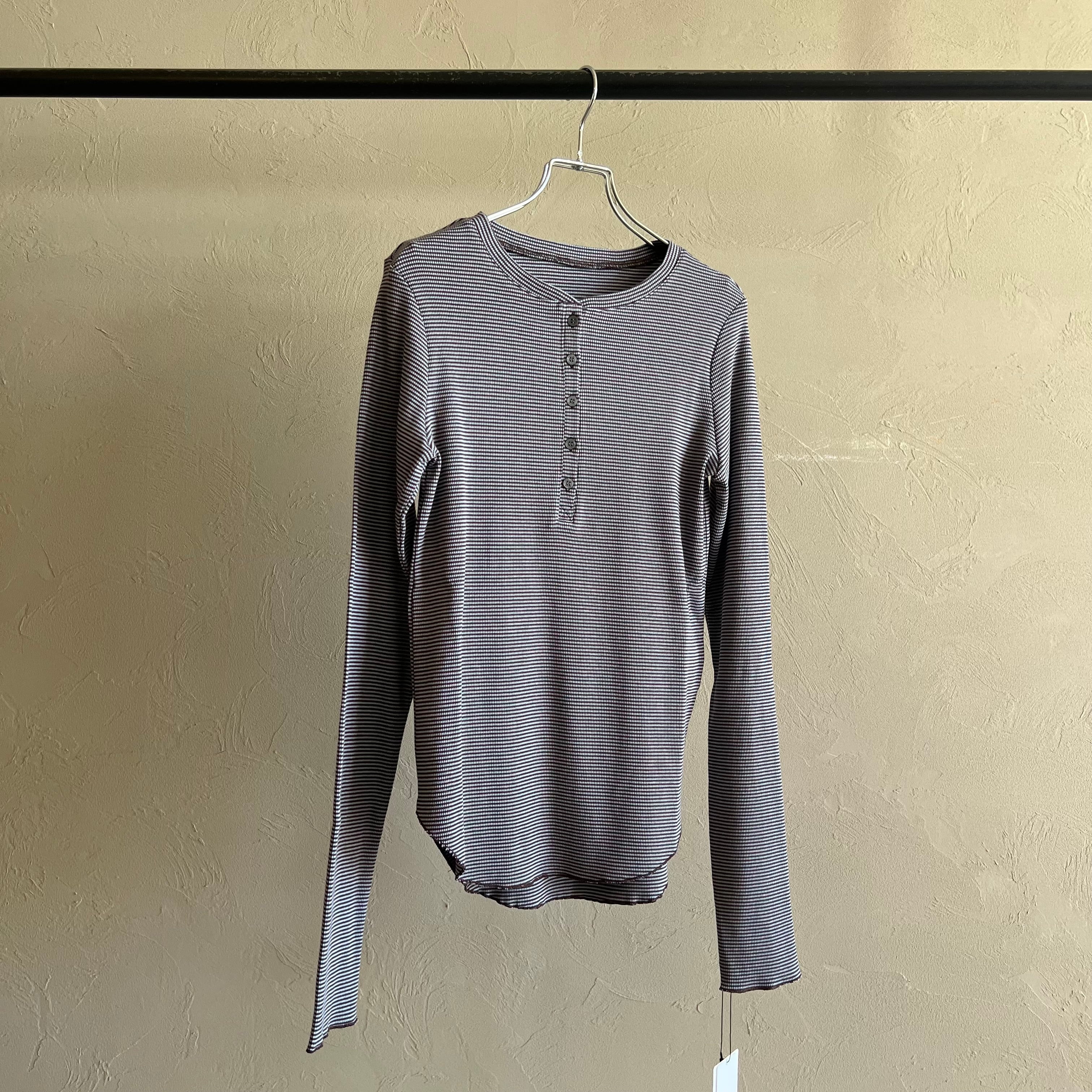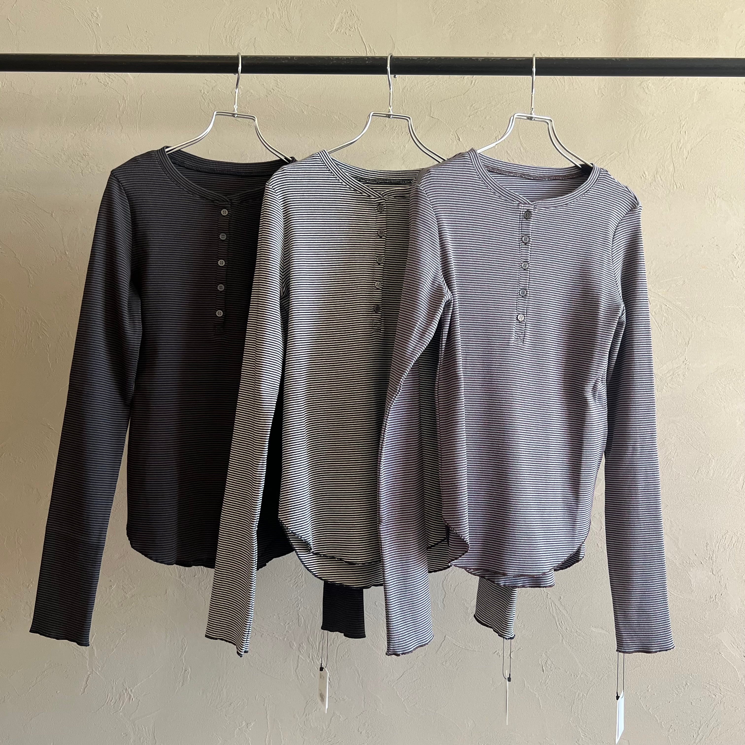 【CLOCHE ボーダーヘンリートップス】は微細ボーダー×ヘンリーネックが顔まわりをすっきり。