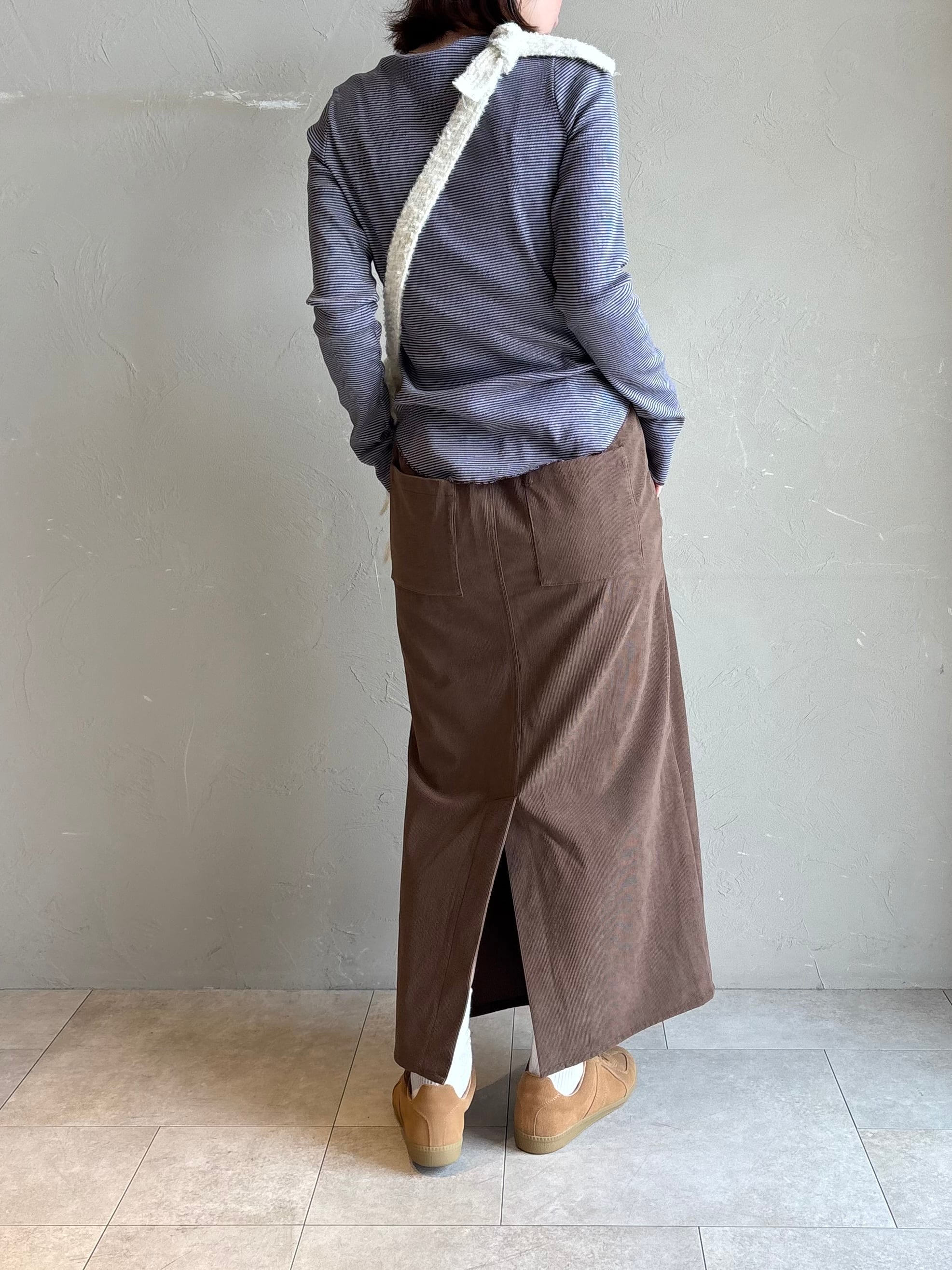 伸びやかなコットン混リブが優しくフィットし、ラウンドヘムが腰位置を高く見せて自然に体型カバー。