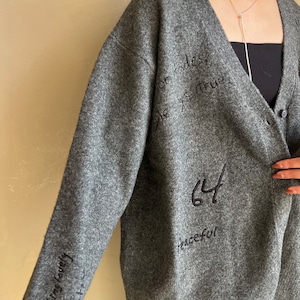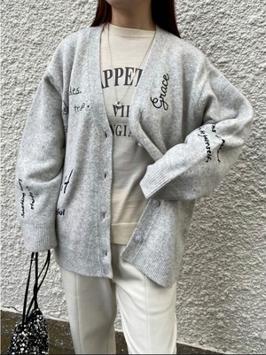 ロゴ刺繍やコード刺繍で沢山のレタリングをたっぷりと施したニットカーディガンです。