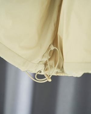 太巾の前立てとボタンディテールもポイント。裾はゴムコード入りで、お好みのバランスに調節していただけます。