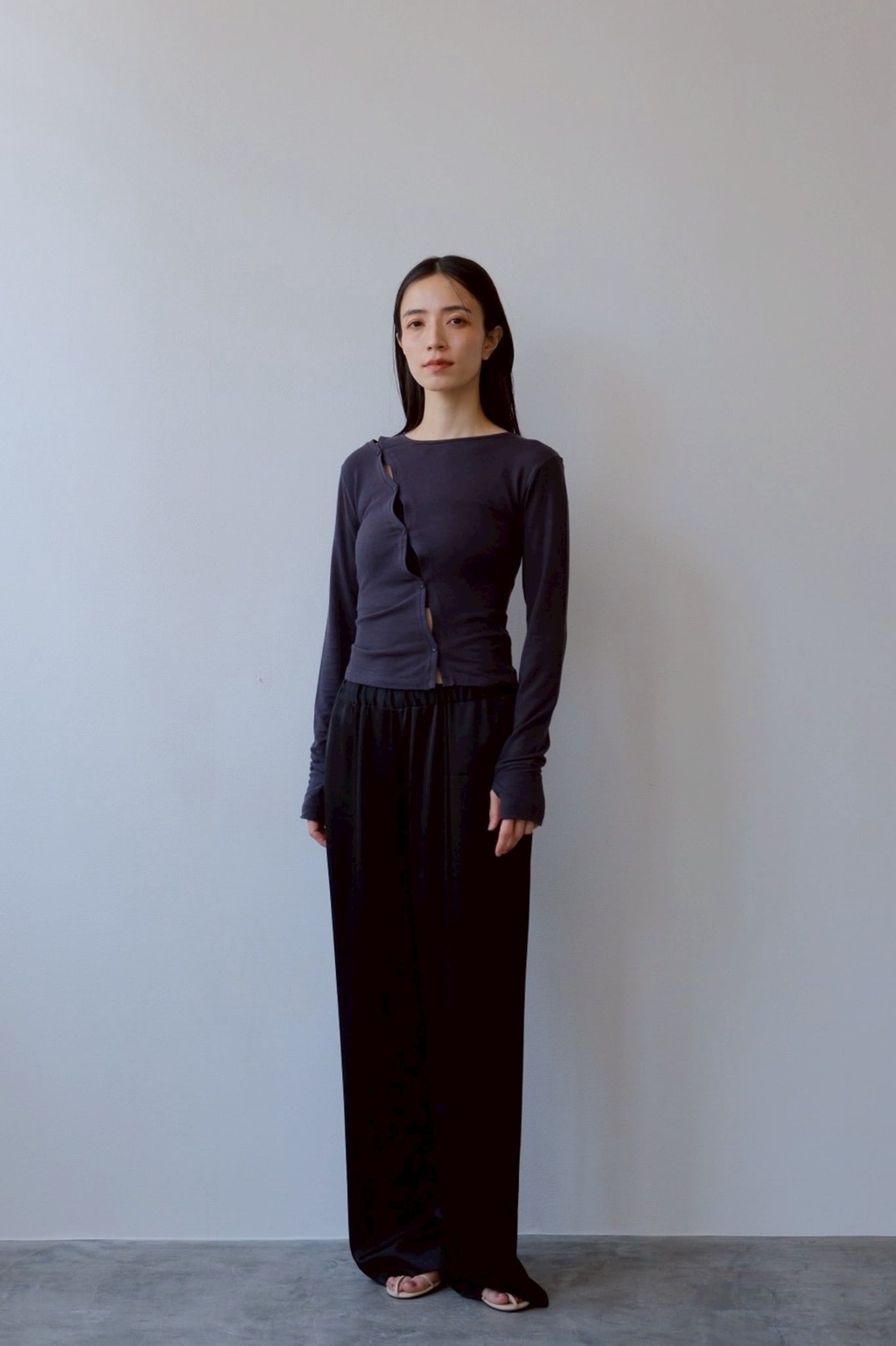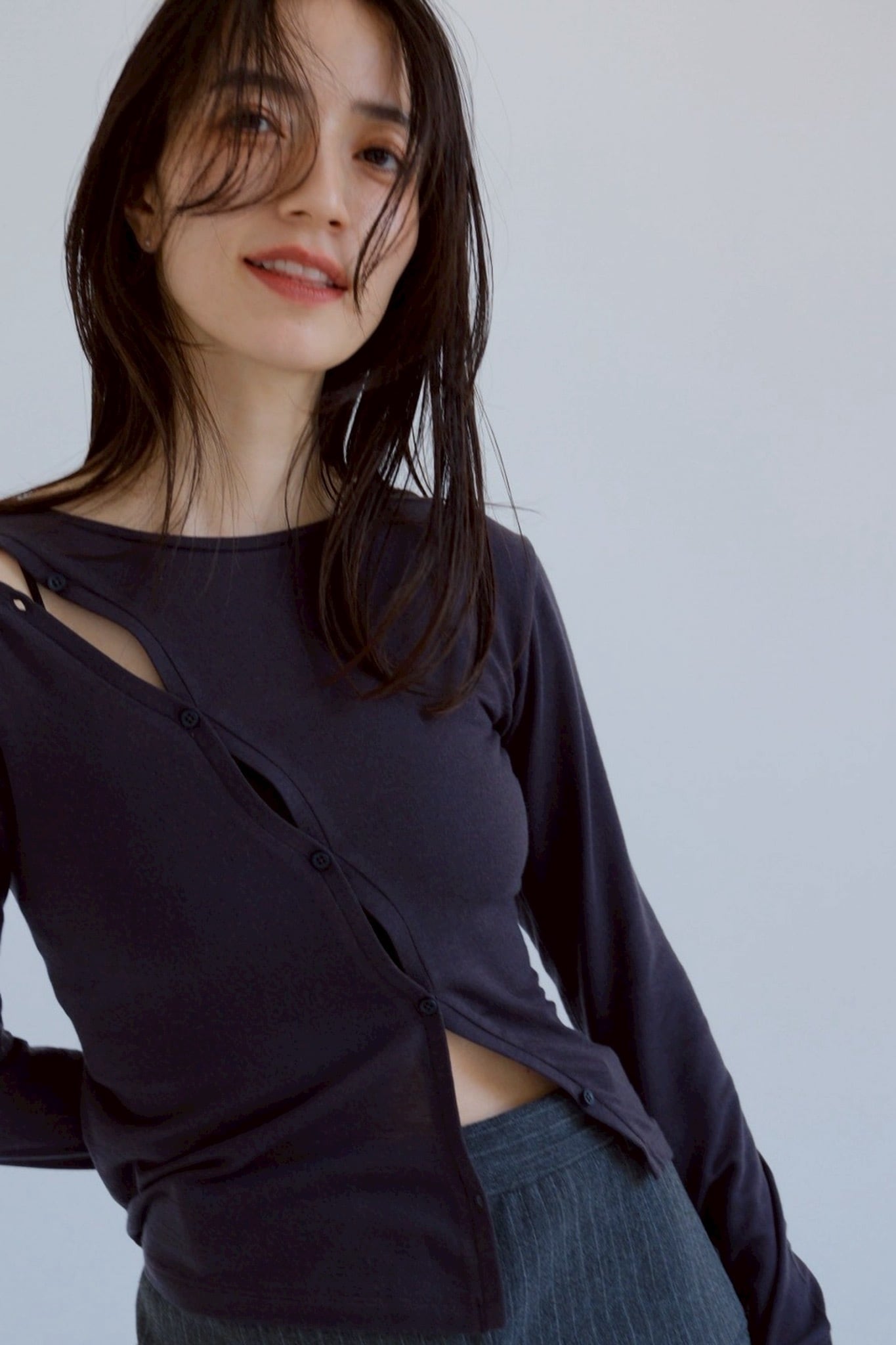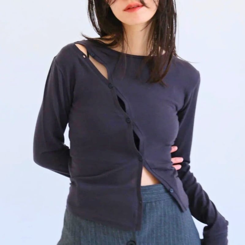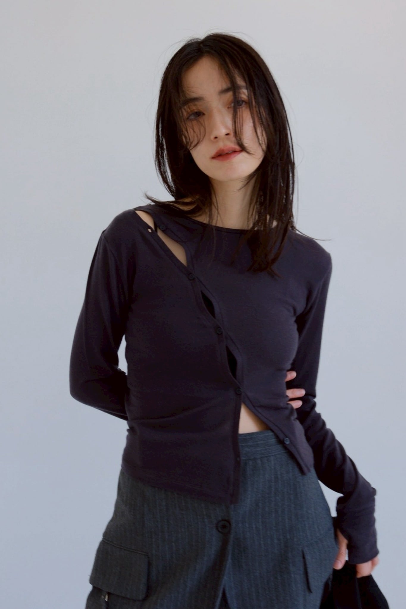 前身頃に配置した斜め開きのデザインがアクセントとなり、シンプルながらもモードなニュアンスを漂わせる一枚。浅めのボートネック風ラインがデコルテを美しく際立たせ、女性らしい印象を引き立てます。袖口には指空きのディテールを配置し、さりげない抜け感をプラス。やや短めの着丈は全体のバランスを取りやすく、スカートにもパンツにもスタイリングしやすいのが特徴。トップスとしてはもちろん、ジャケットのインナーとしても取り入れやすいデザインで、日常のスタイリングに洗練された表情を添えてくれるアイテムです。