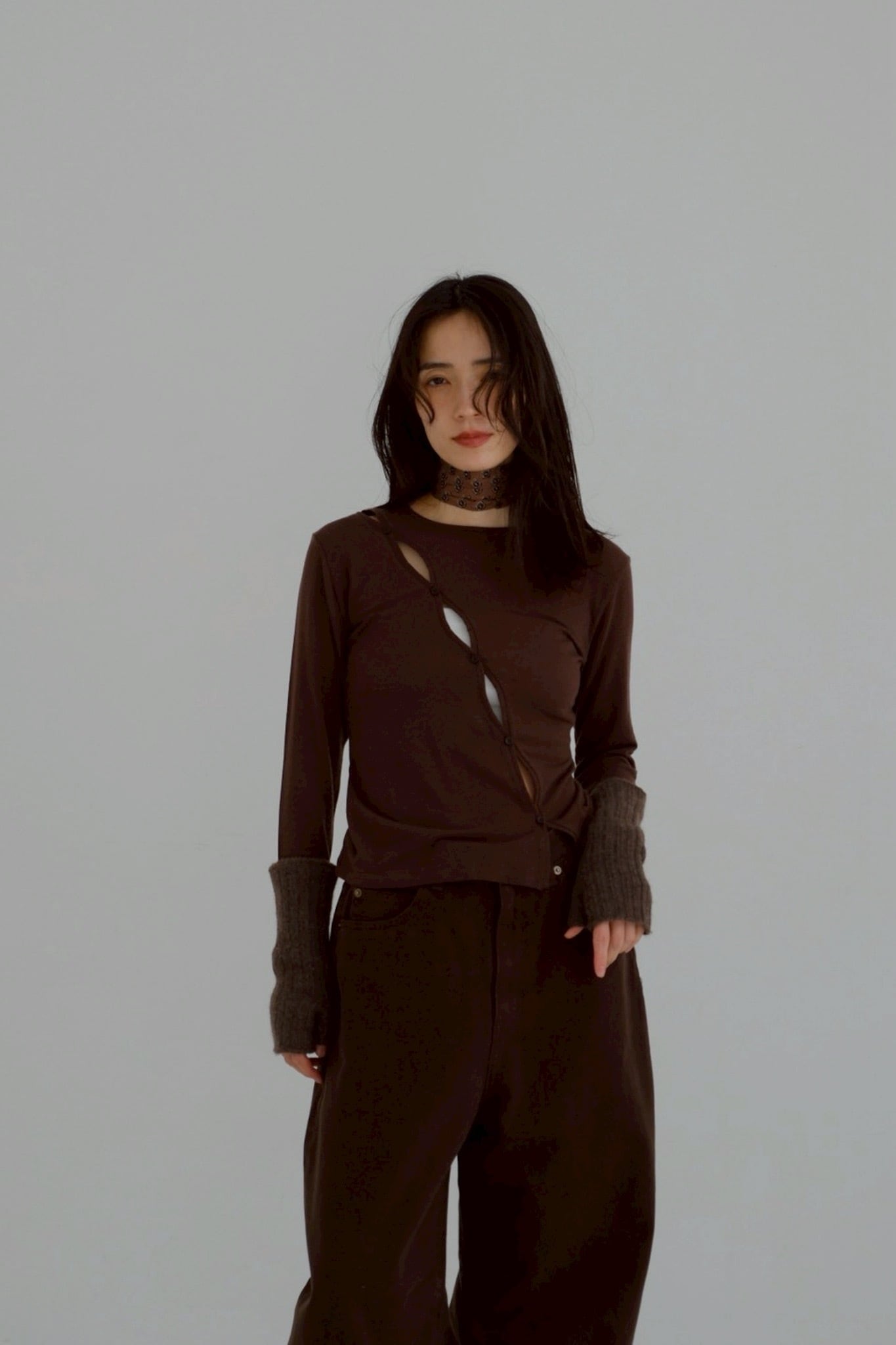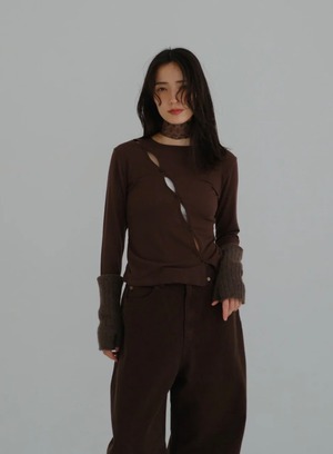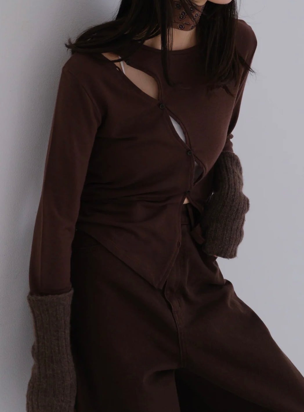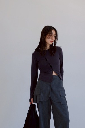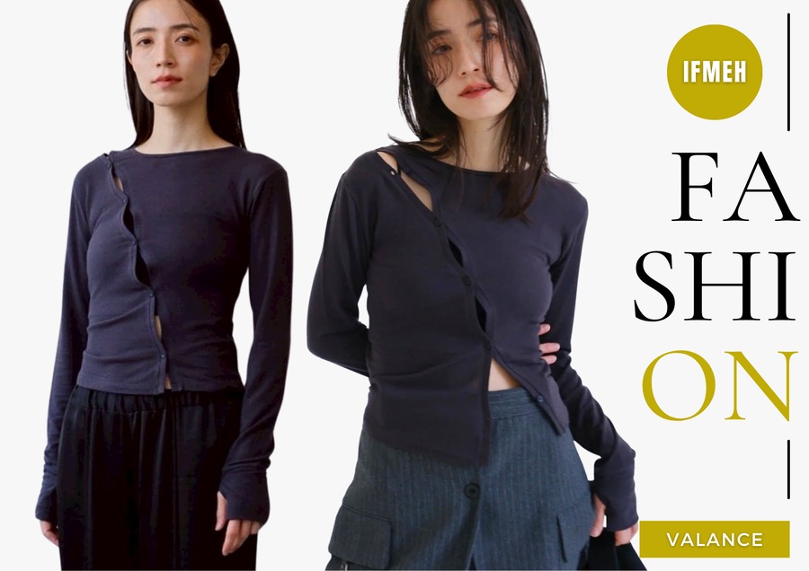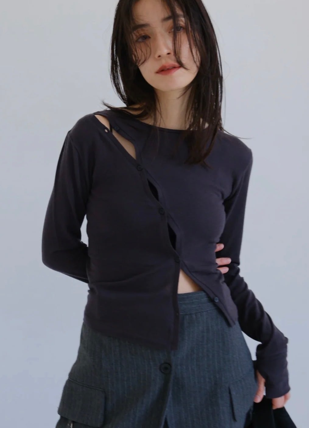 前身頃に配置した斜め開きのデザインがアクセントとなり、シンプルながらもモードなニュアンスを漂わせる一枚。浅めのボートネック風ラインがデコルテを美しく際立たせ、女性らしい印象を引き立てます。袖口には指空きのディテールを配置し、さりげない抜け感をプラス。やや短めの着丈は全体のバランスを取りやすく、スカートにもパンツにもスタイリングしやすいのが特徴。トップスとしてはもちろん、ジャケットのインナーとしても取り入れやすいデザインで、日常のスタイリングに洗練された表情を添えてくれるアイテムです。