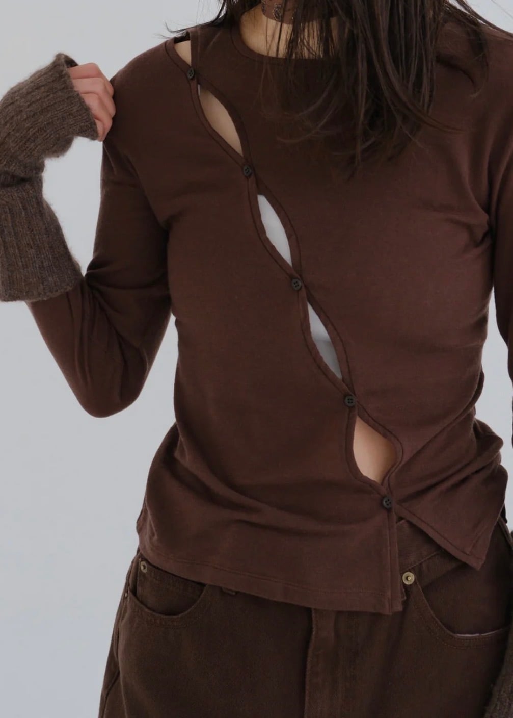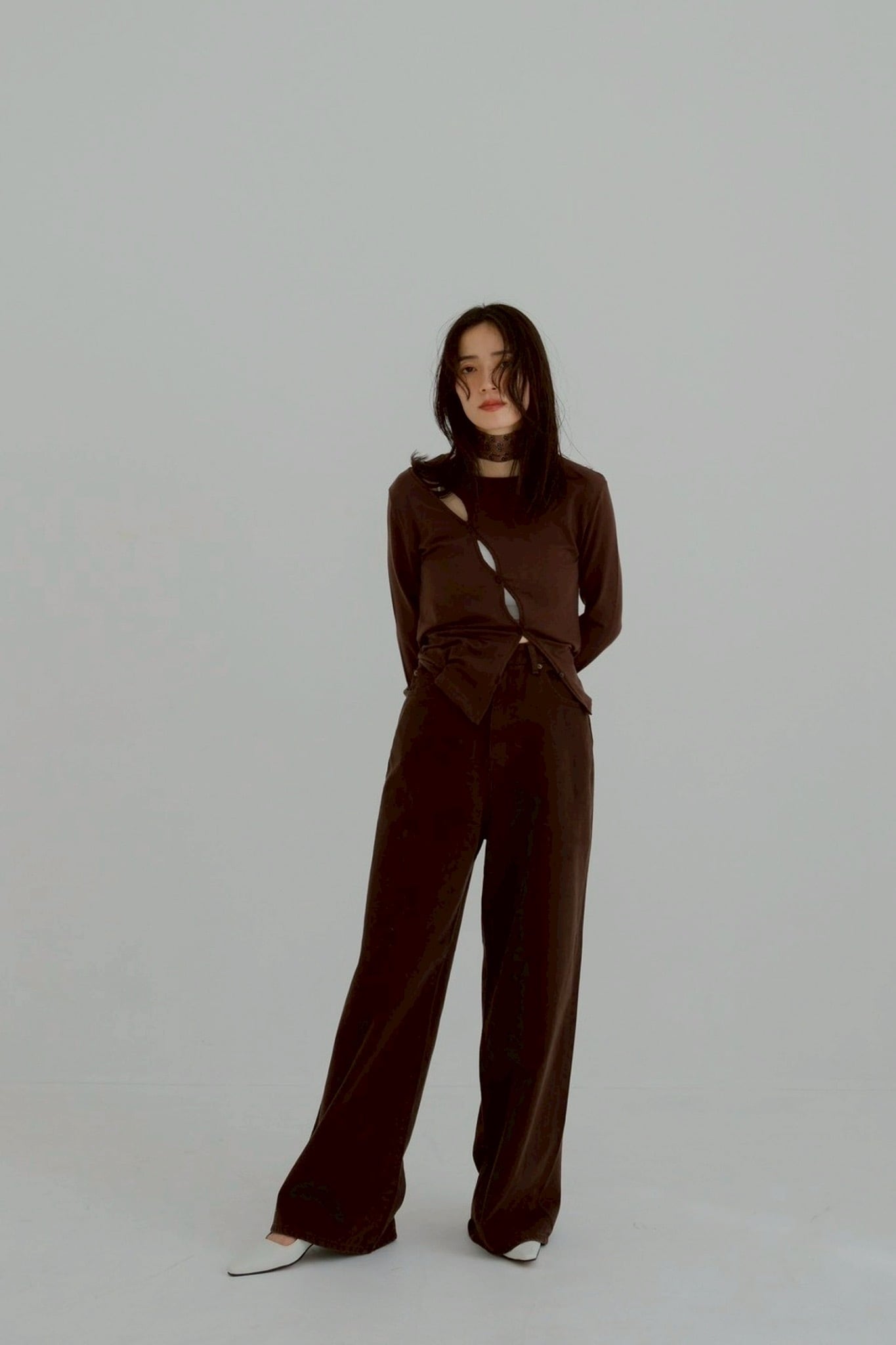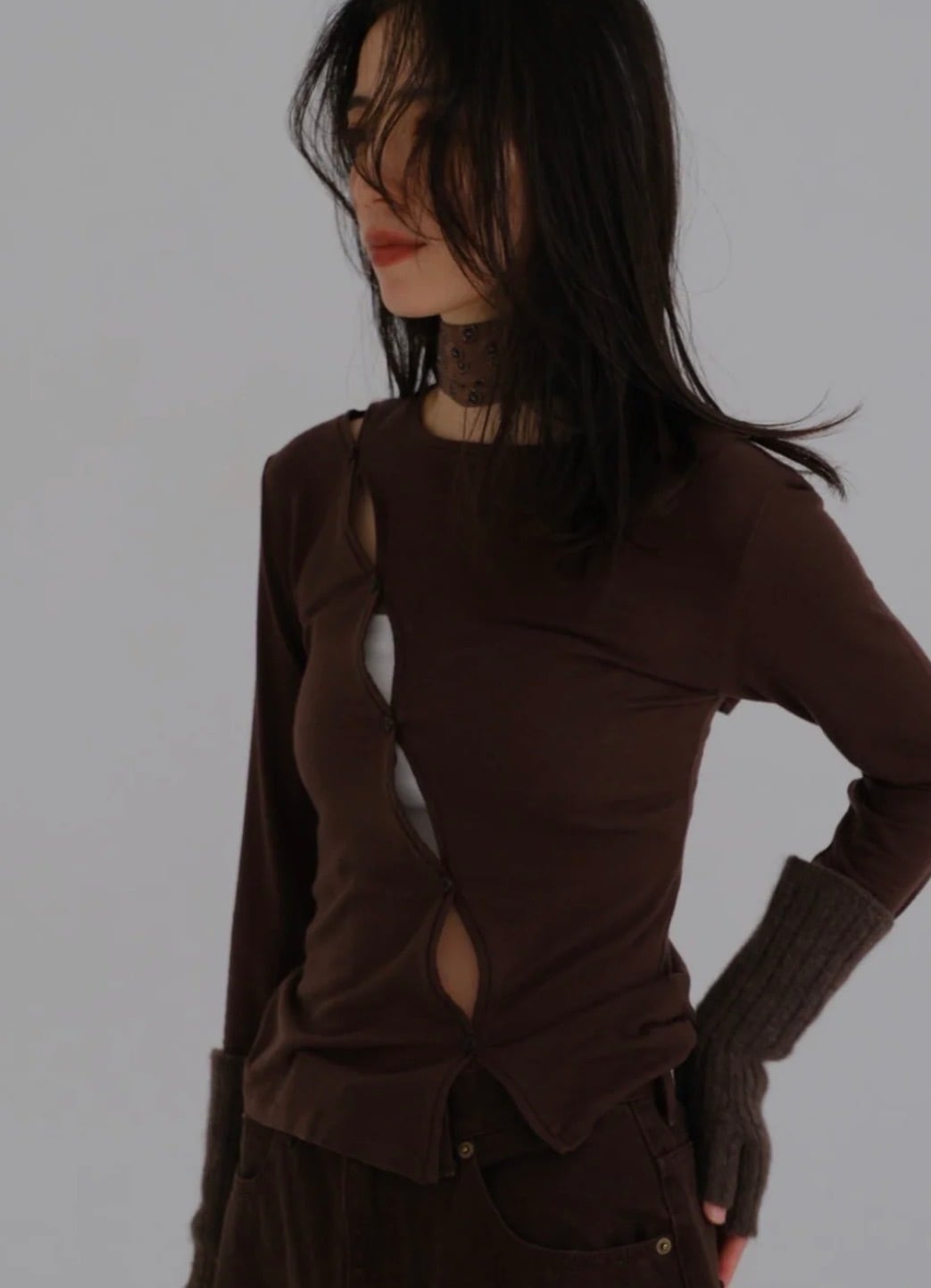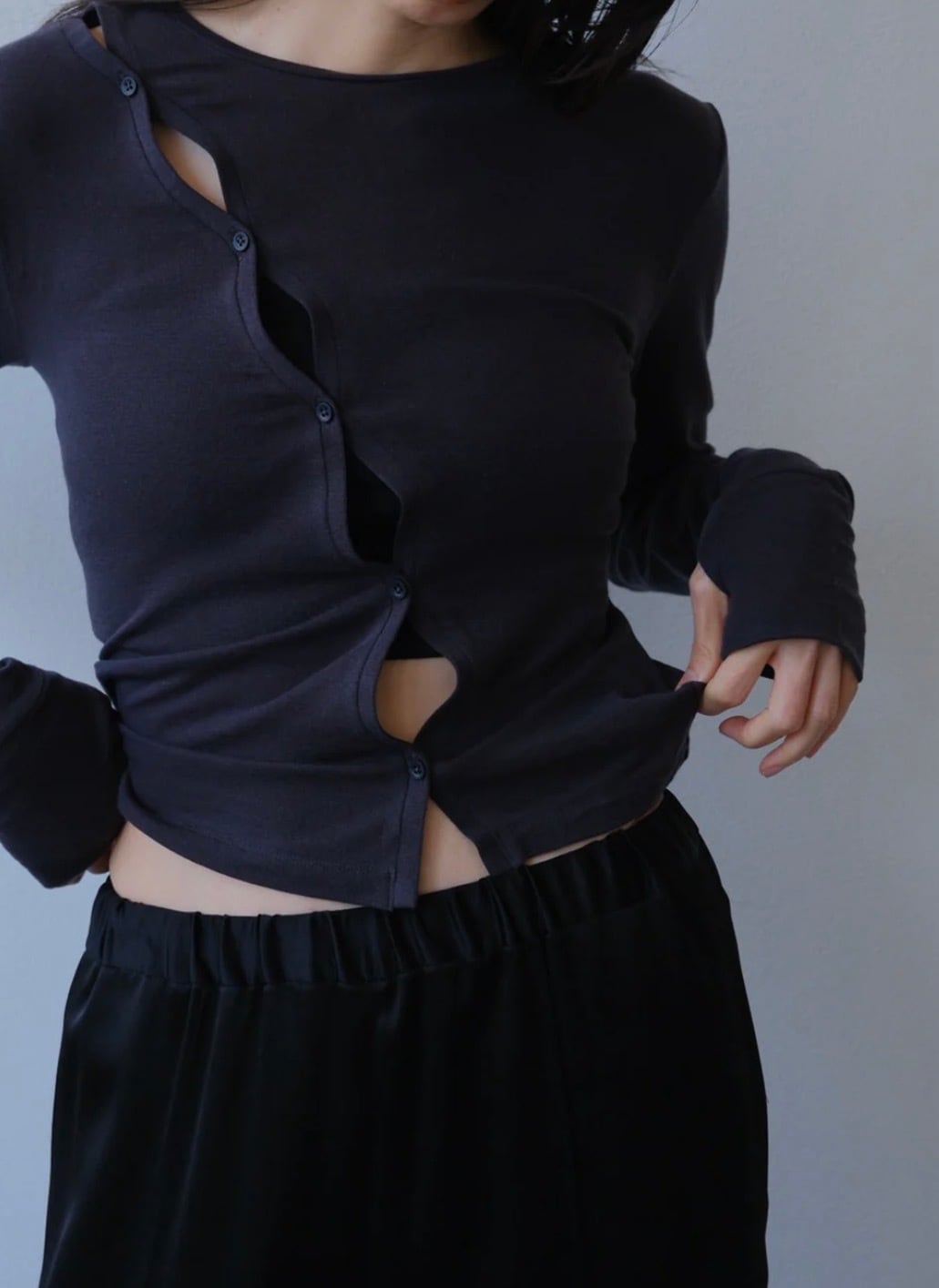前身頃に配置した斜め開きのデザインがアクセントとなり、シンプルながらもモードなニュアンスを漂わせる一枚。浅めのボートネック風ラインがデコルテを美しく際立たせ、女性らしい印象を引き立てます。袖口には指空きのディテールを配置し、さりげない抜け感をプラス。やや短めの着丈は全体のバランスを取りやすく、スカートにもパンツにもスタイリングしやすいのが特徴。トップスとしてはもちろん、ジャケットのインナーとしても取り入れやすいデザインで、日常のスタイリングに洗練された表情を添えてくれるアイテムです。