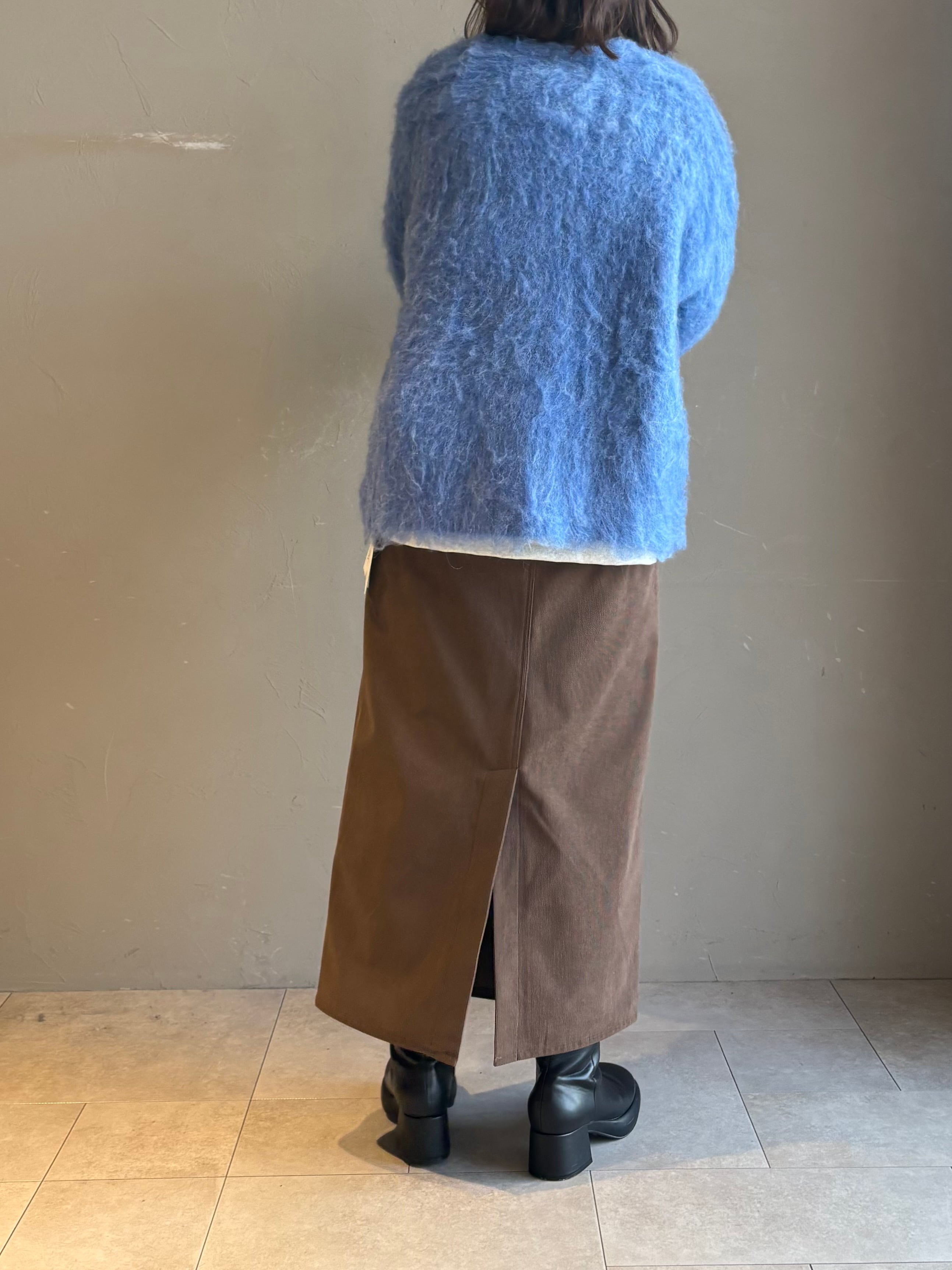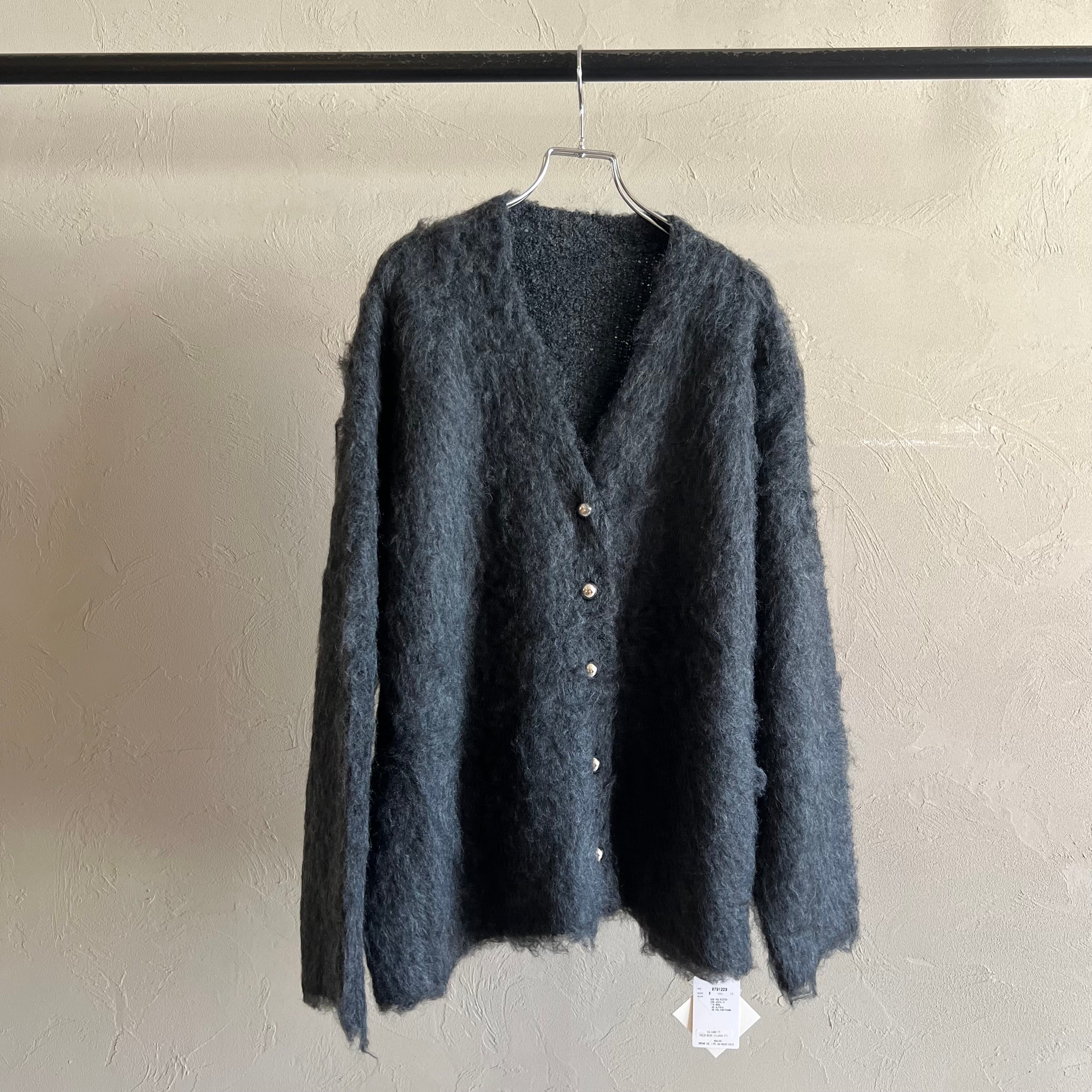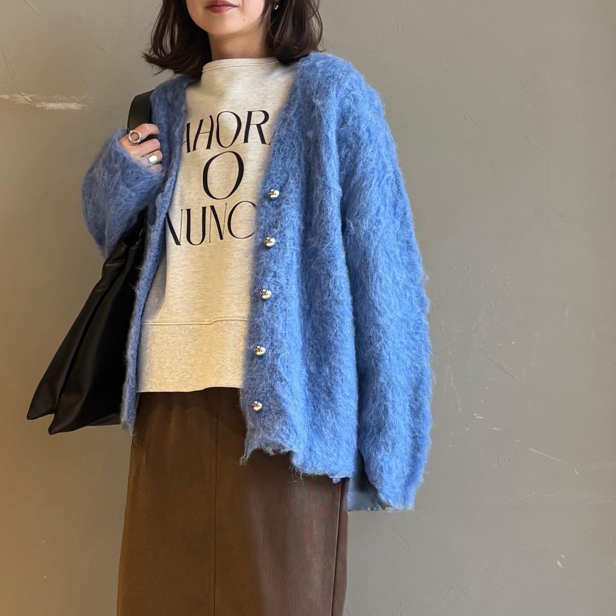 毛足のあるニットをブラッシング加工というものを施し、より温かみとこなれ感をUPさせたニットカーディガンです。