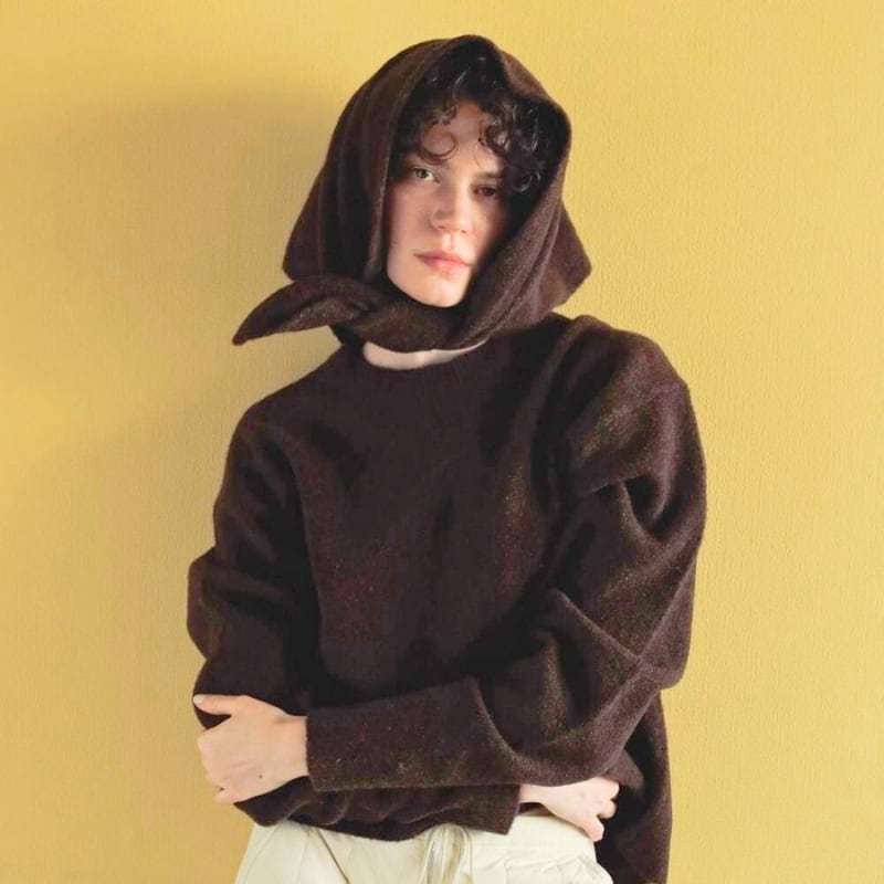 プルオーバーと同じ編み地の三角スカーフ付き。スカーフは、肩に掛けたり、頭に巻いたり、色んなアレンジをお楽しみいただけます。
