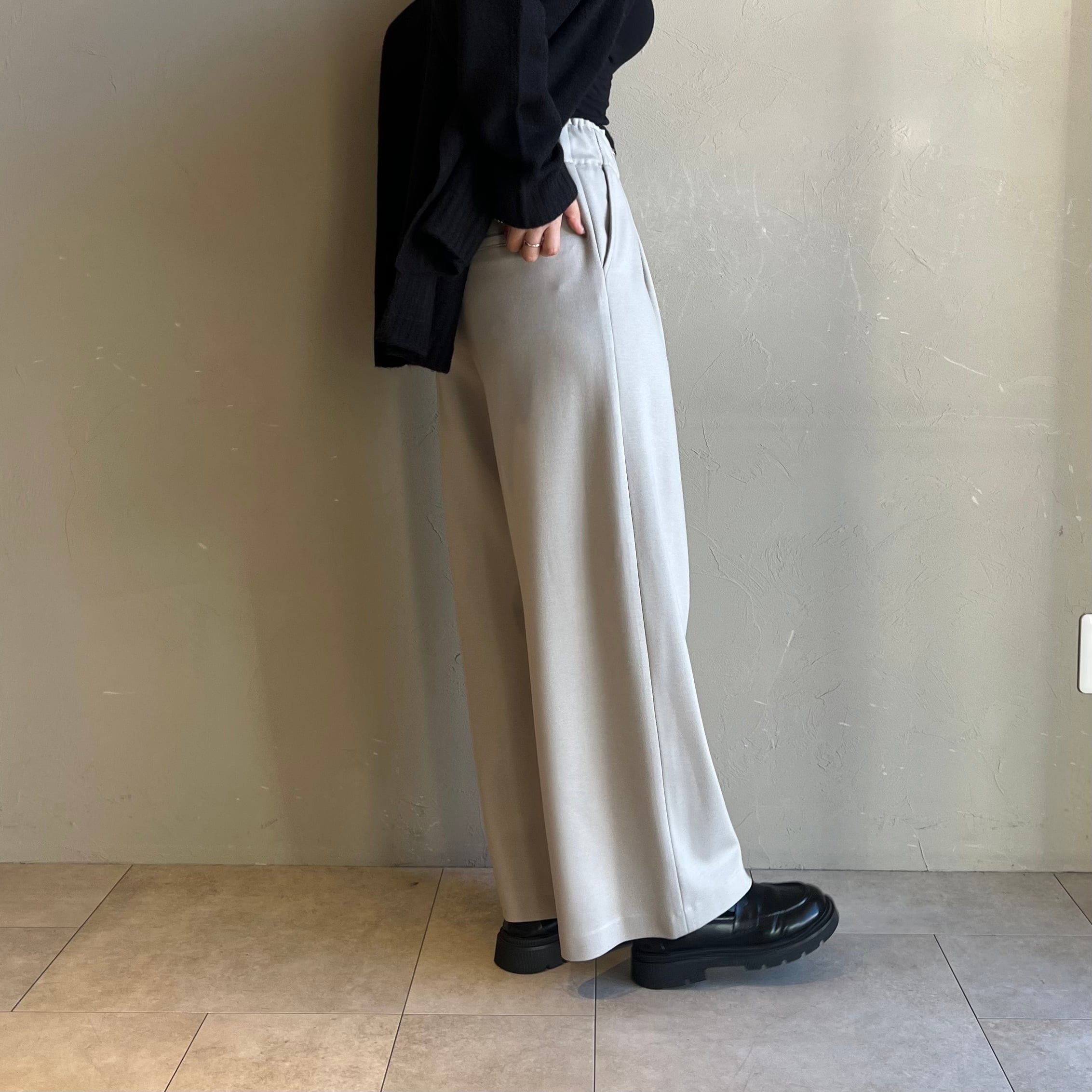 外気が肌寒い時期でも、心地よい温かさを持続させますが、ハリ感と柔らかさがあり、落ち感のあるストレッチ抜群のジャージ素材のストレッチワイドパンツです。