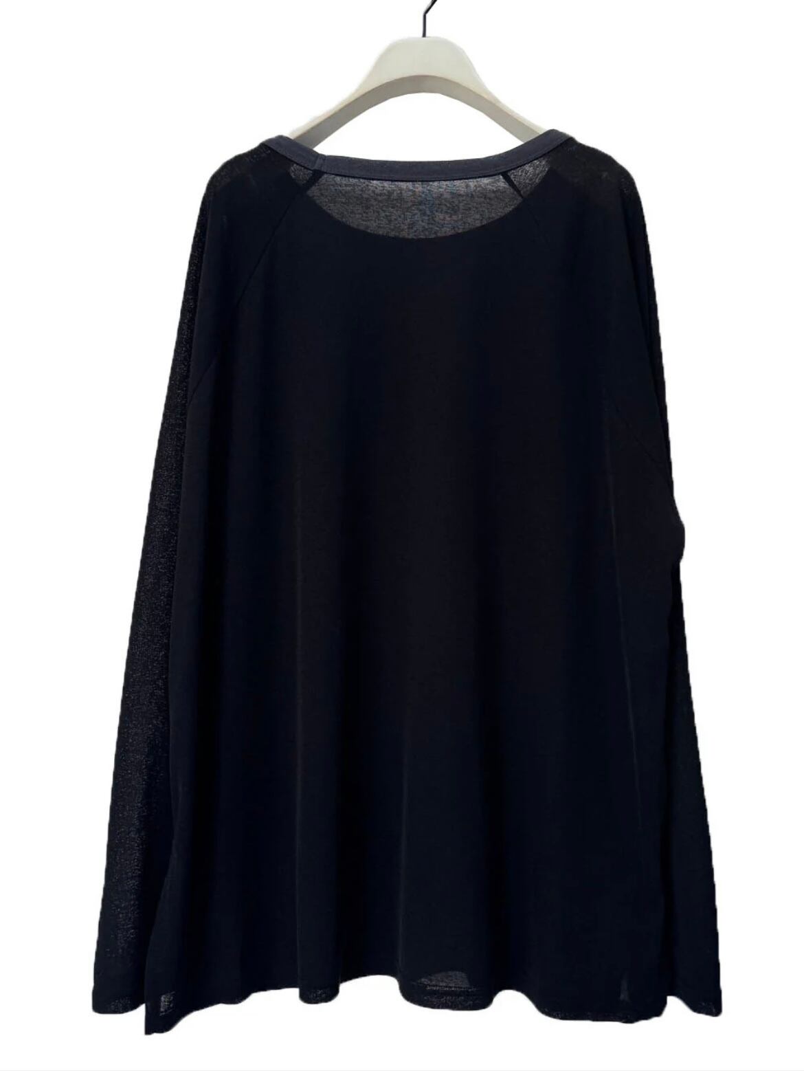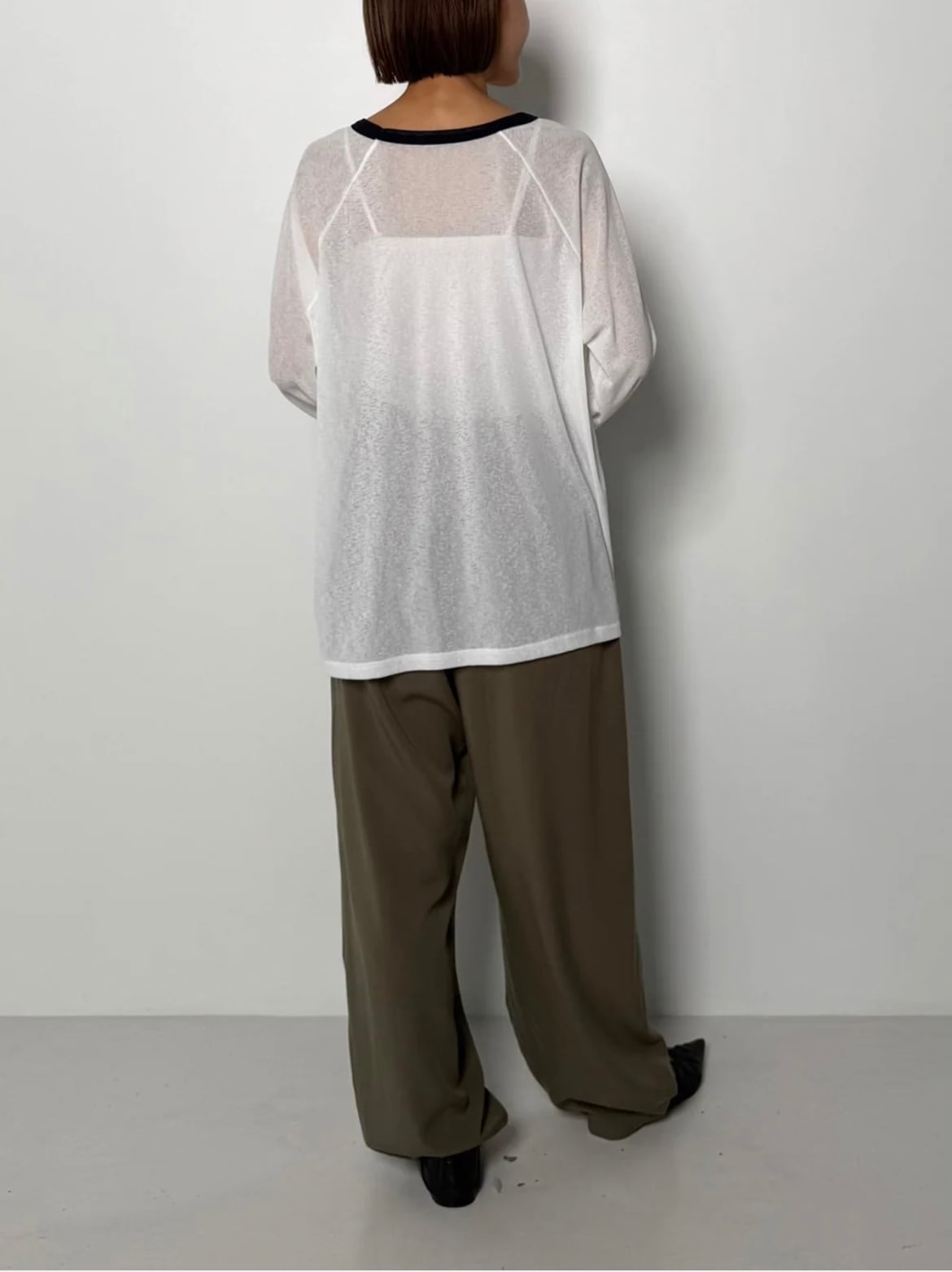 シャツやジャケットのインナーとしてレイヤードスタイルもおすすめですが、1枚着でも季節の端境期に使用できる万能アイテムです。