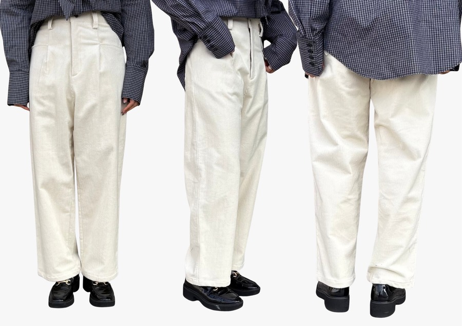 【MARGAUX VINTAGE】のコーデュロイパンツは、ふんわりとした畝感と上品なオフホワイトが魅力。