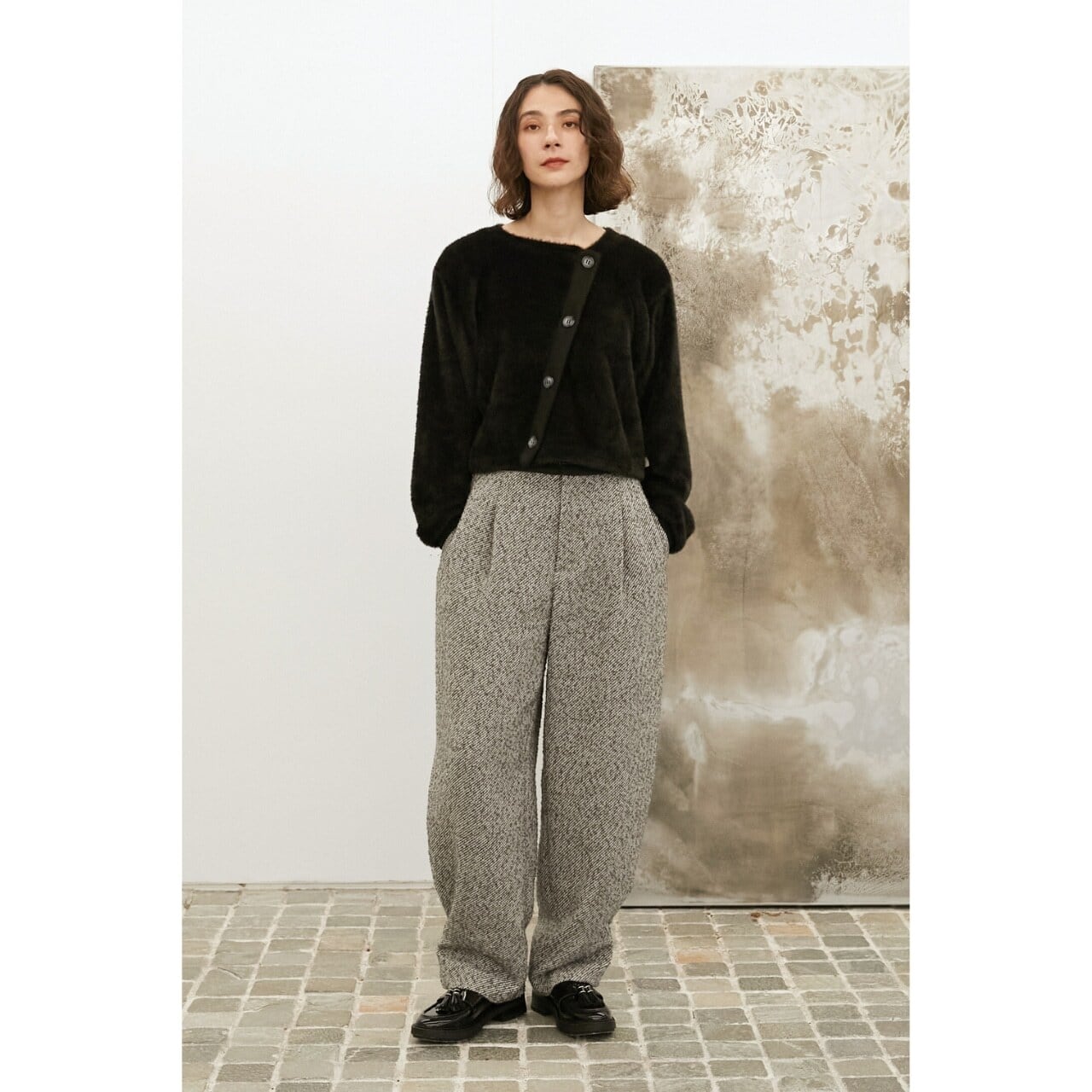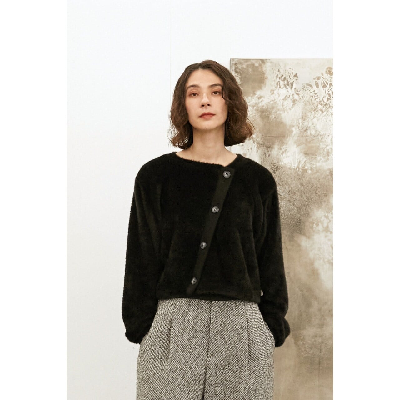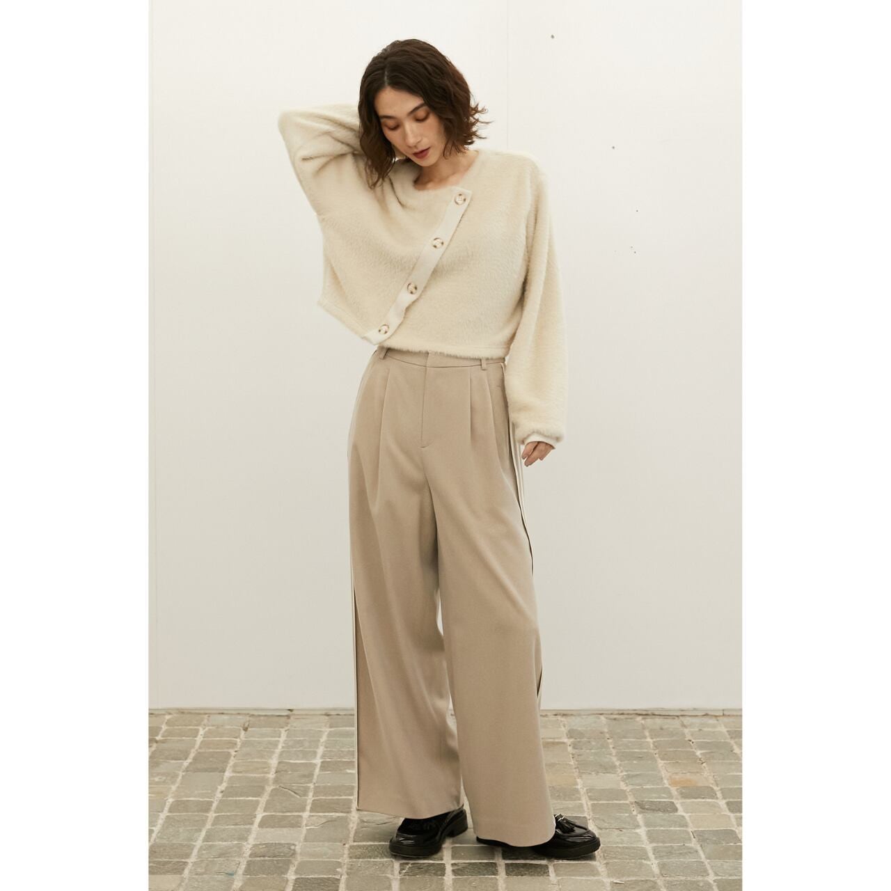 絶妙な丈感で、スカートにもパンツにも合わせやすく、バランスの取れた1枚です。