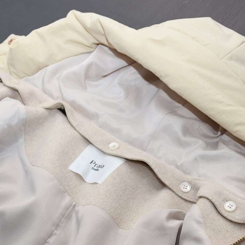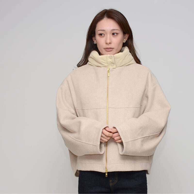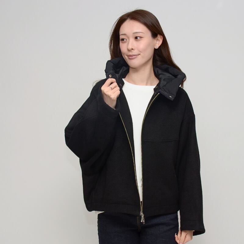中綿フードは取り外し可能で、取り外せば上品なノーカラーコートに早変わり。