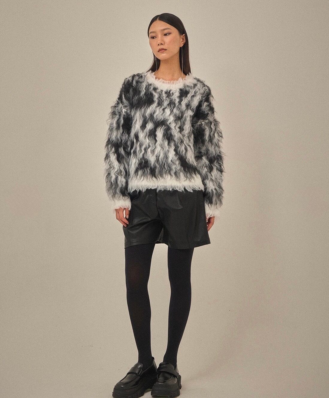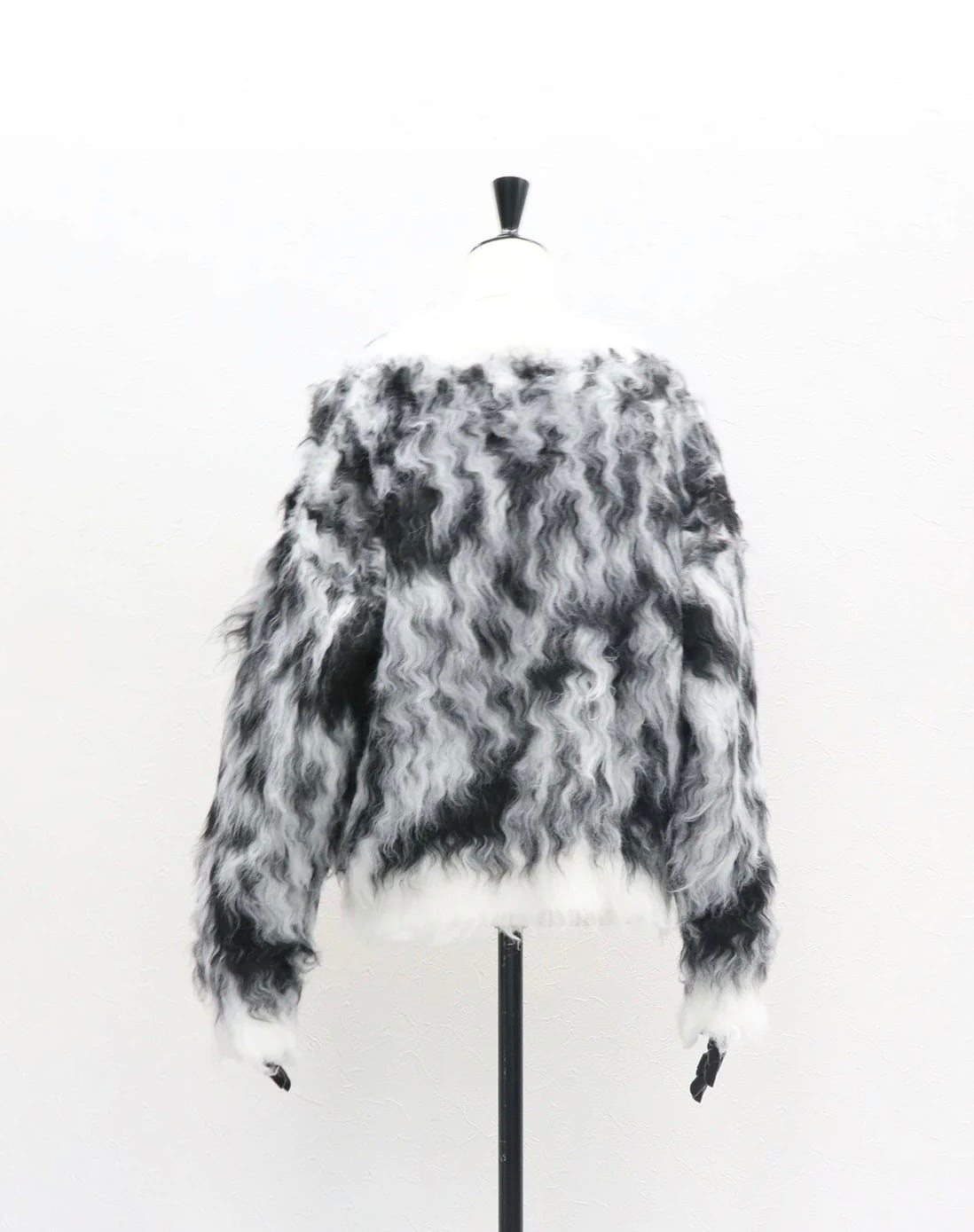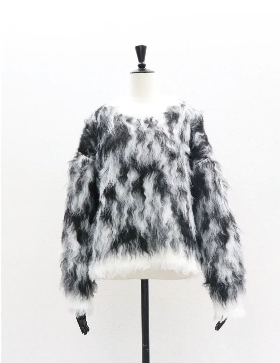 毛足の長い犬の柔らかな被毛をイメージした、ふんわりとしたファジーニット。波打つようにランダムに流れる編み地が、どの角度から見ても動きと立体感を生み出し、見る人の視線を惹きつけます。ウールを含んだふっくらとした肌触りは、軽やかなのにしっかりと暖かく、寒さから優しく身体を包み込みます。纏うだけでスタイルに奥行きをもたらす、アニマルスピリットを秘めた個性的な一着です。
