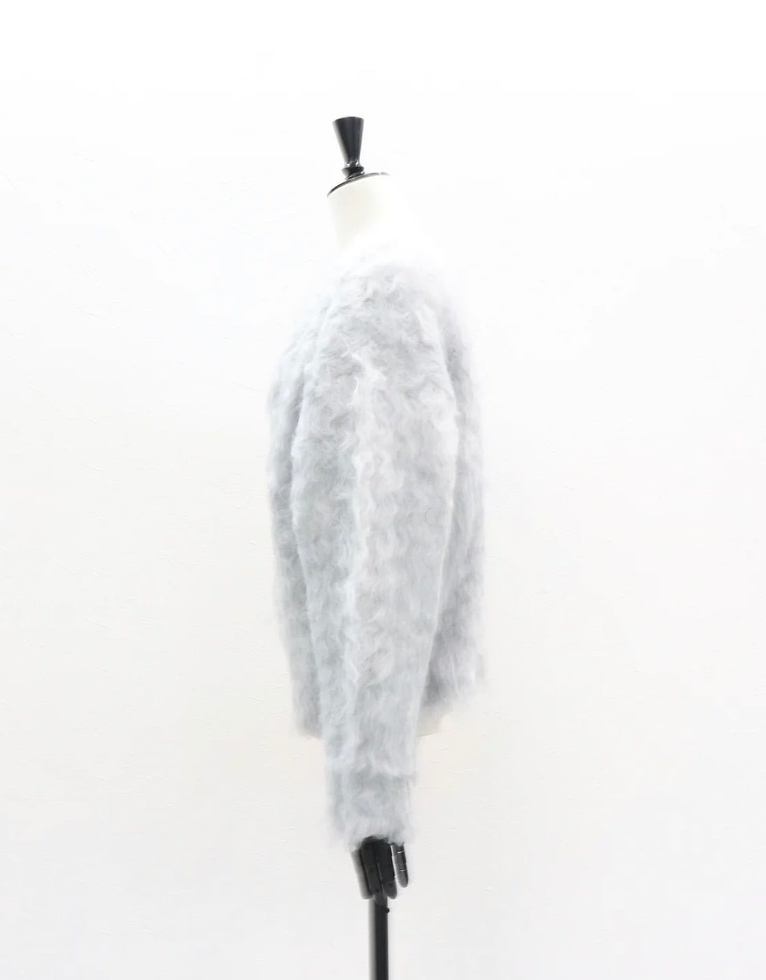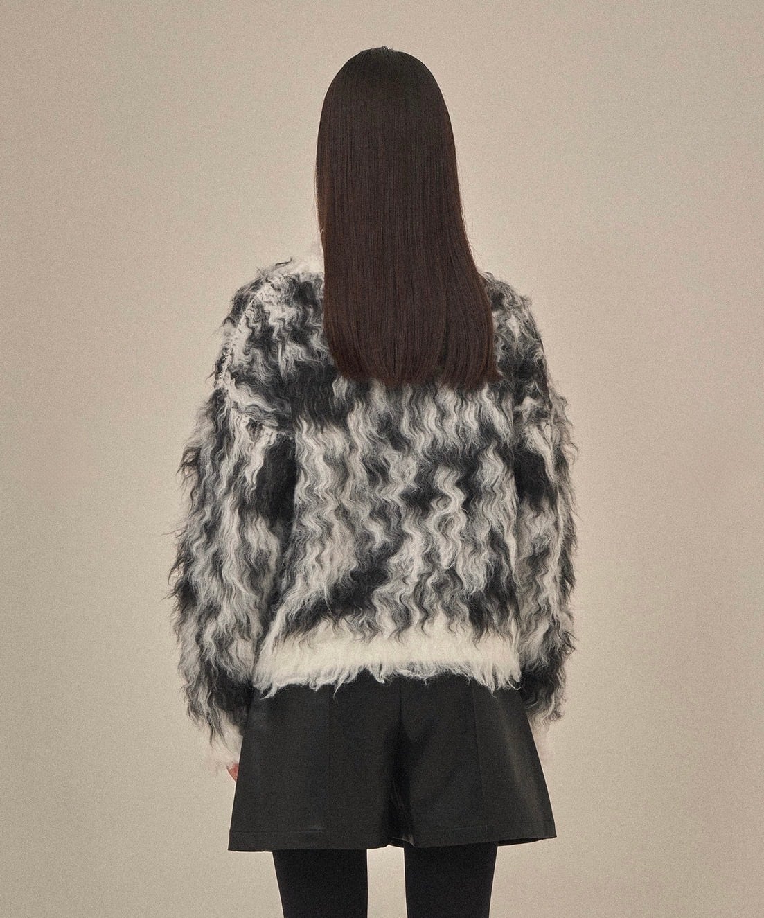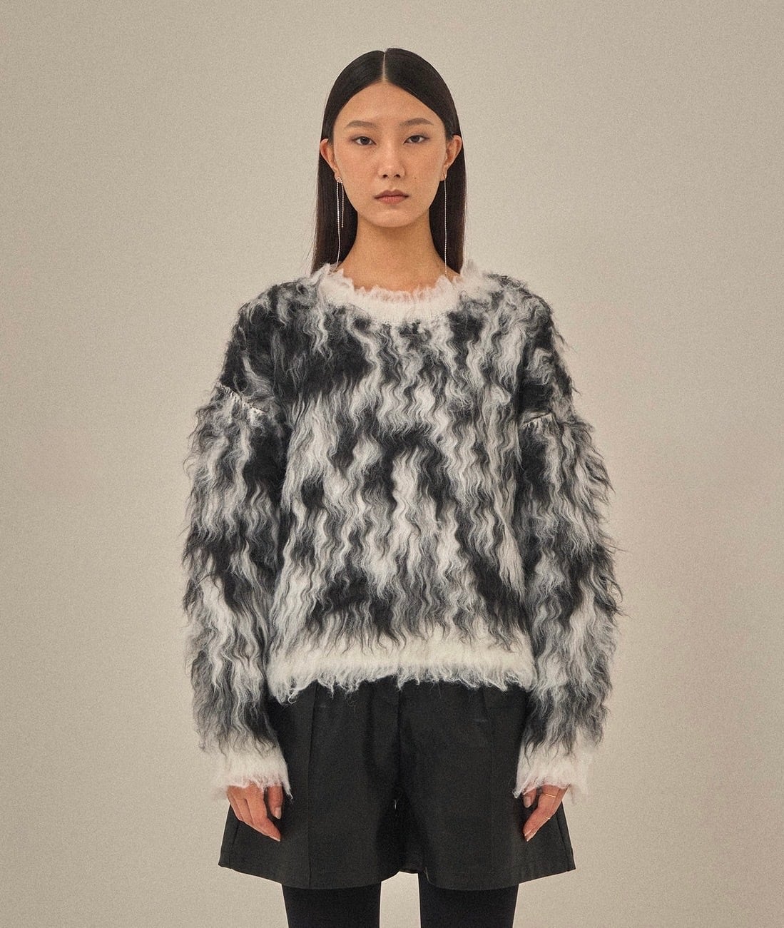 毛足の長い犬の柔らかな被毛をイメージした、ふんわりとしたファジーニット。波打つようにランダムに流れる編み地が、どの角度から見ても動きと立体感を生み出し、見る人の視線を惹きつけます。ウールを含んだふっくらとした肌触りは、軽やかなのにしっかりと暖かく、寒さから優しく身体を包み込みます。纏うだけでスタイルに奥行きをもたらす、アニマルスピリットを秘めた個性的な一着です。