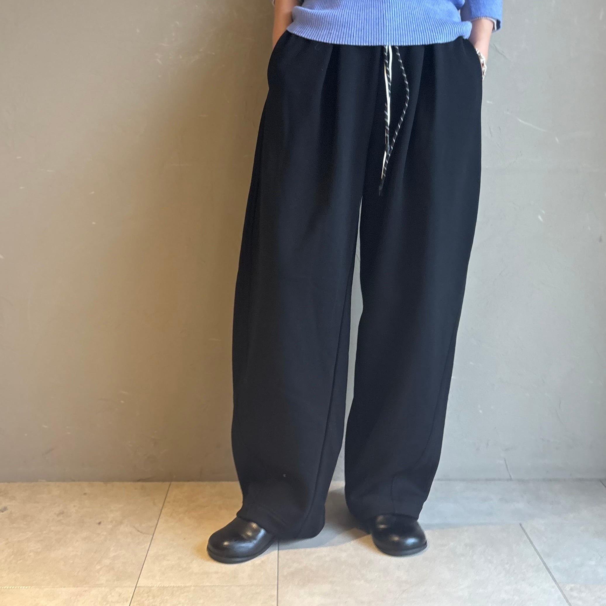 立体的なカーブシルエットで脚のラインを拾わず、腰まわりはゆったり、裾に向かってすっきり細見え。