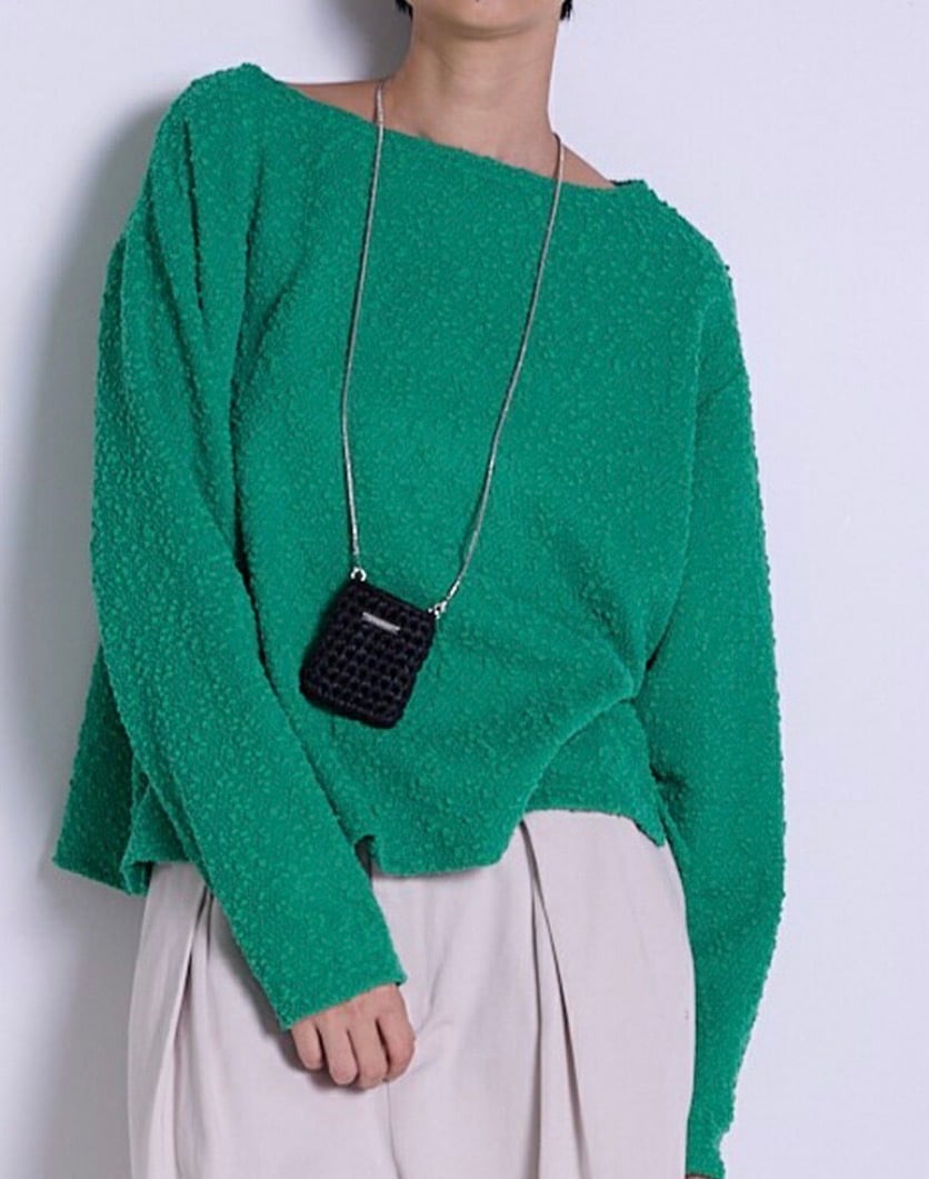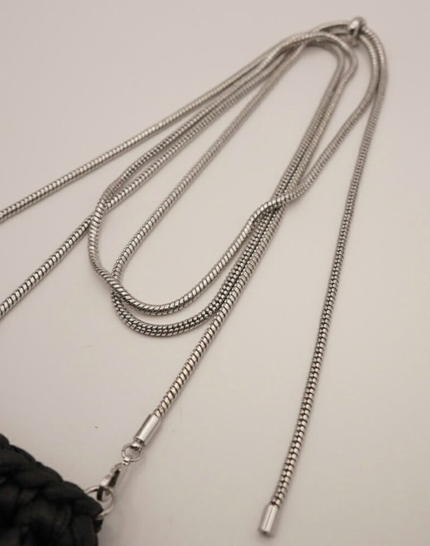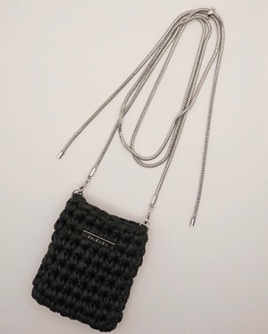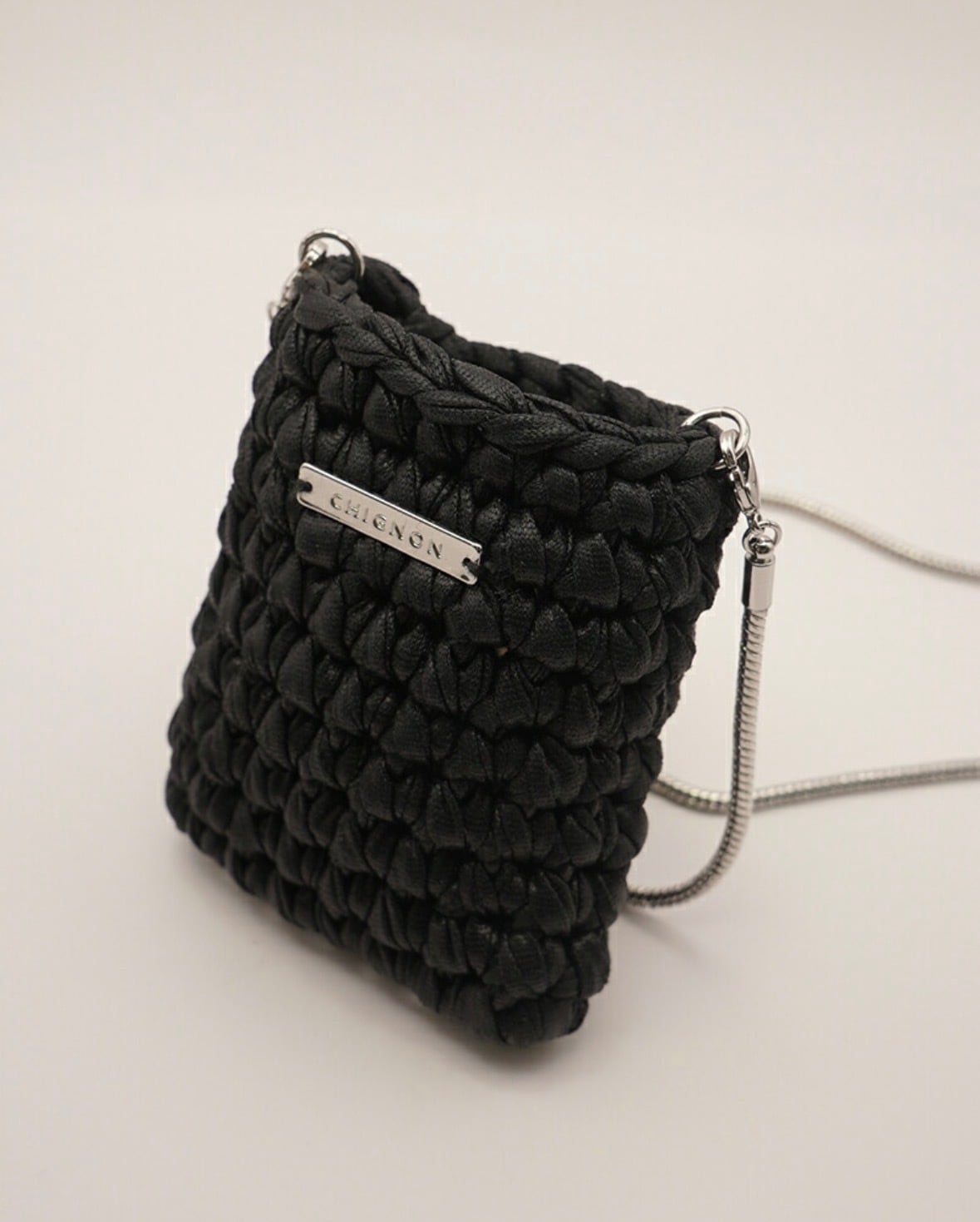 小ぶりなサイズ感が目を引くチェーン付ミニバッグはハンドメイドで一つ一つ編み込み、サイズ調節可能なチェーン付となっております。リップやロールオン香水、ネイルオイルなど細長いコスメアイテムを数本入れることが可能となっております。(ちょっとした小物やミントタブレットなども)着け方はショルダーにしたり首にかけたり手で持ったりと、シンプルなコーデのアクセントとしてアクセサリー感覚に愉しめるアイテムとなっております。チェーンのみ外してお手持ちのスマホケースに付ける事も可能です。長方形プレートには「CHIGNON」の刻印入り。こちらのBAGはハンドメイドの為、5mm〜1cm前後の個体差が生じます。予めご了承下さい。