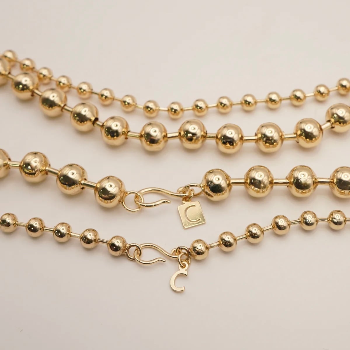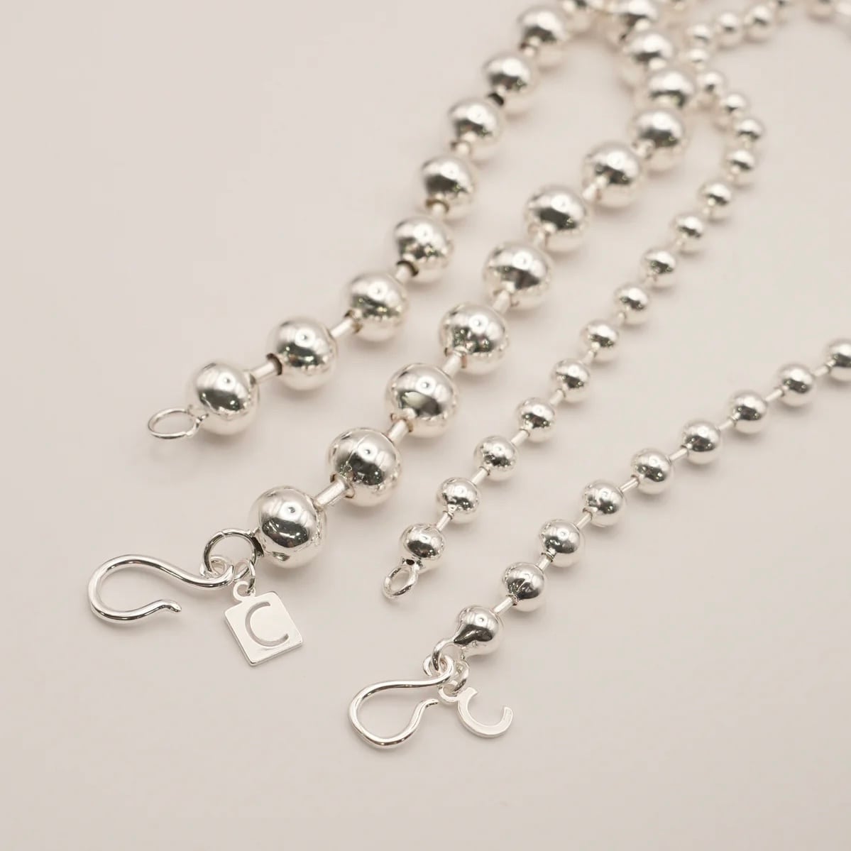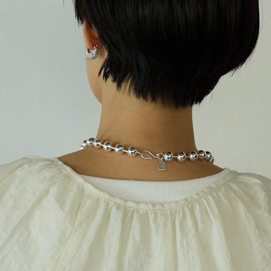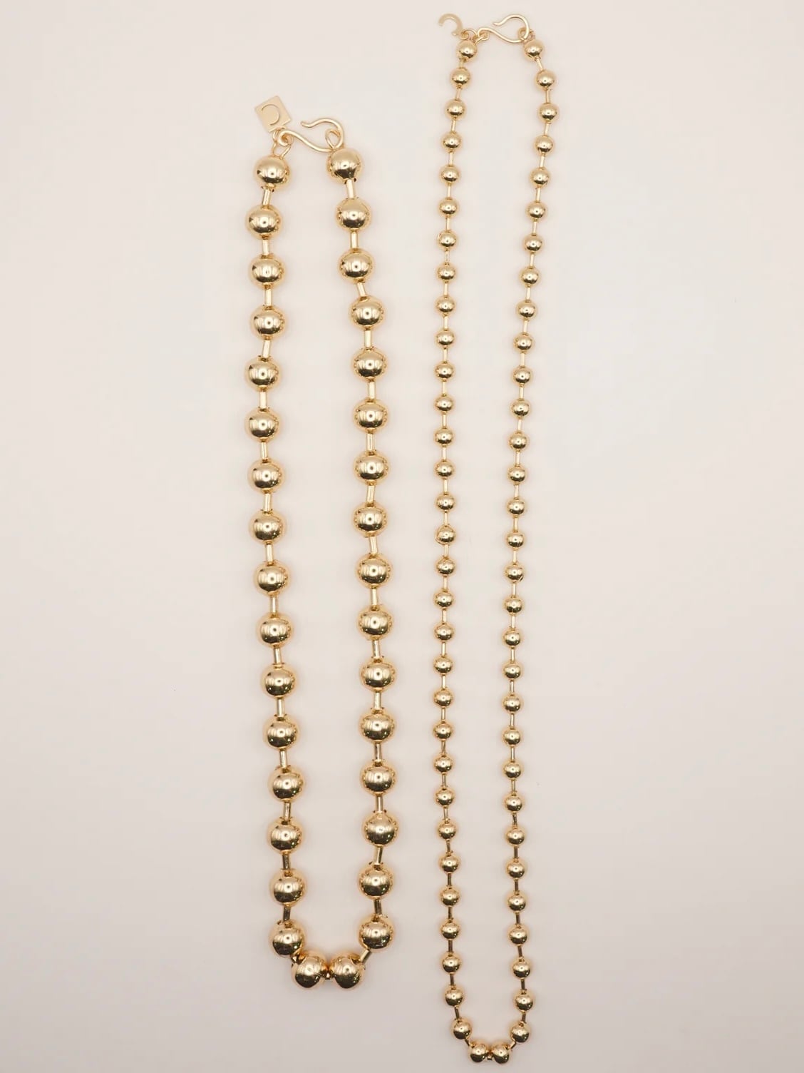 10mm玉のボールチェーンと6mm玉のボールチェーンの2本セットネックレスになります。存在感のあるボールチェーンはどんなコーディネートにも合わせやすく、オールシーズン愉しめるアイテムです。フックはCHIGNONオリジナルで、ボールチェーンのどこでも留められる仕様になっていますので長さ調節が可能です。2本重ねて着けたり、単体でつけたりと様々な着け方を愉しめます。それぞれのネックレスにはオリジナルのCチャーム付きで、シンプルながらも細部までこだわったネックレスとなっております。
