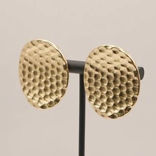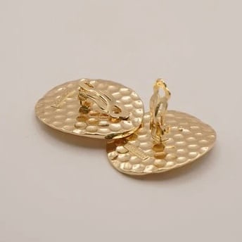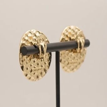 緩やかにカーブしたオーバルフォルムピアスは、オーバルの上下部分にだけ厚みを持たせた立体的なデザインとなっております。表面だけでなく裏面にも施された槌目(つちめ)加工は光を柔らかく反射し動くたびに陰影が付くので存在感も抜群◎キャッチは一体型なので着脱がスムーズにできるのもポイントです。普段のコーデのアクセントとしてはもちろん、結婚式やパーティーなどのオケージョンシーンにもぴったりなアイテムとなっております。背面には「CHIGNON」の刻印入り。
